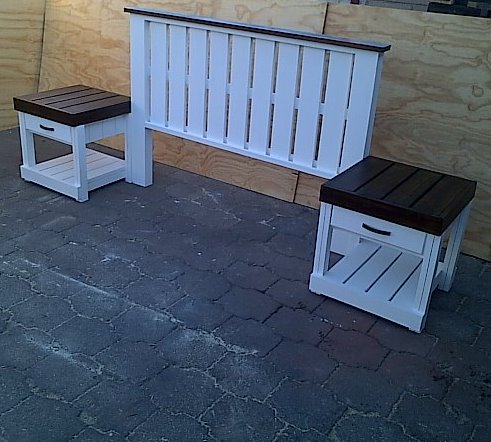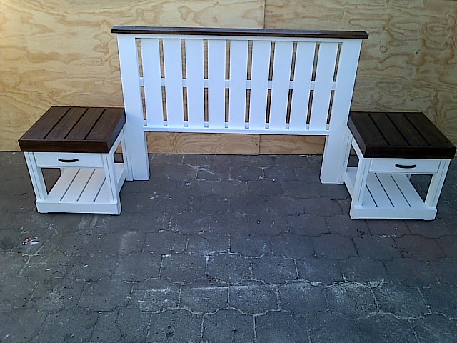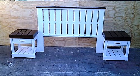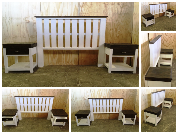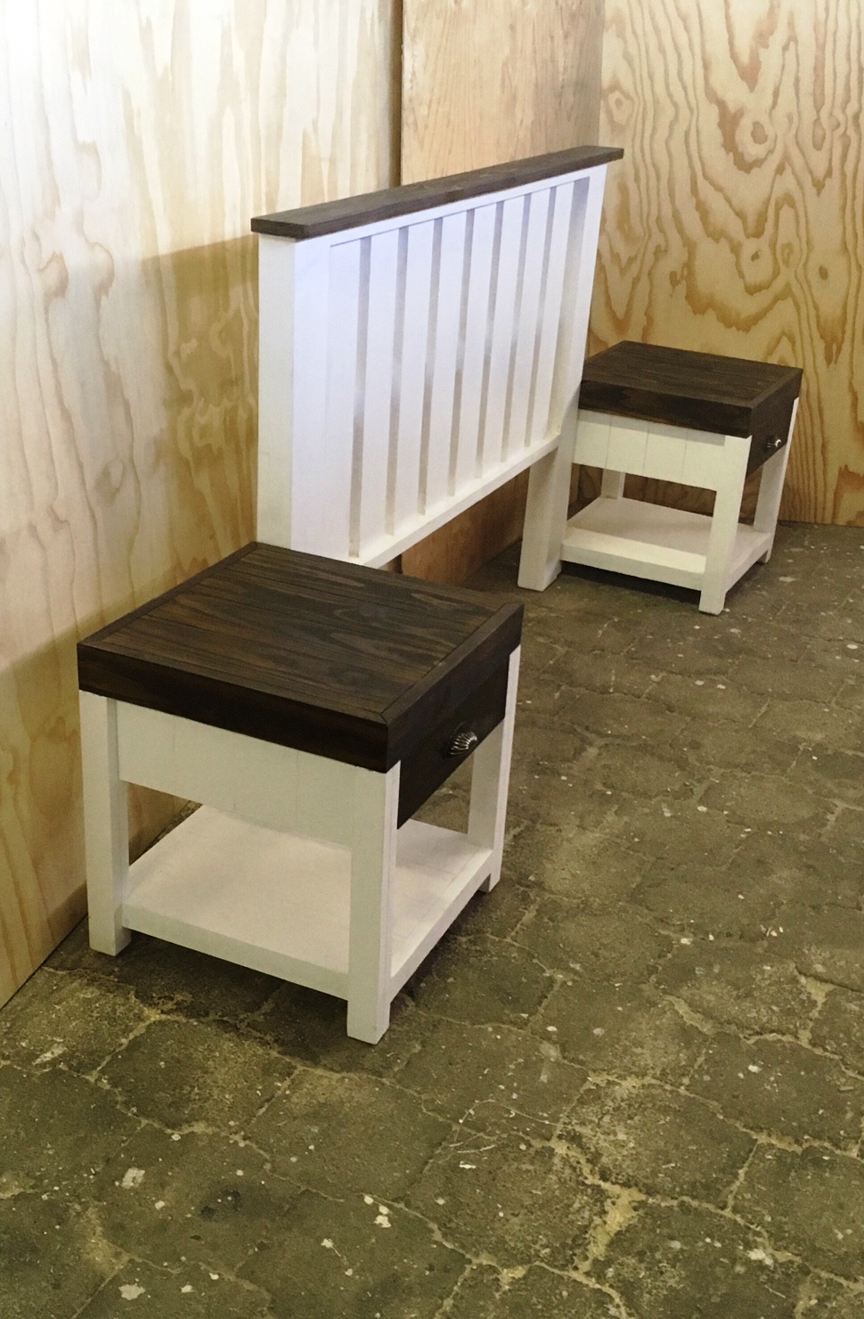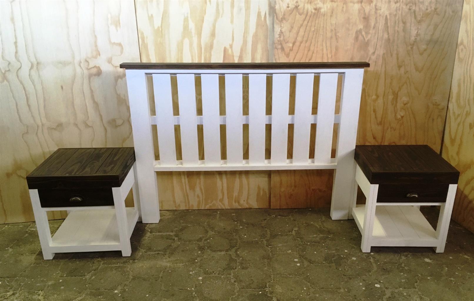 This beautiful brown stained top and white washed body Queen size headboard combo consists of a Headboard and two Night stands with single drawers. It is very popular with the younger generation and will light up any bedroom