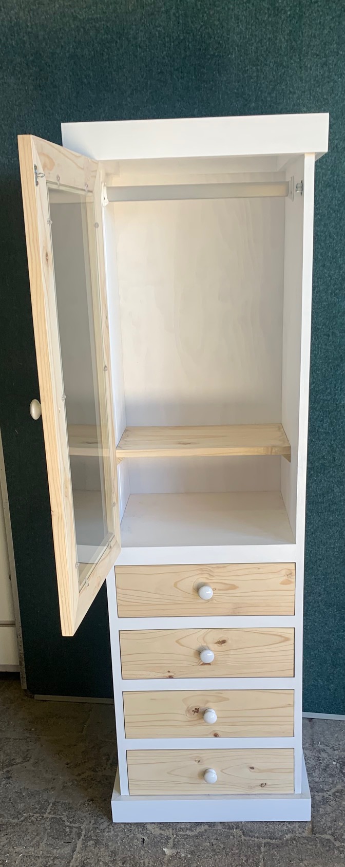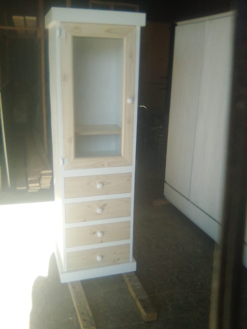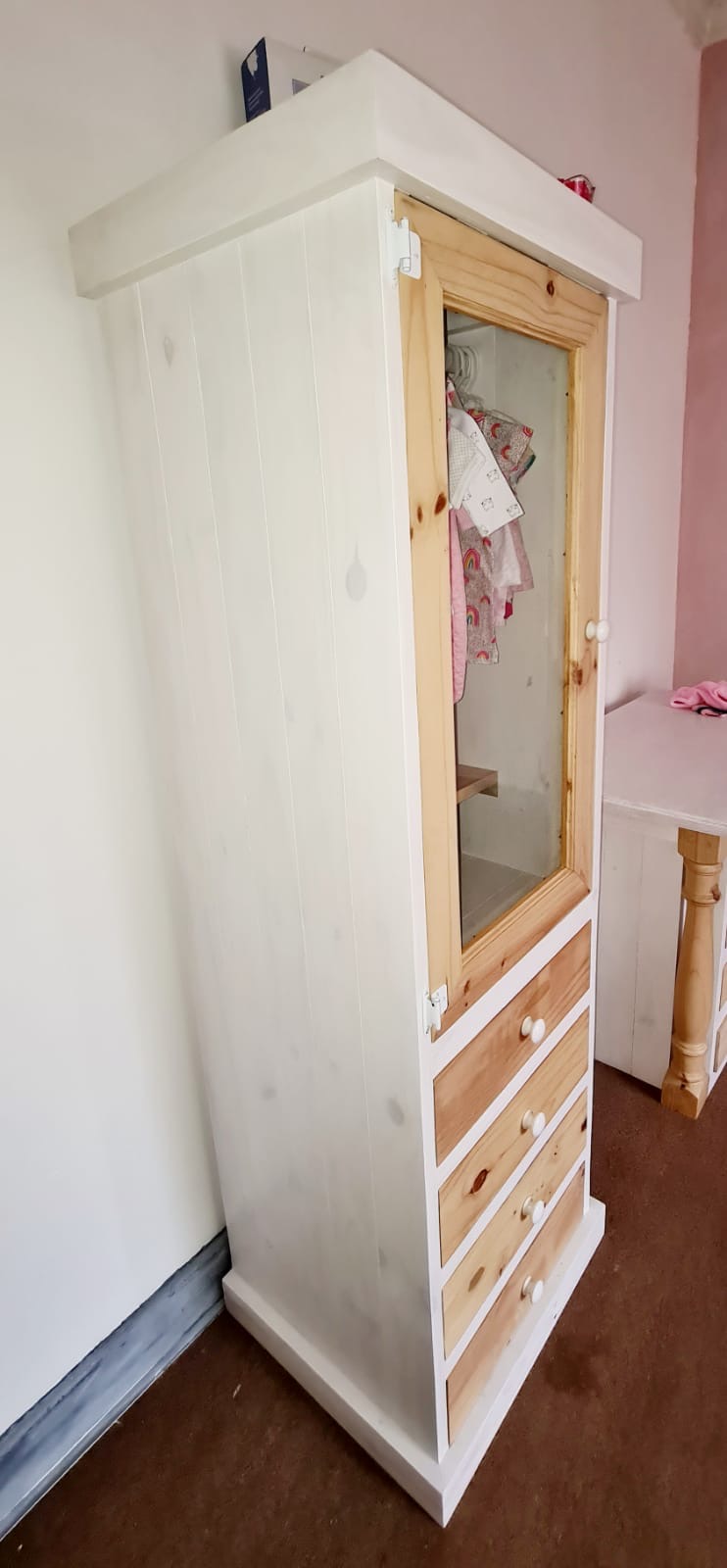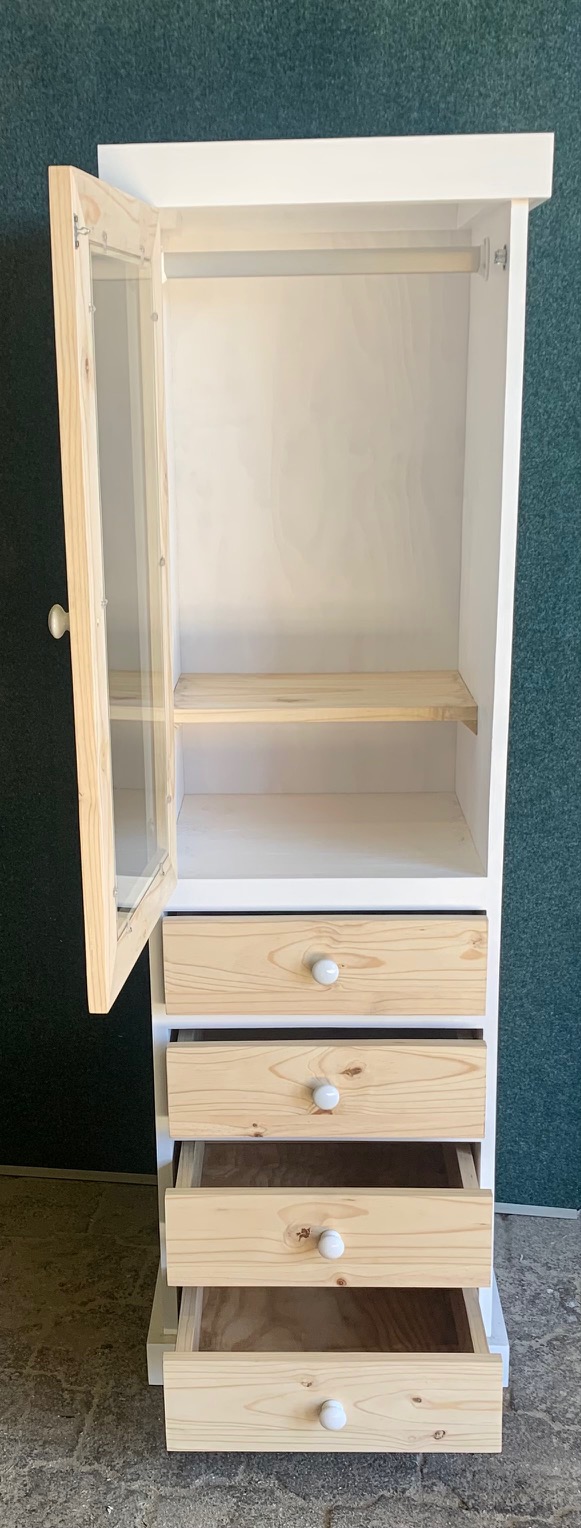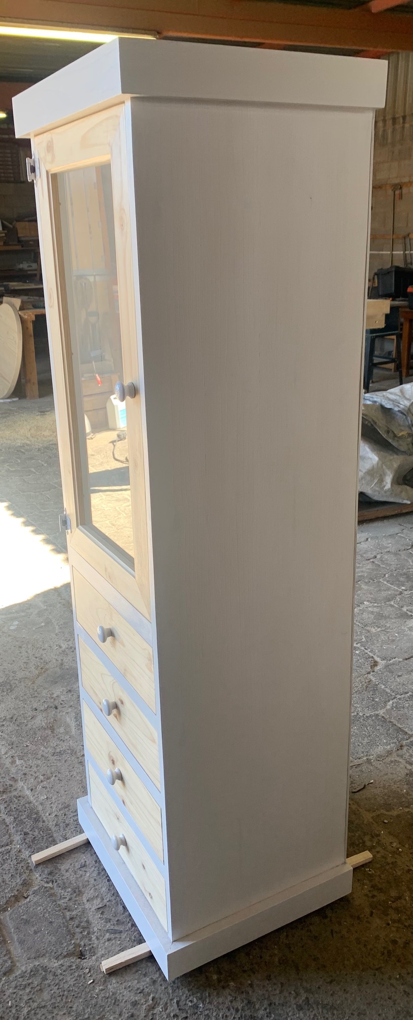 This beautiful and attractive piece is ideal for the Nursery. Very nice combo of a "Wardrobe" with drawers and top door with glass in a frame.