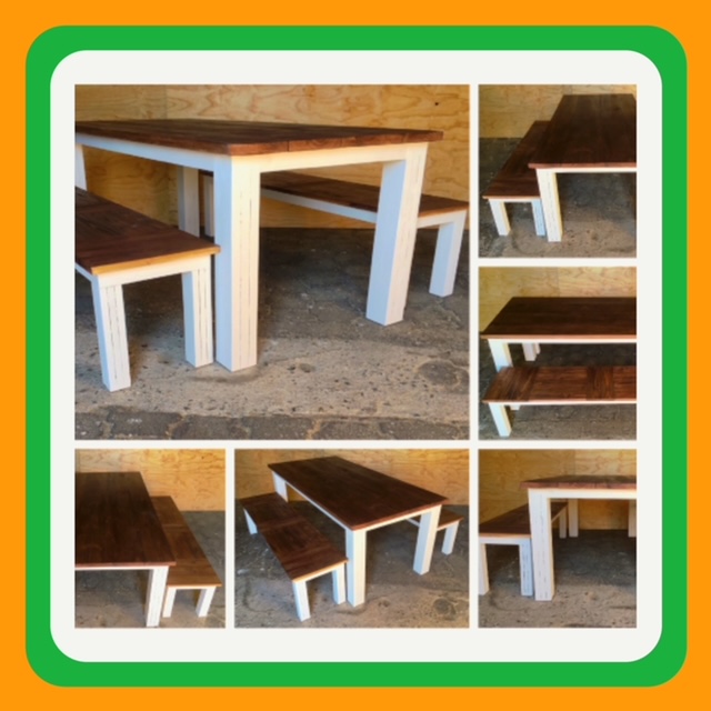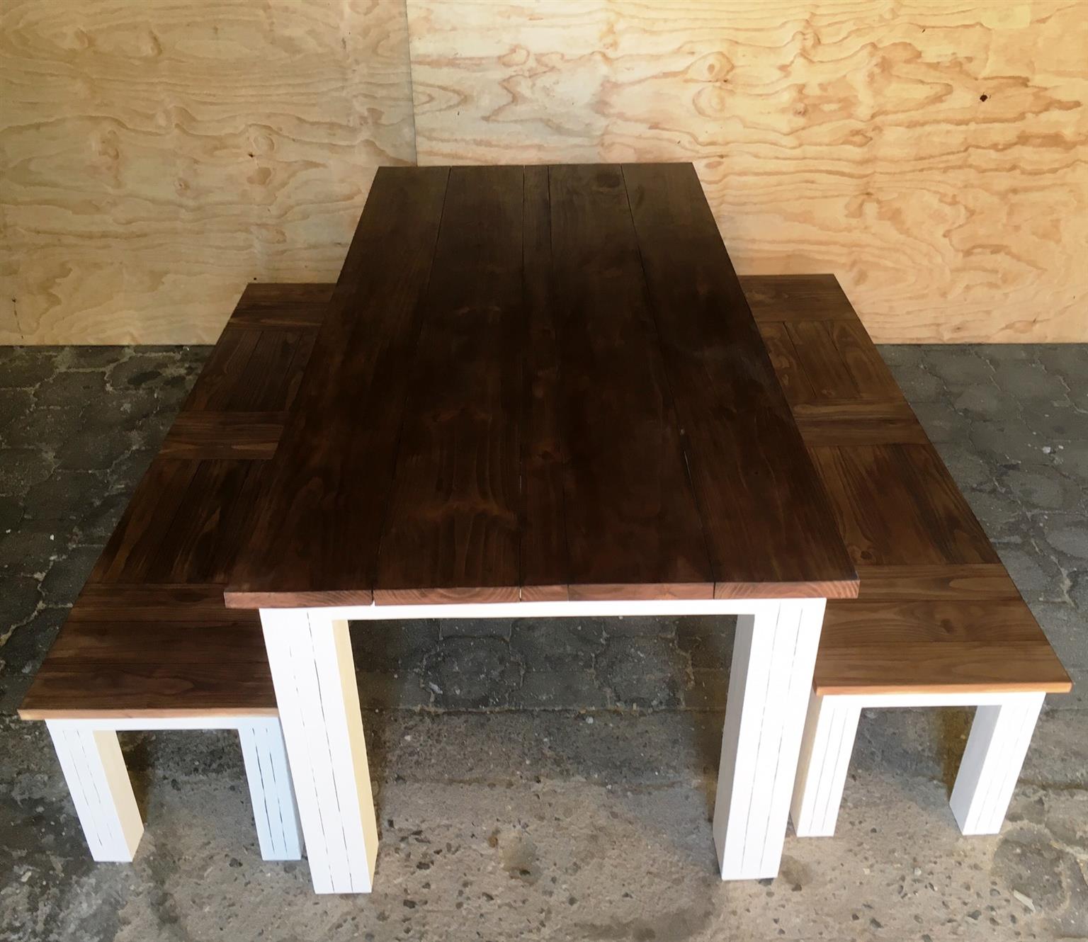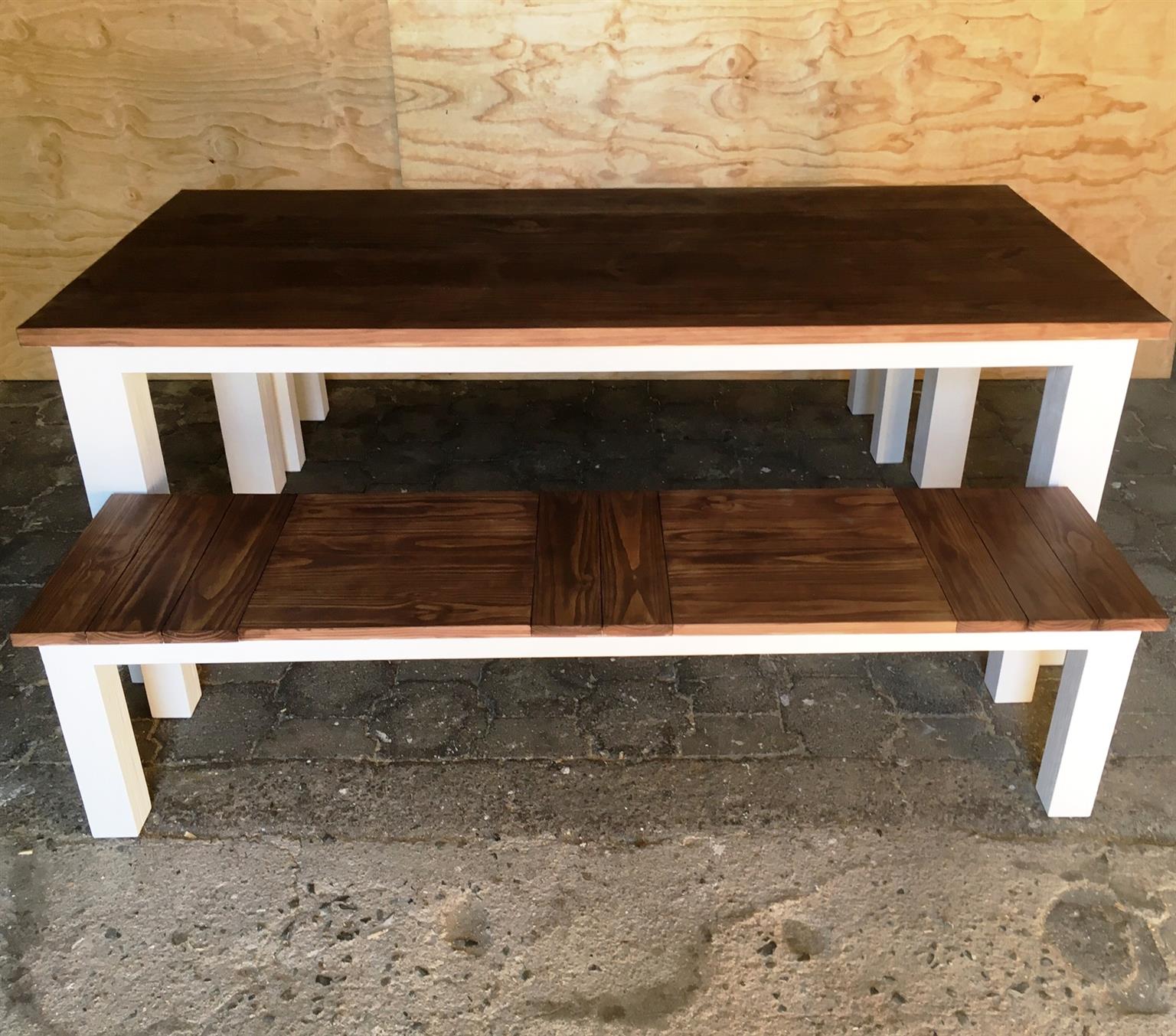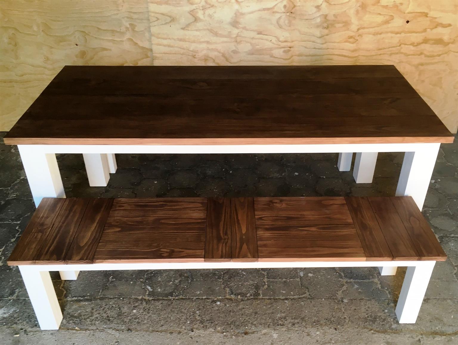 Beautiful hand-made 2-Toned table and bench combo. Seats 8 people. Can also be used in a dining-room
