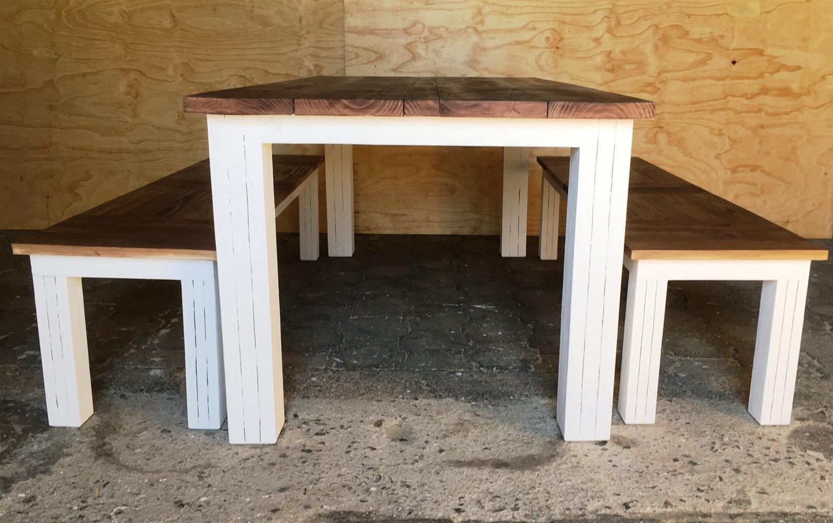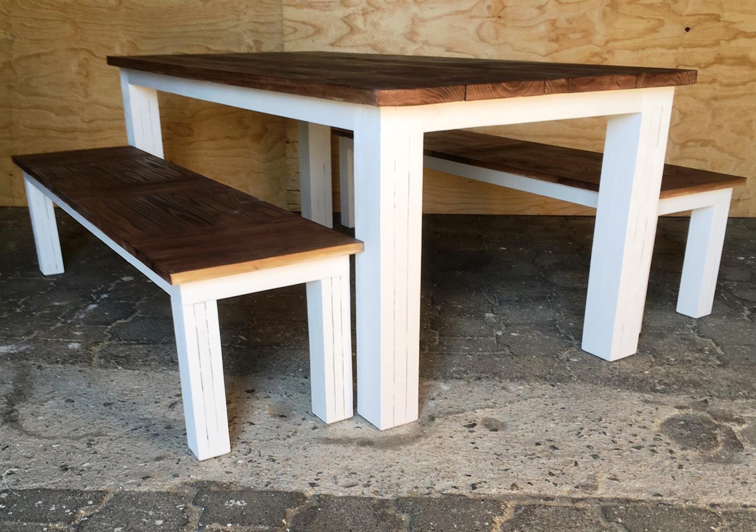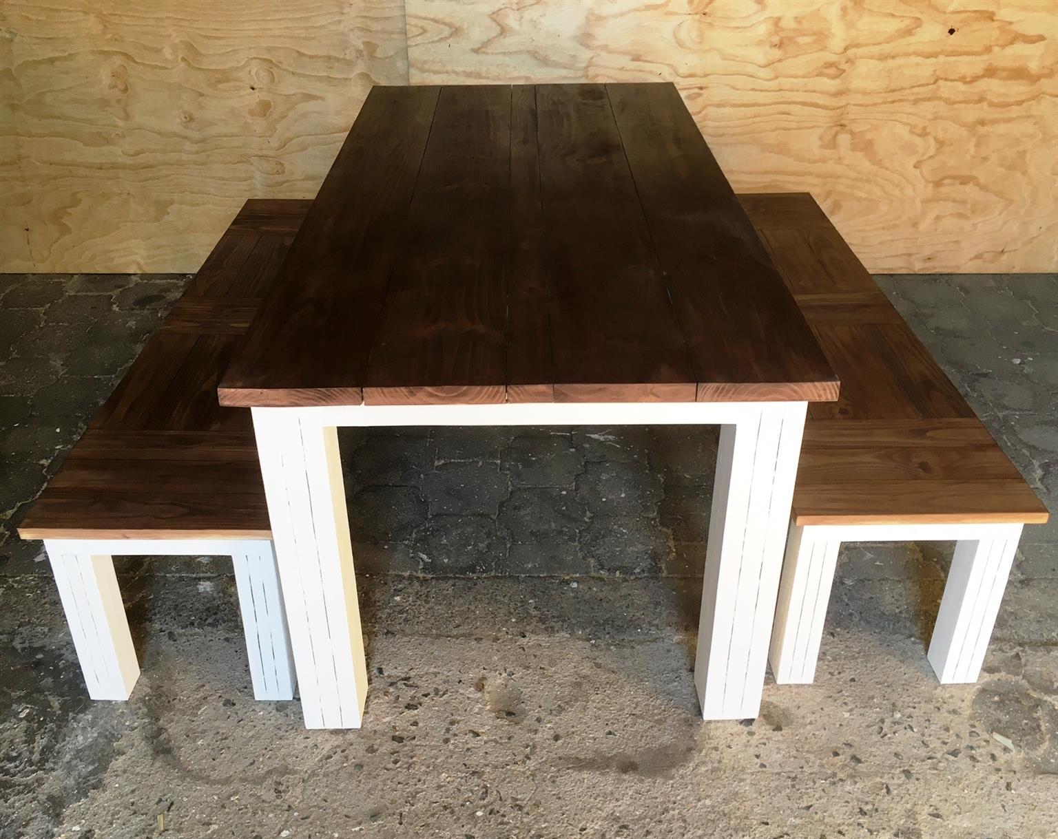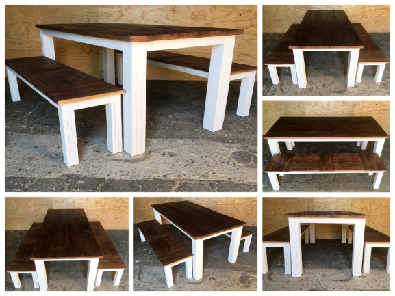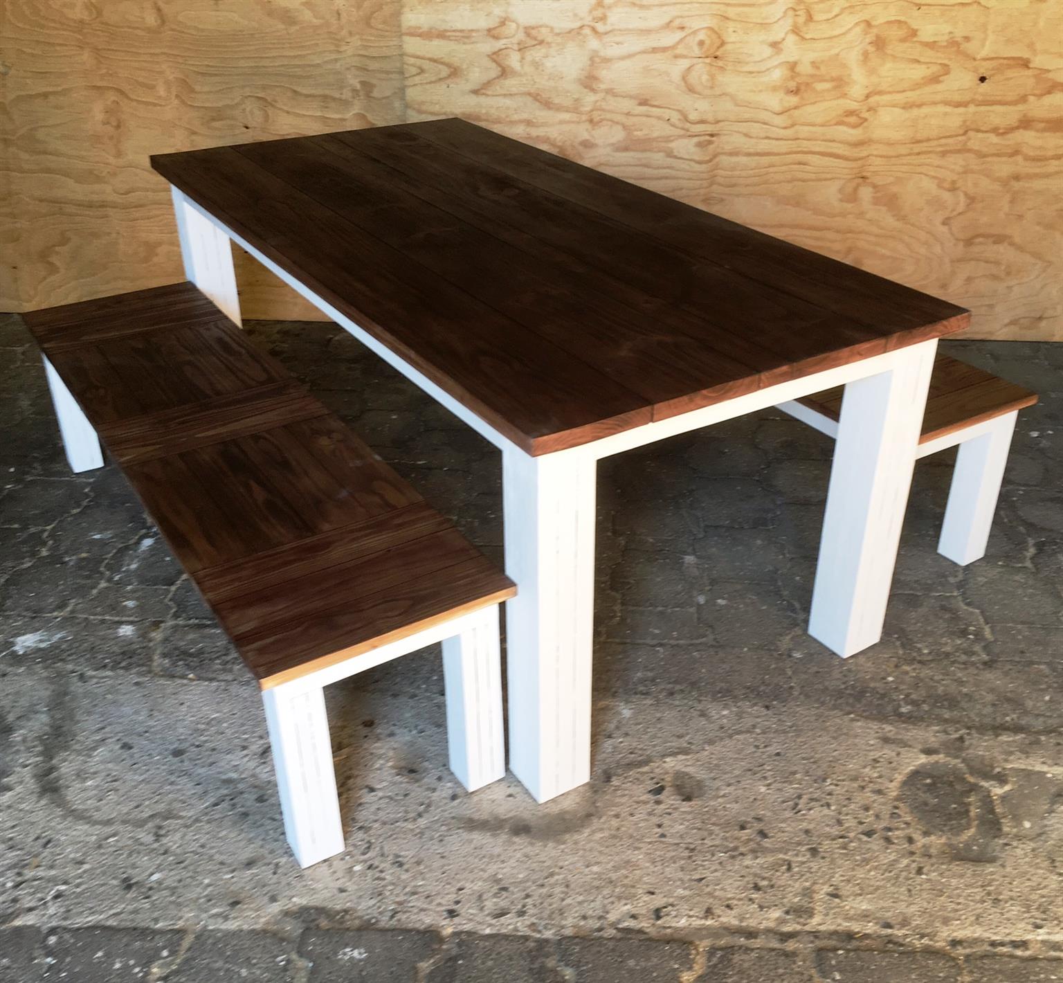 Beautiful hand-made 2-Toned table and bench combo. Seats 8 people. Can also be used in a dining-room