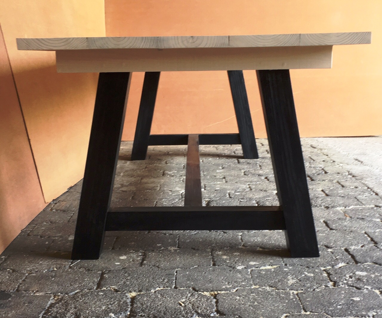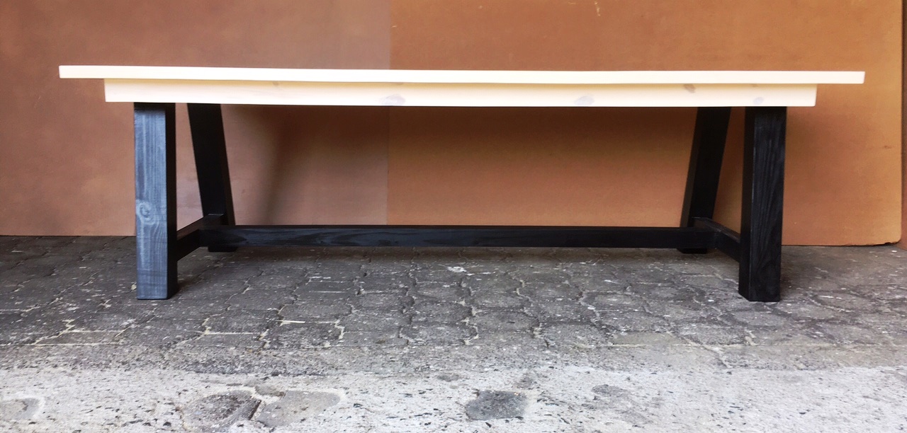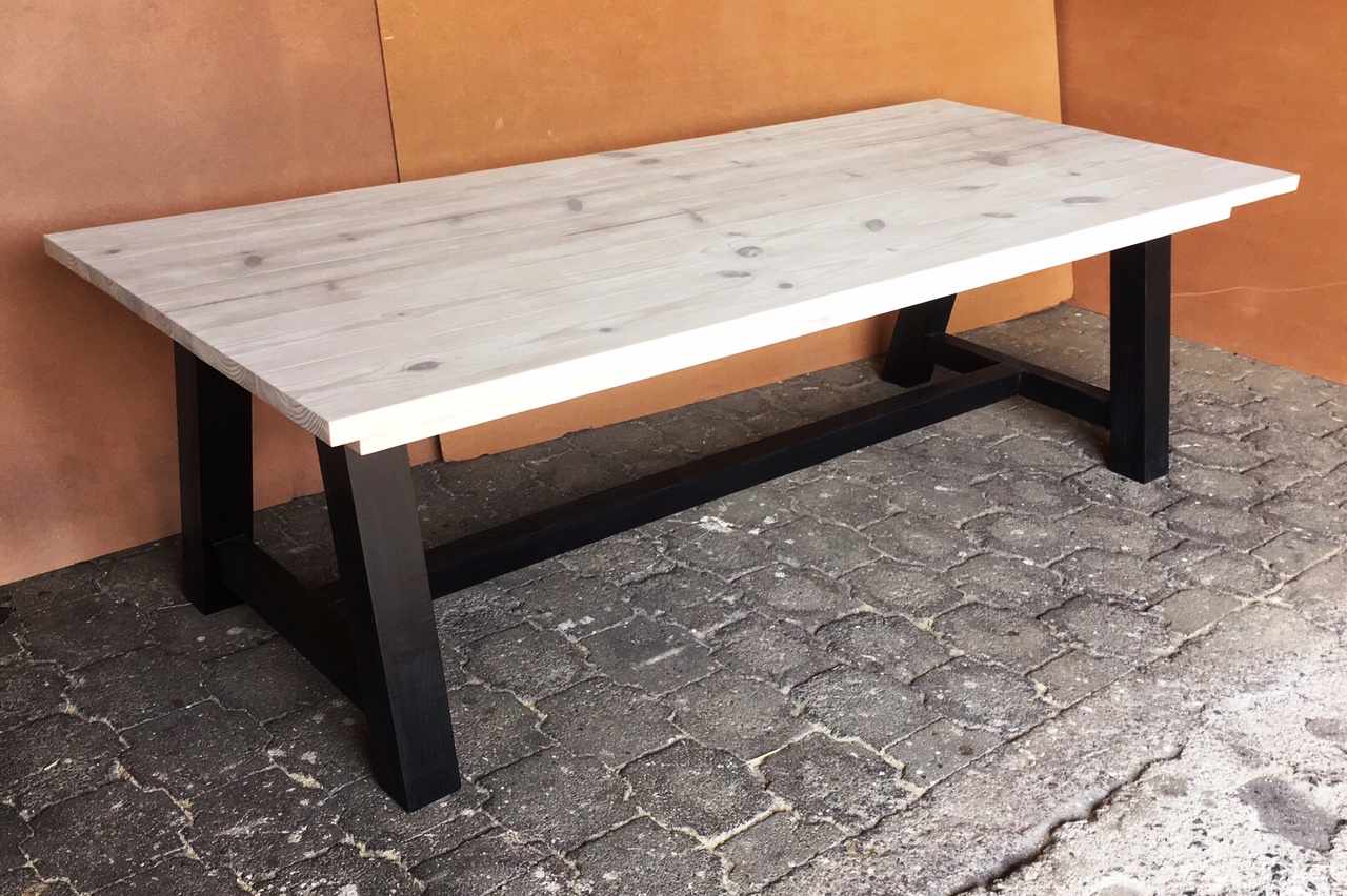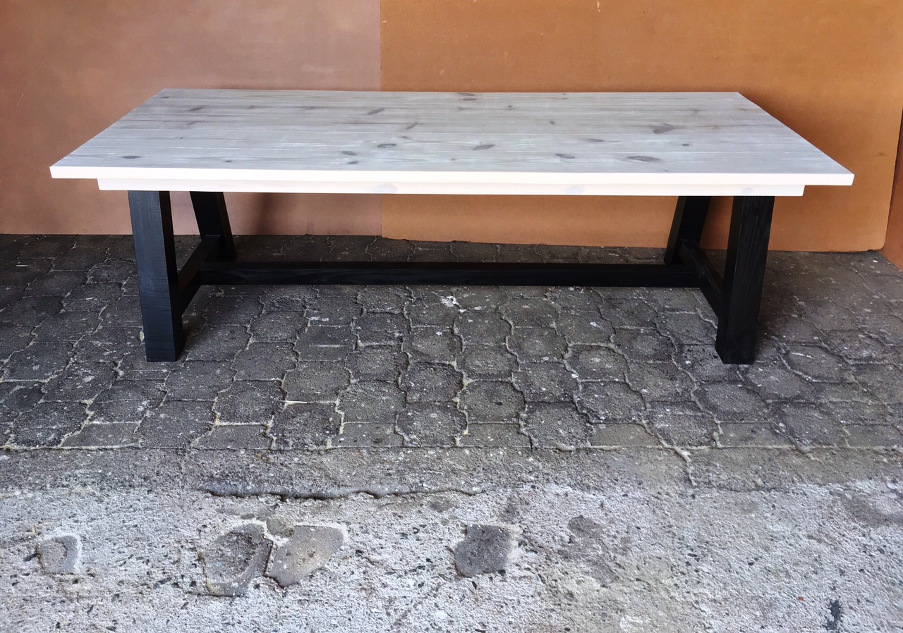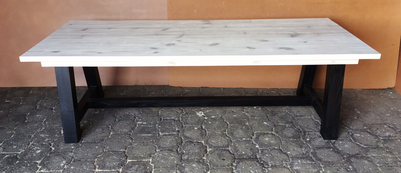 Beautiful hand-made 2-tone table with unique legs. The top is stained with "Antique white" and legs "Ebony black." Ideal for use as dining-room table but can also be used on the patio. Seats 10 people. Table only, everything else excluded.