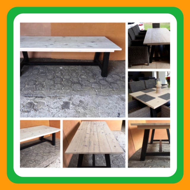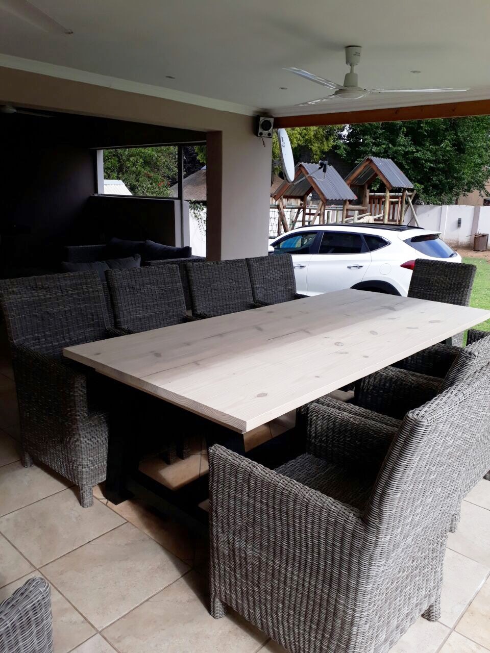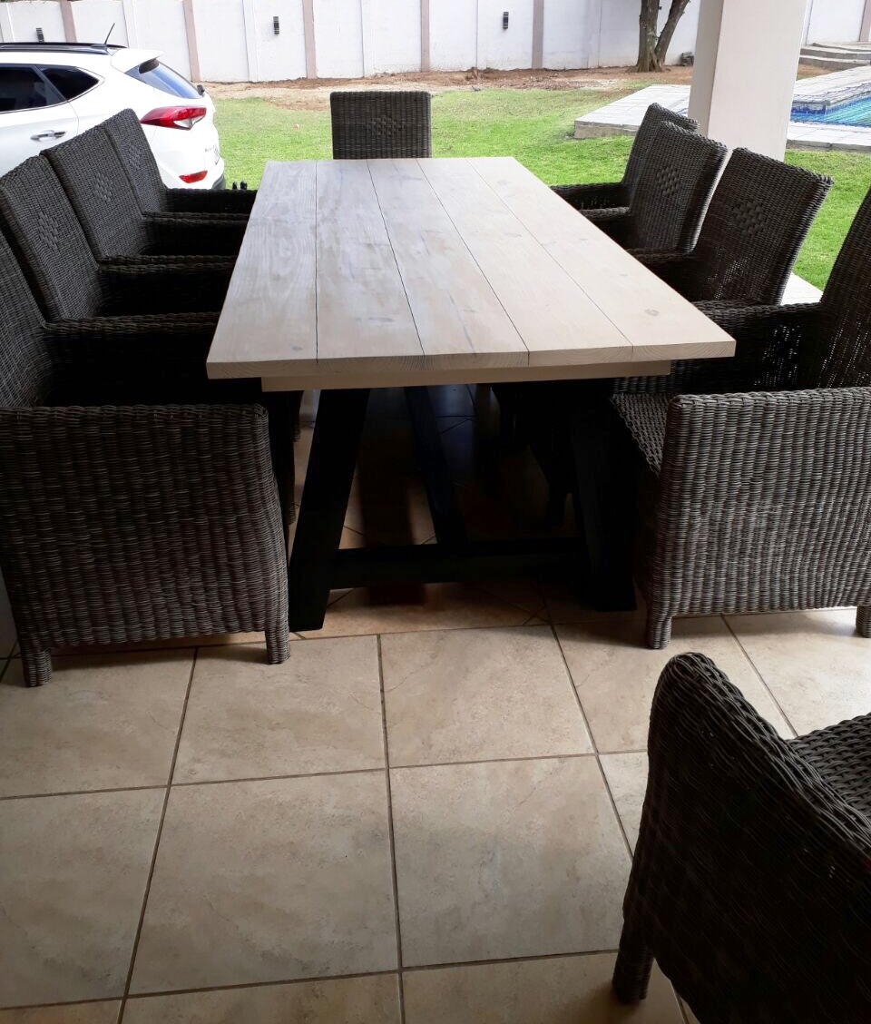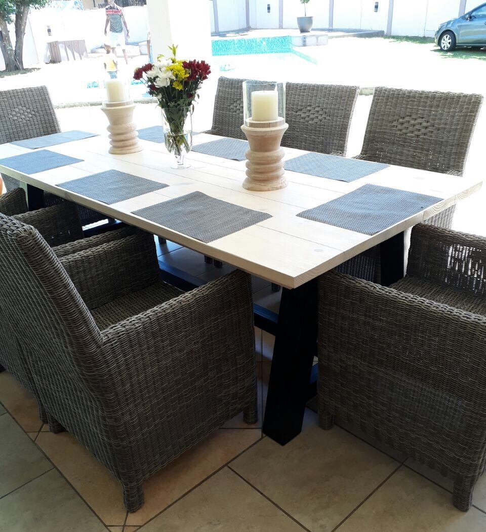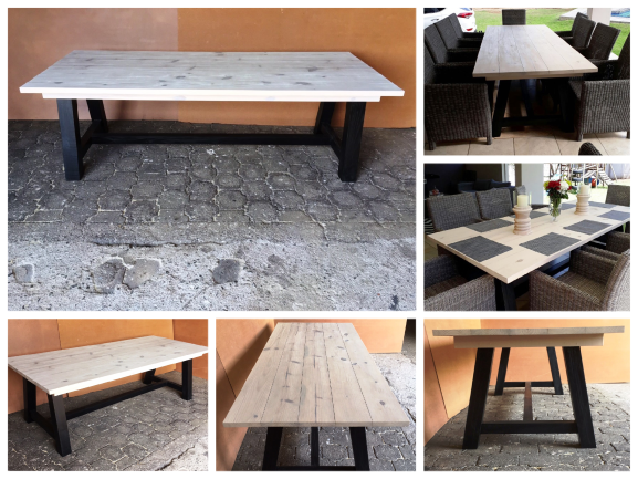 Beautiful hand-made 2-tone table with unique legs. The top is stained with "Antique white" and legs "Ebony black." Ideal for use as dining-room table but can also be used on the patio. Seats 10 people. Table only, everything else excluded.