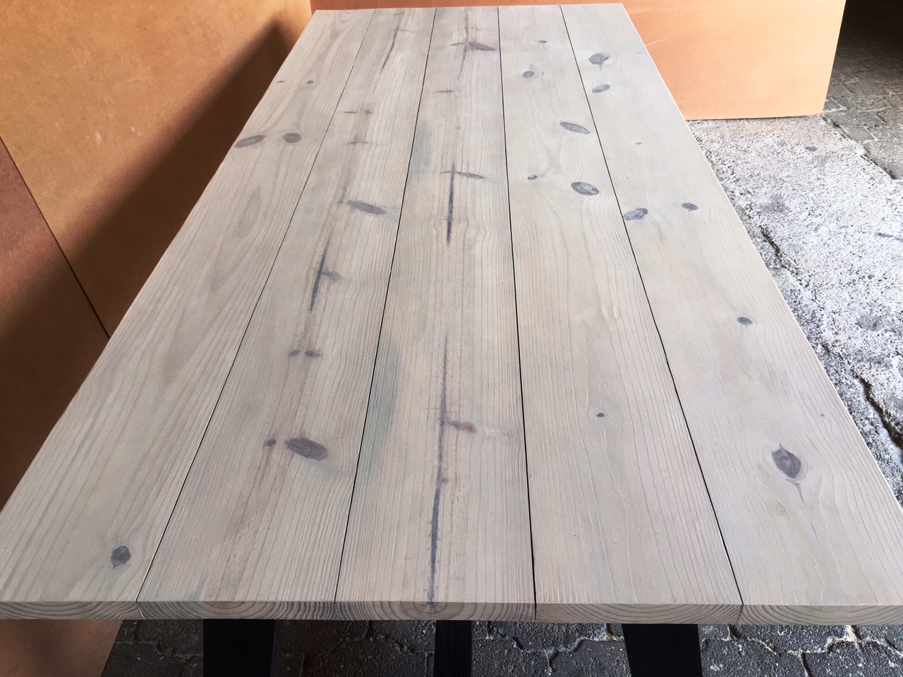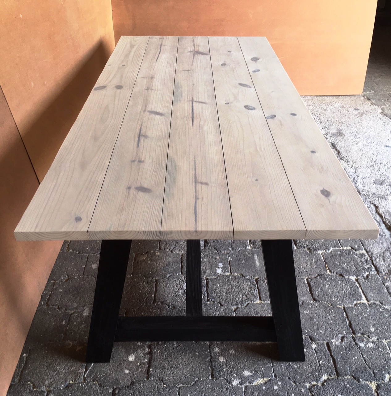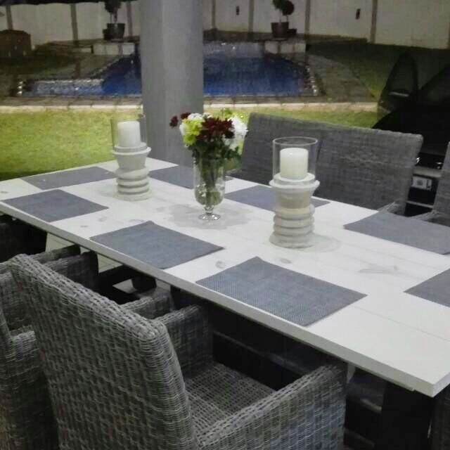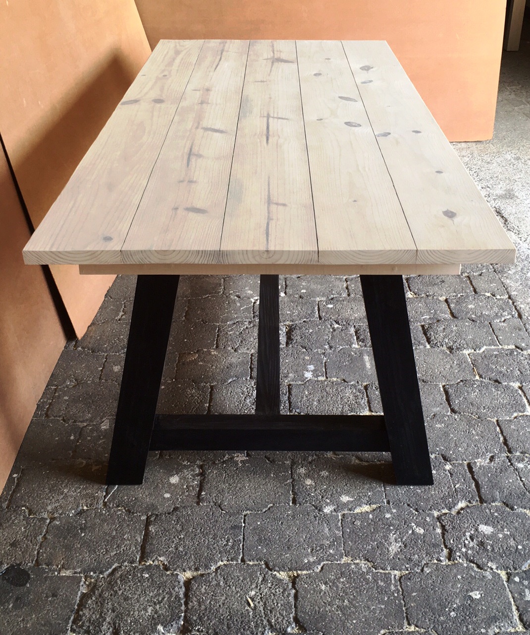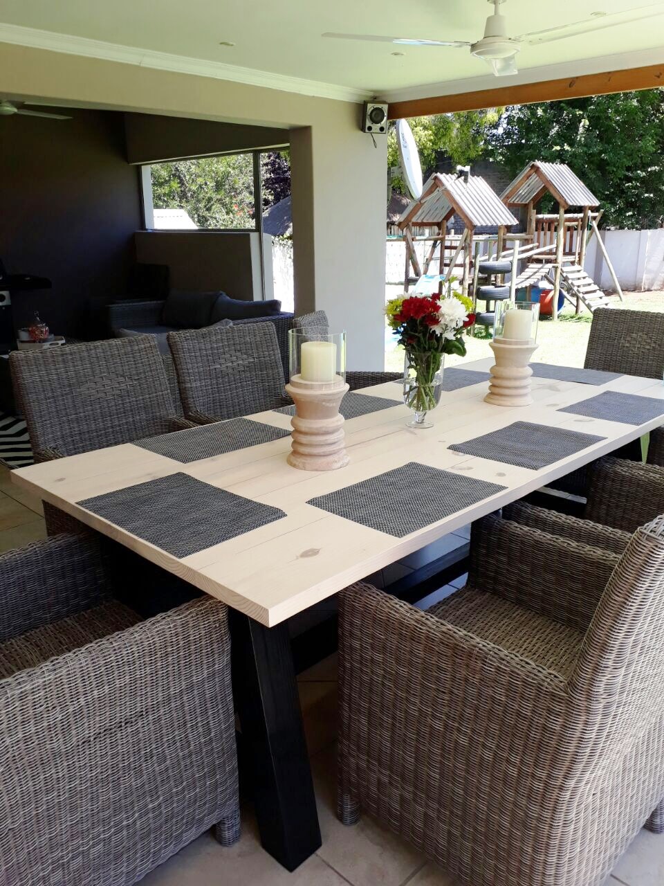 Beautiful hand-made 2-tone table with unique legs. The top is stained with "Antique white" and legs "Ebony black." Ideal for use as dining-room table but can also be used on the patio. Seats 10 people. Table only, everything else excluded.