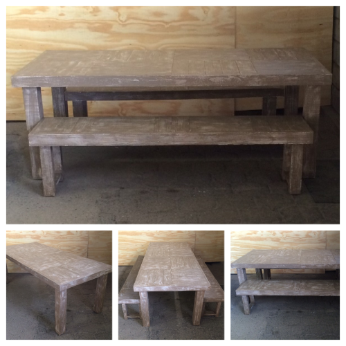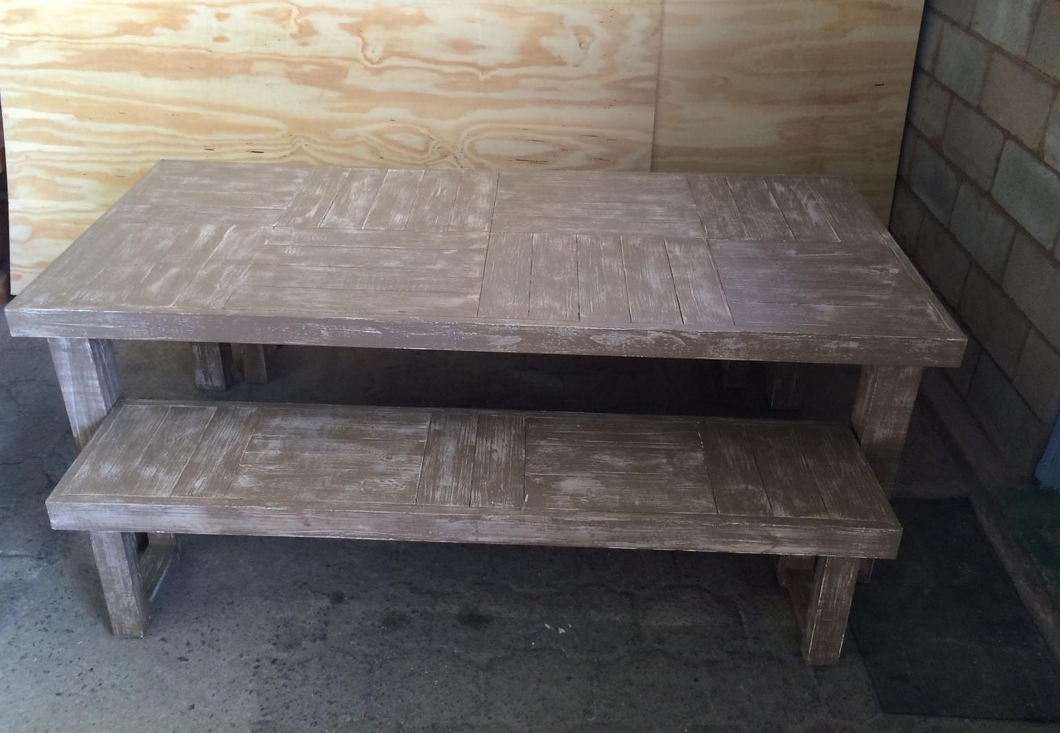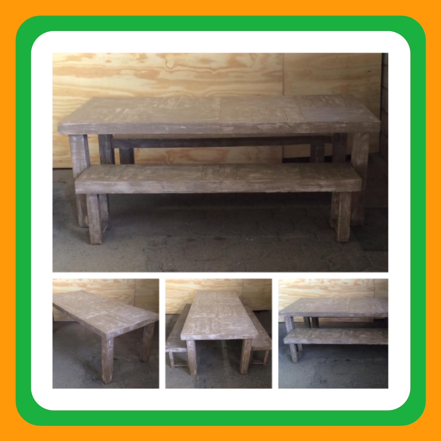 Beautiful Weathered look table and bench combo. Seats 8 people. Can also be used in a dining-room