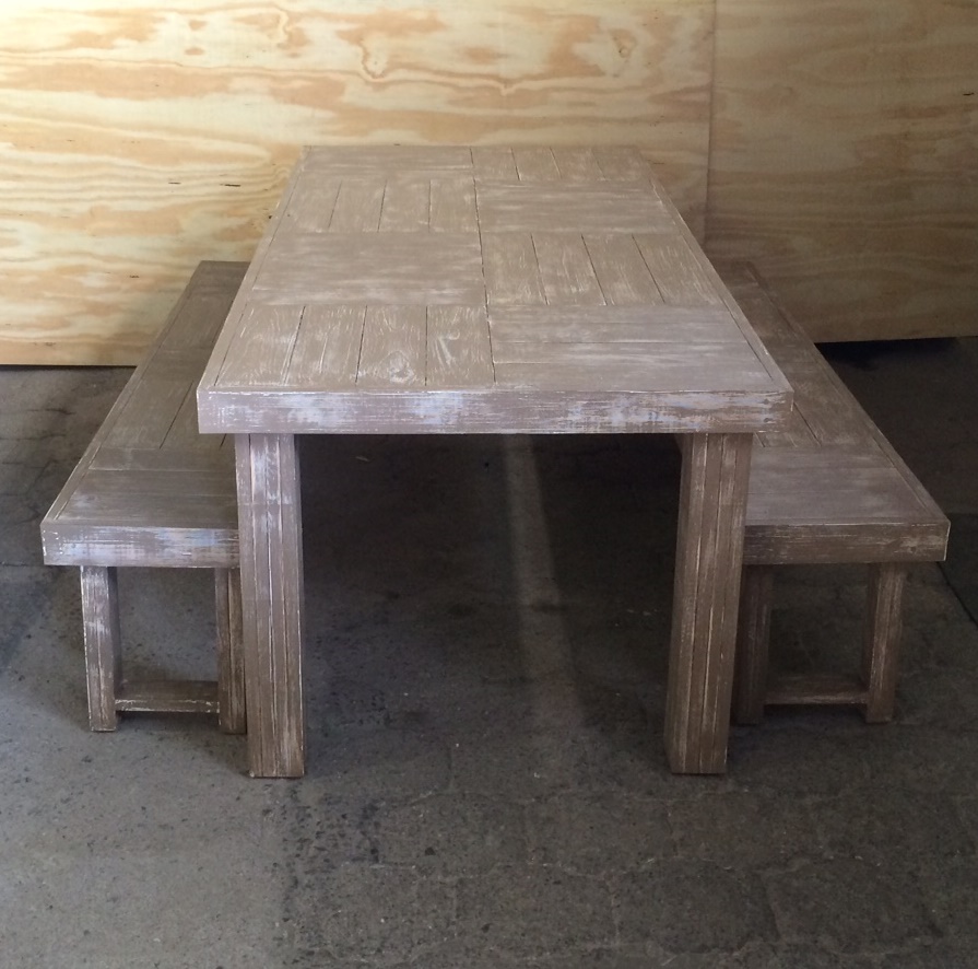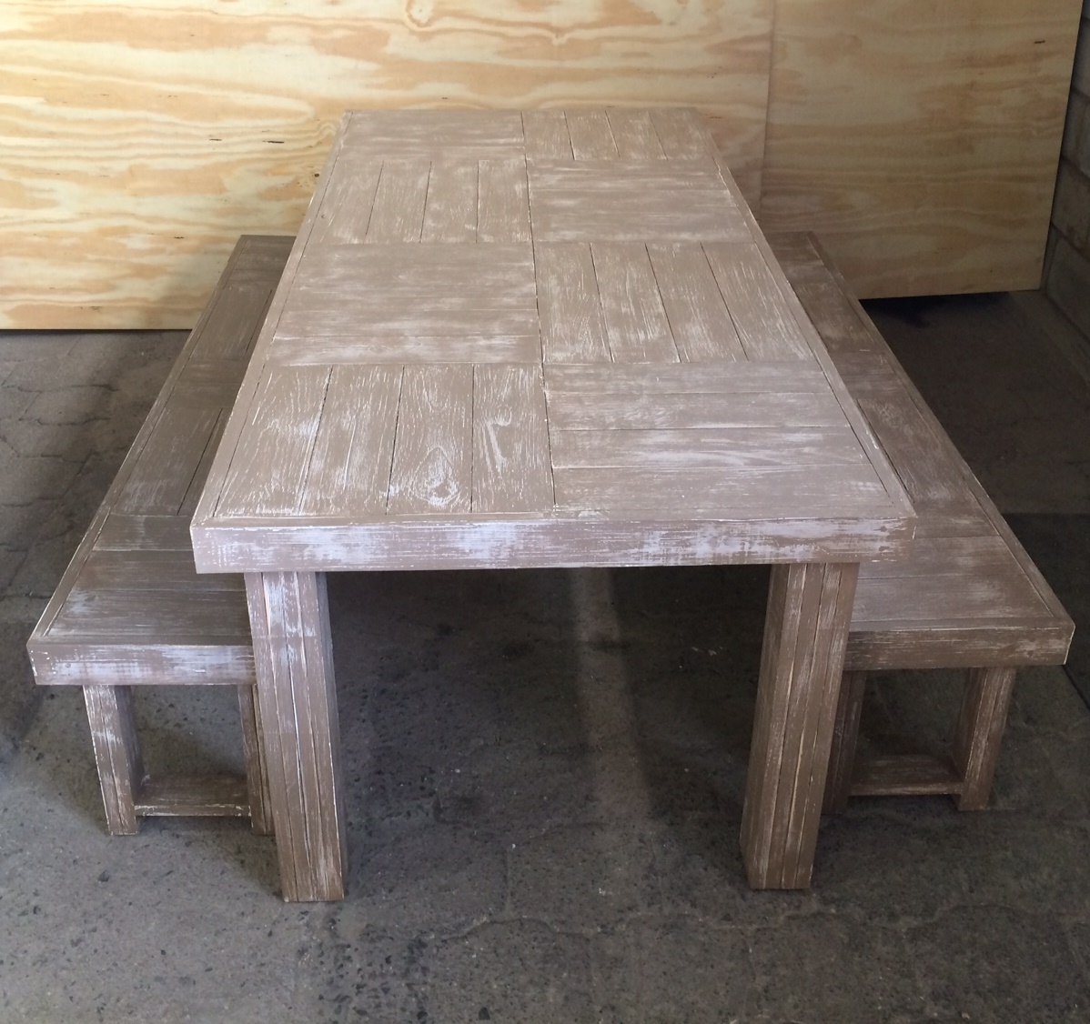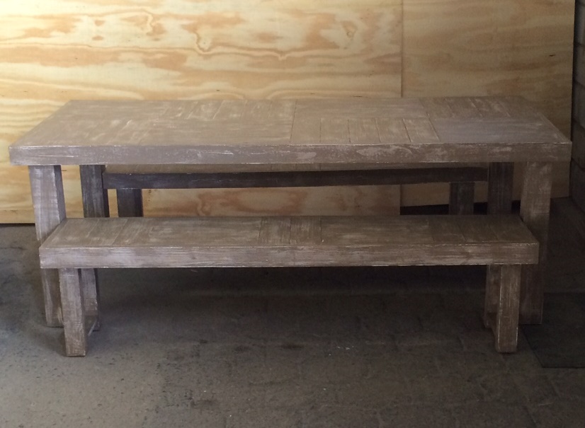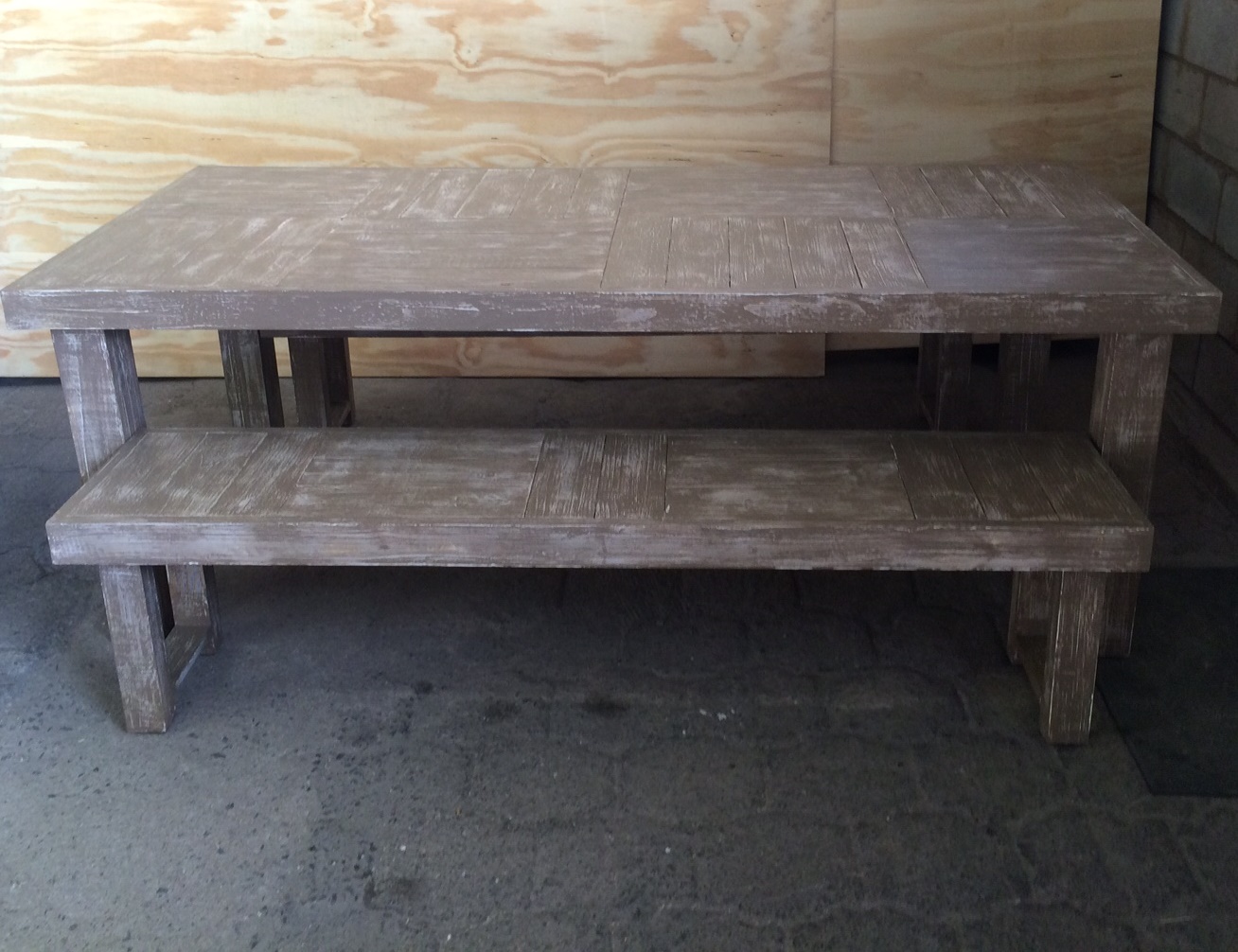 Beautiful Weathered look table and bench combo. Seats 8 people. Can also be used in a dining-room