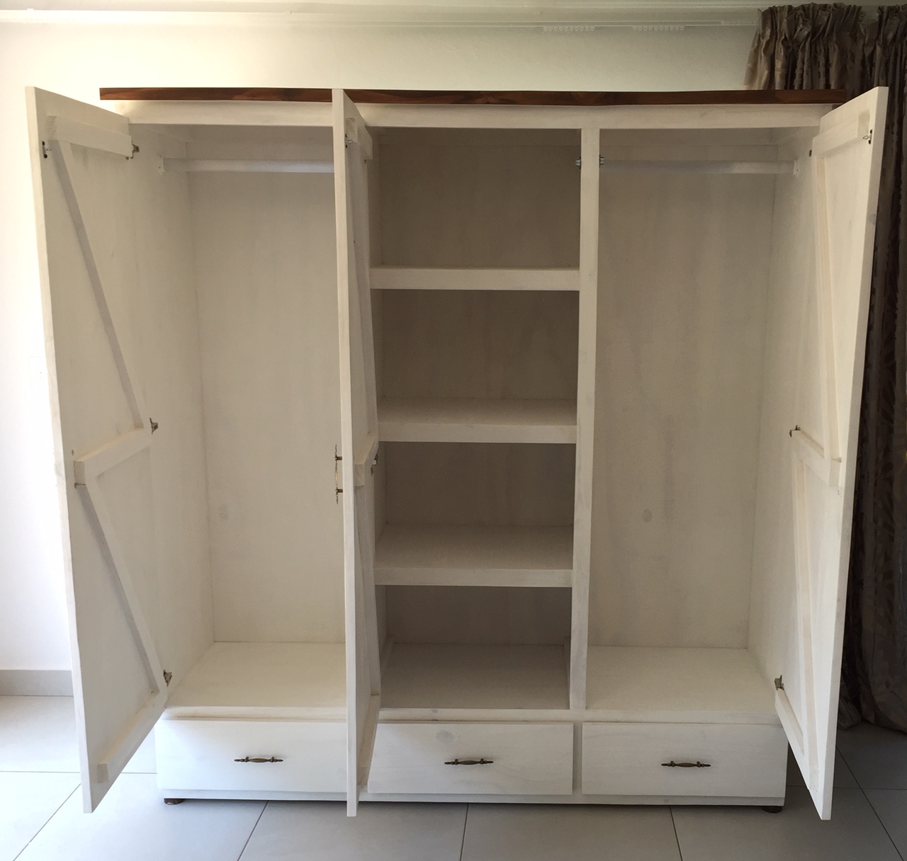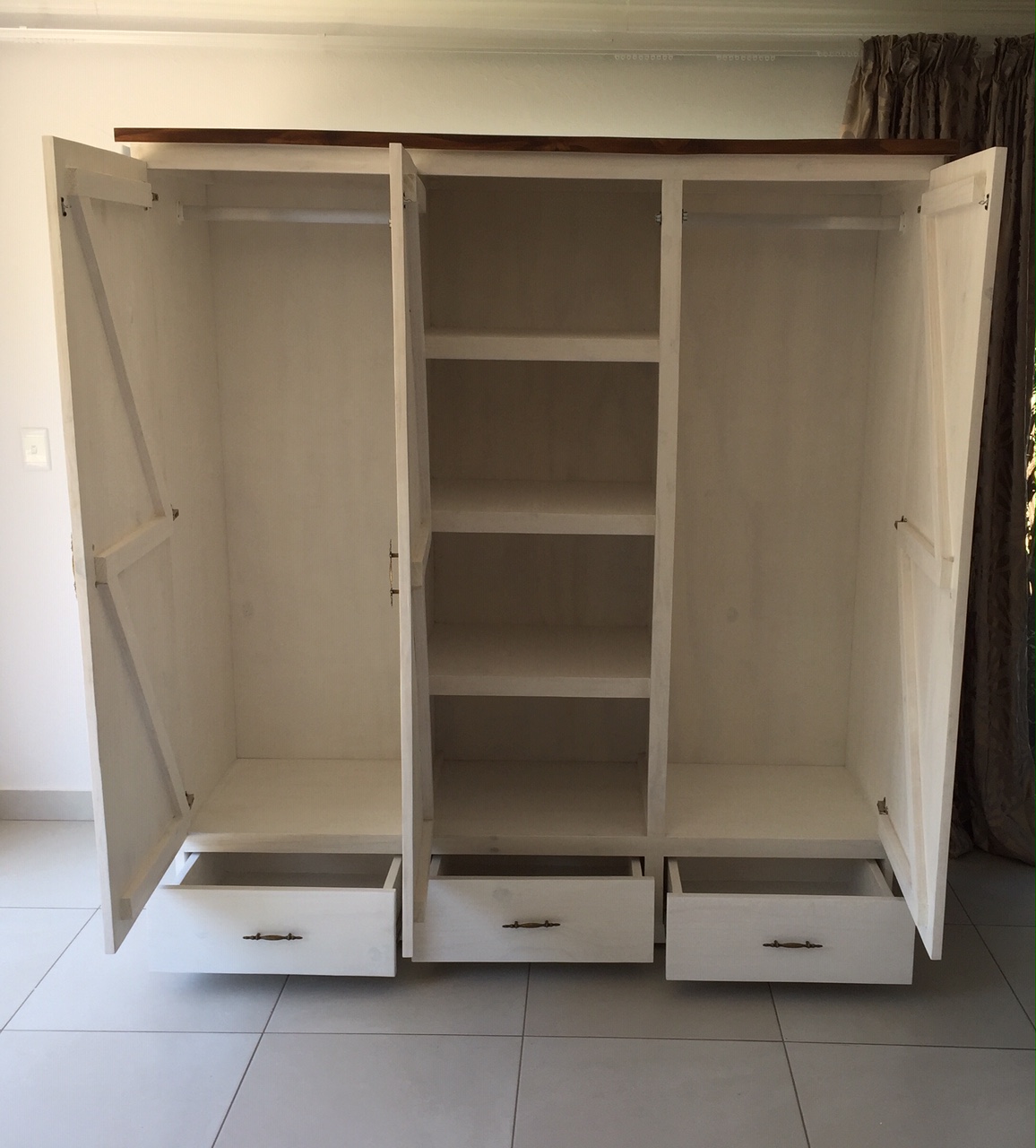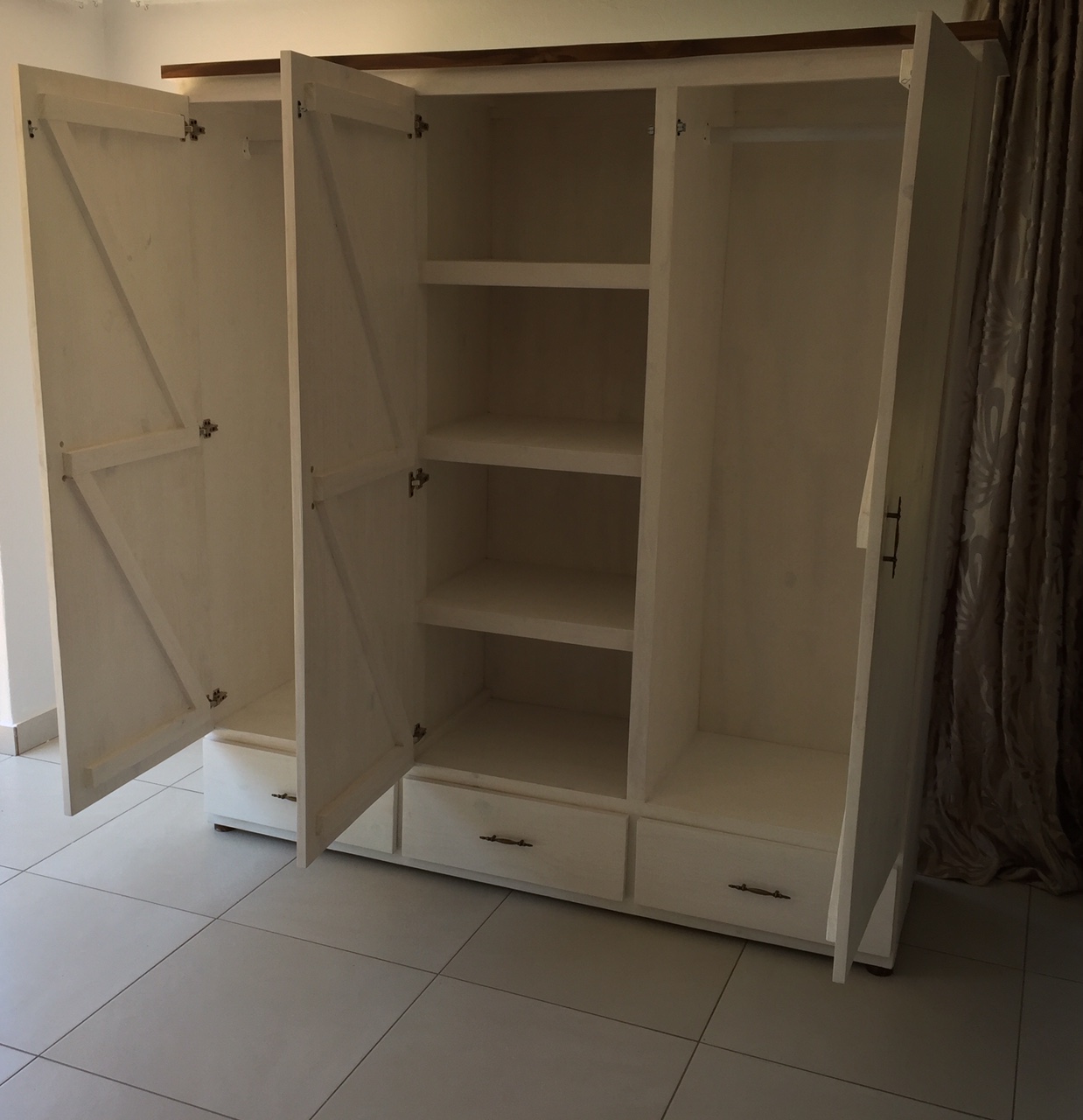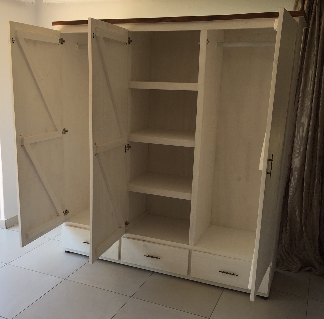 Beautiful handcrafted free standing "Chunky" unit with 3 doors and 3 very convenient drawers at the bottom. Behind the centre door the are very nice shelves and on both left and right sides ample hanging space. Additional rails can be added to increase hanging space further. Ideal for the larger bedrooms or for that spare room with no built-in cupboards. The antique brass handles rounds off this piece very nicely.