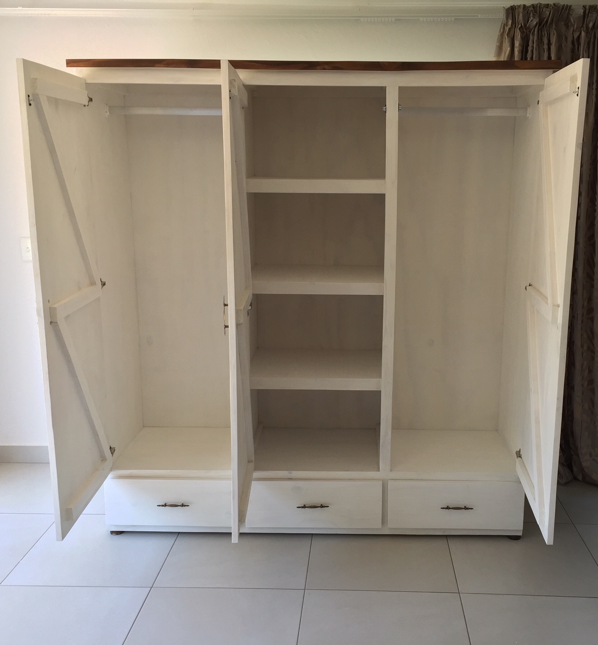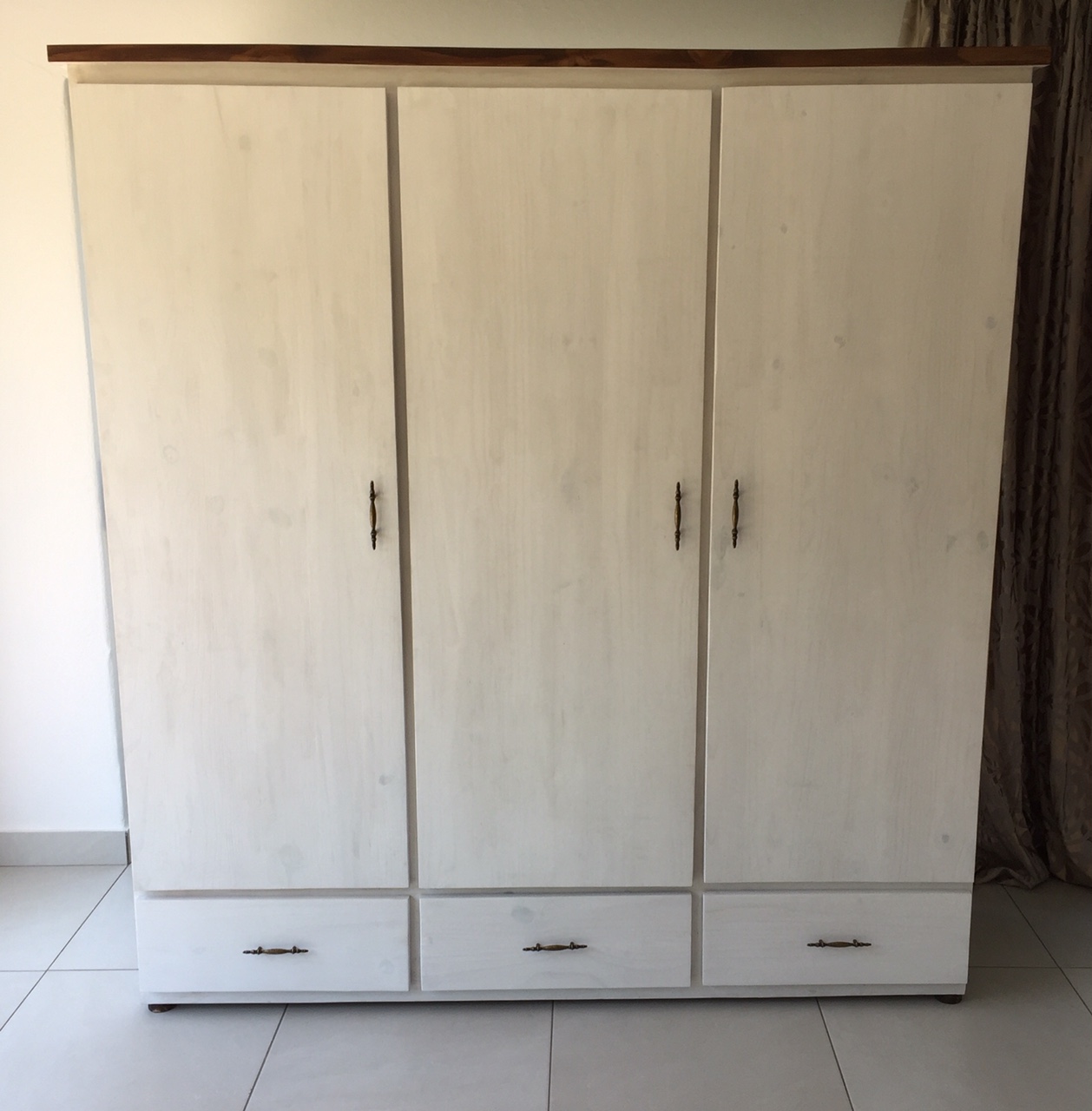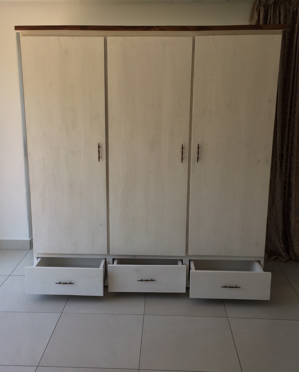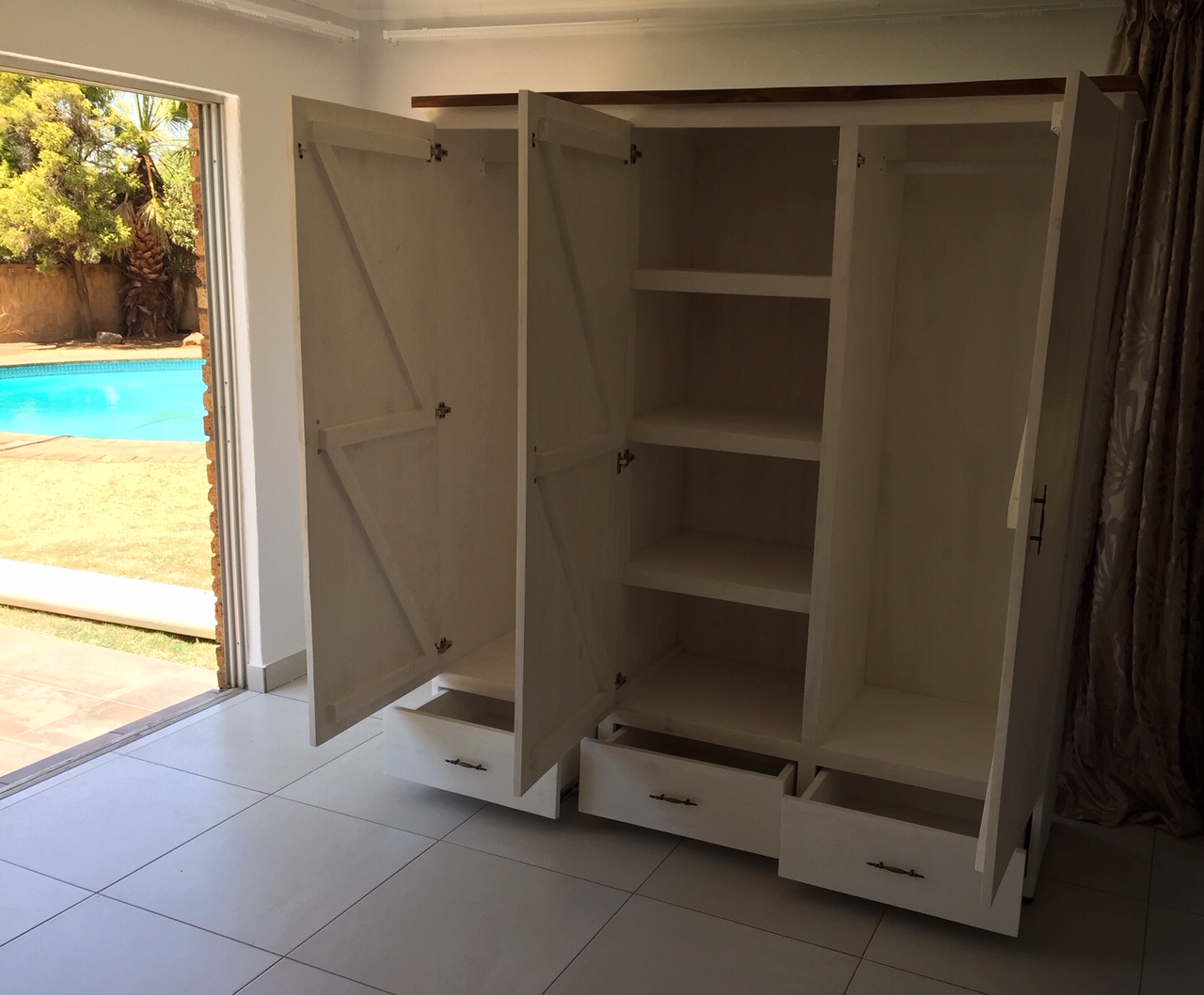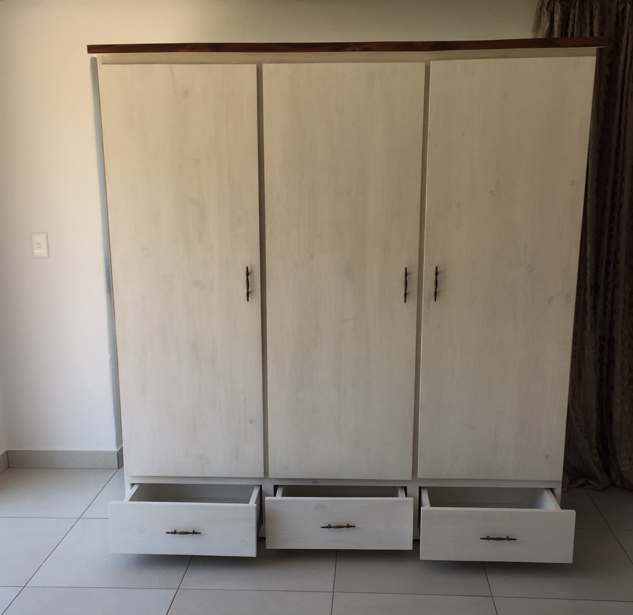 Beautiful handcrafted free standing "Chunky" unit with 3 doors and 3 very convenient drawers at the bottom. Behind the centre door the are very nice shelves and on both left and right sides ample hanging space. Additional rails can be added to increase hanging space further. Ideal for the larger bedrooms or for that spare room with no built-in cupboards. The antique brass handles rounds off this piece very nicely.