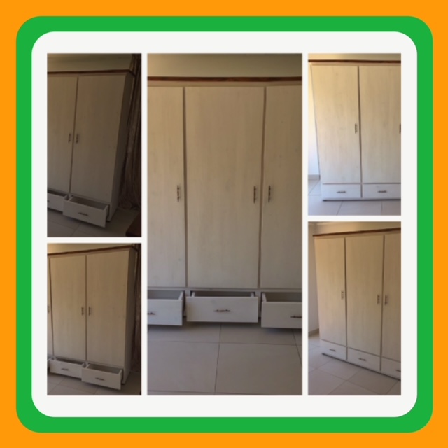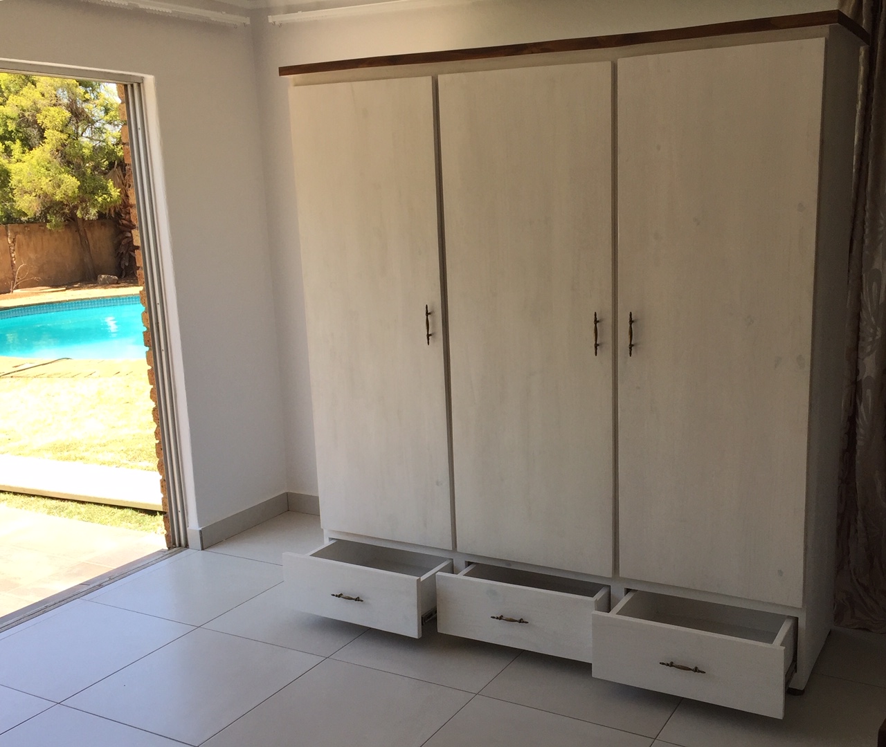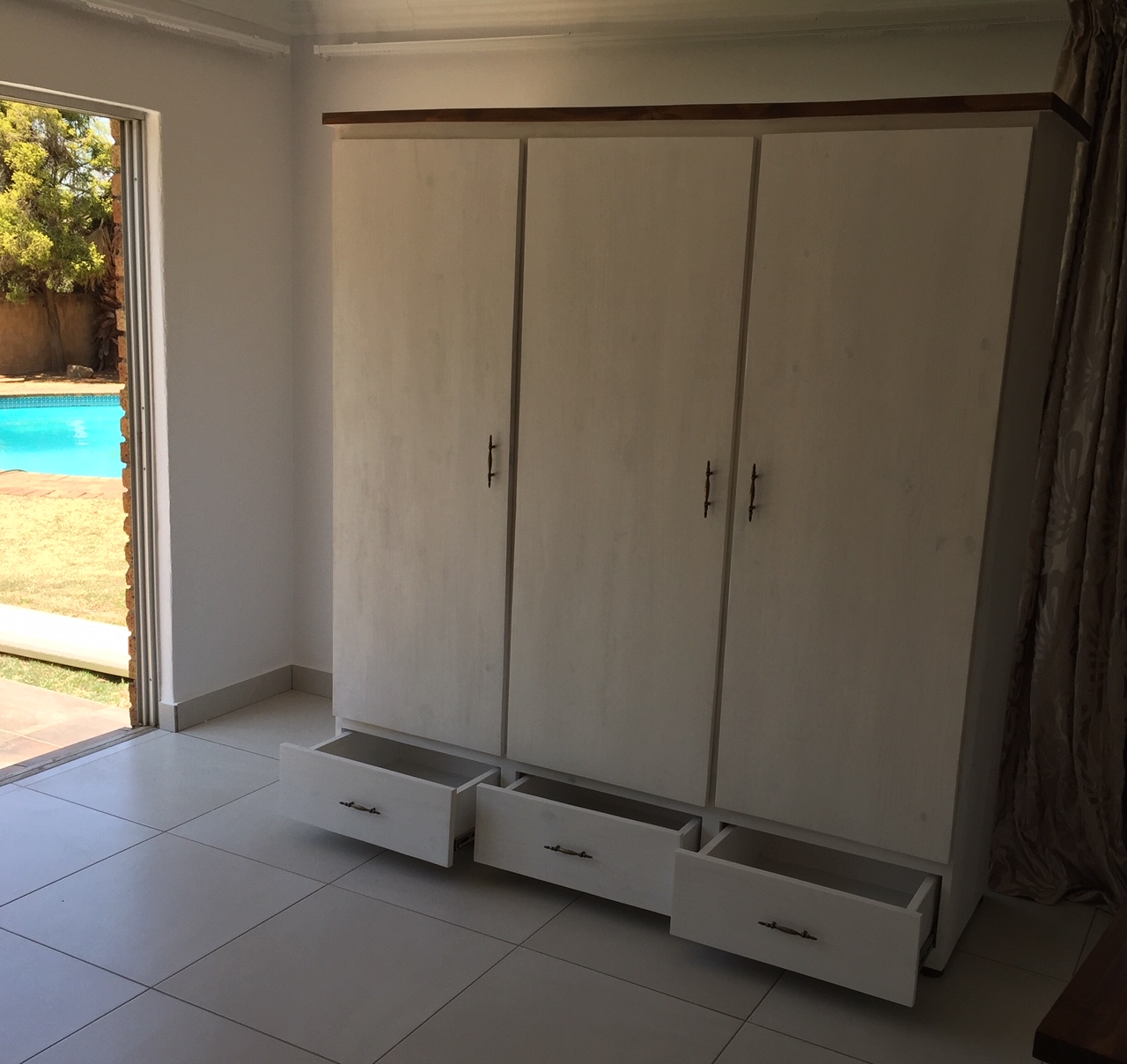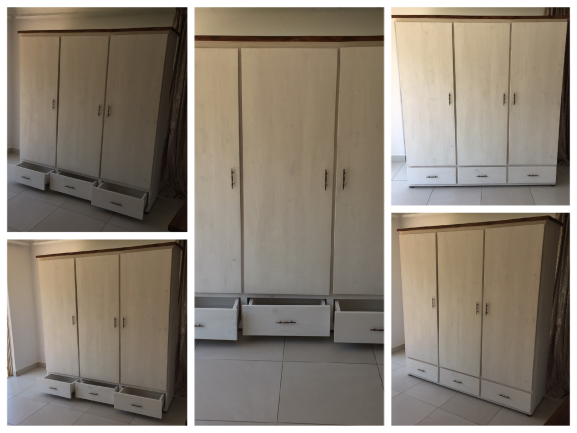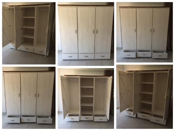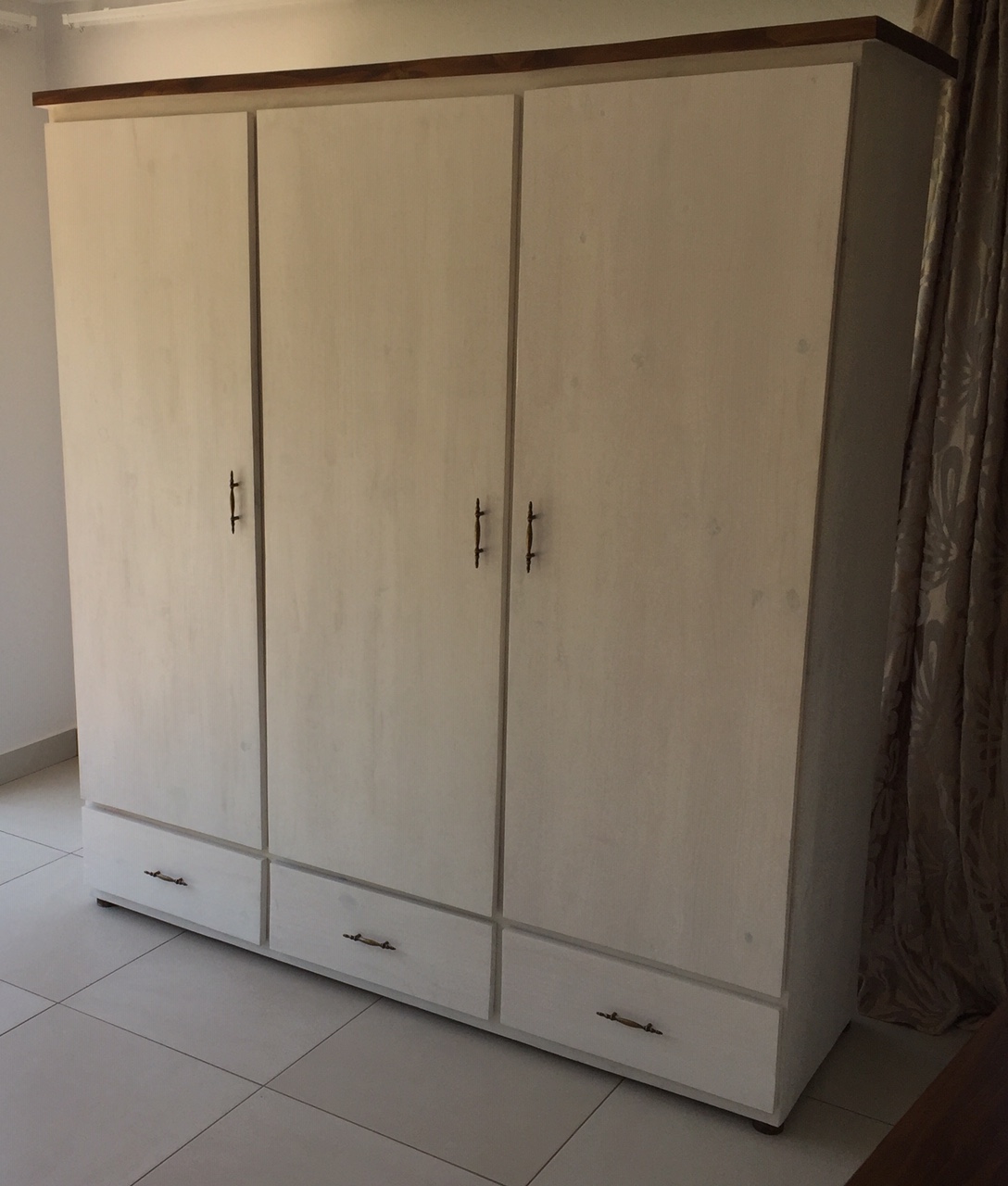 Beautiful handcrafted free standing "Chunky" unit with 3 doors and 3 very convenient drawers at the bottom. Behind the centre door the are very nice shelves and on both left and right sides ample hanging space. Additional rails can be added to increase hanging space further. Ideal for the larger bedrooms or for that spare room with no built-in cupboards. The antique brass handles rounds off this piece very nicely.