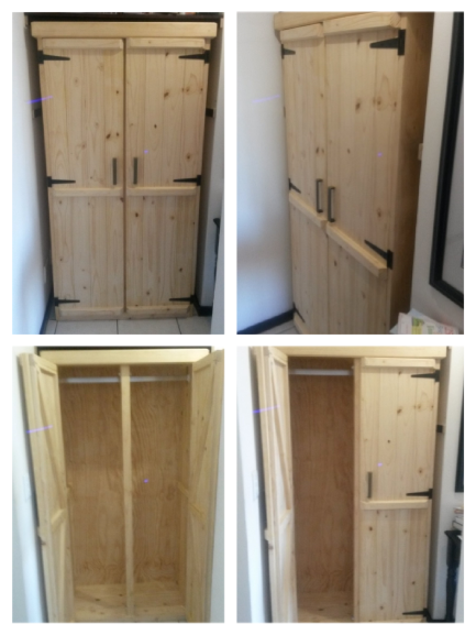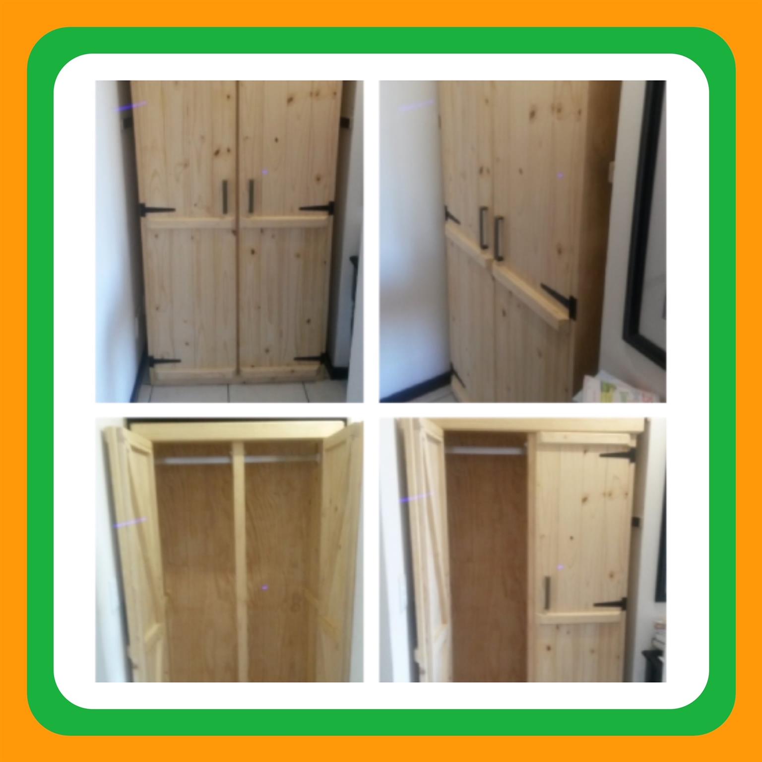 Beautiful handcrafted free standing double door unit with hanging space on both sides. Ample space, ideal for that spare room with no build in cupboards. The black t-hinges rounds off this piece very nicely. Dimensions: