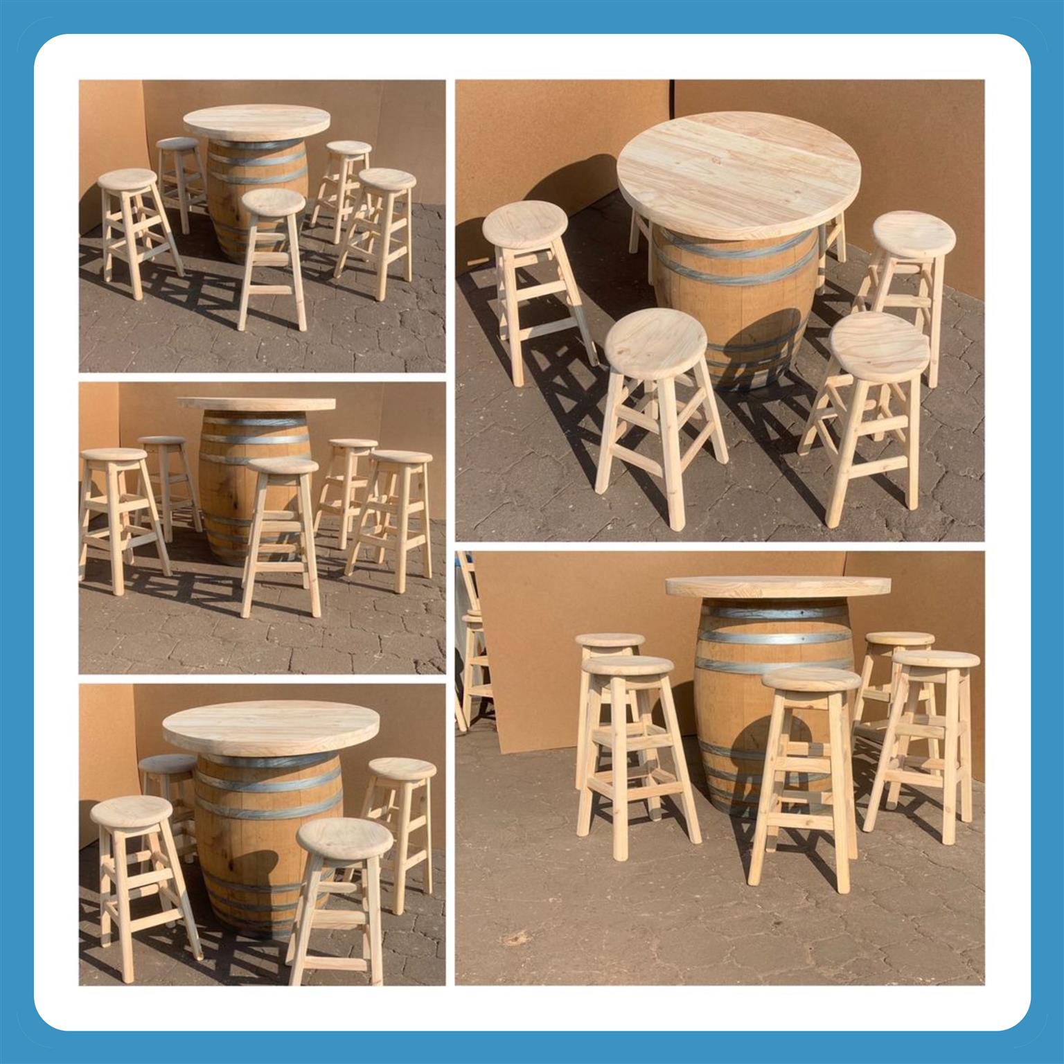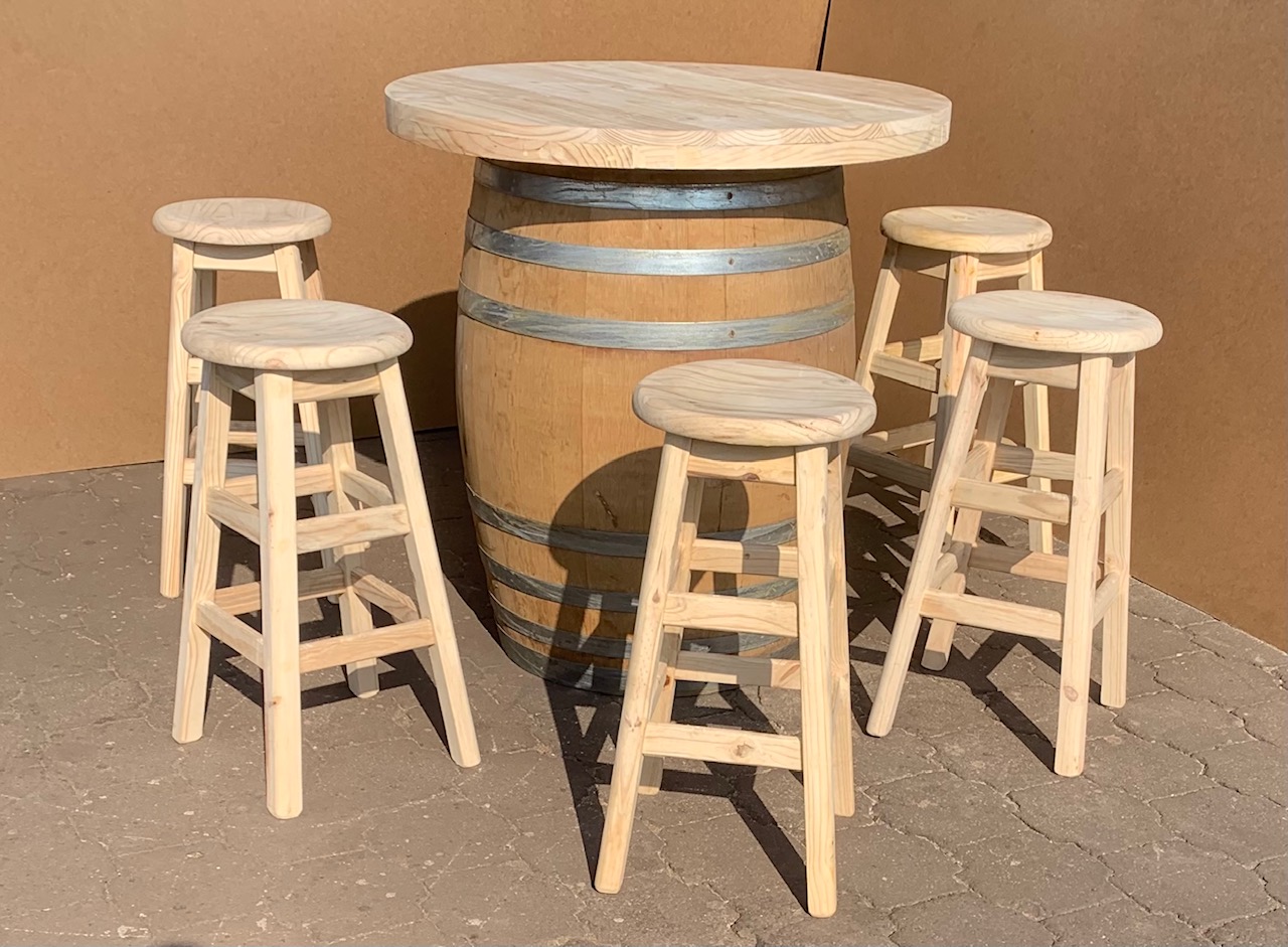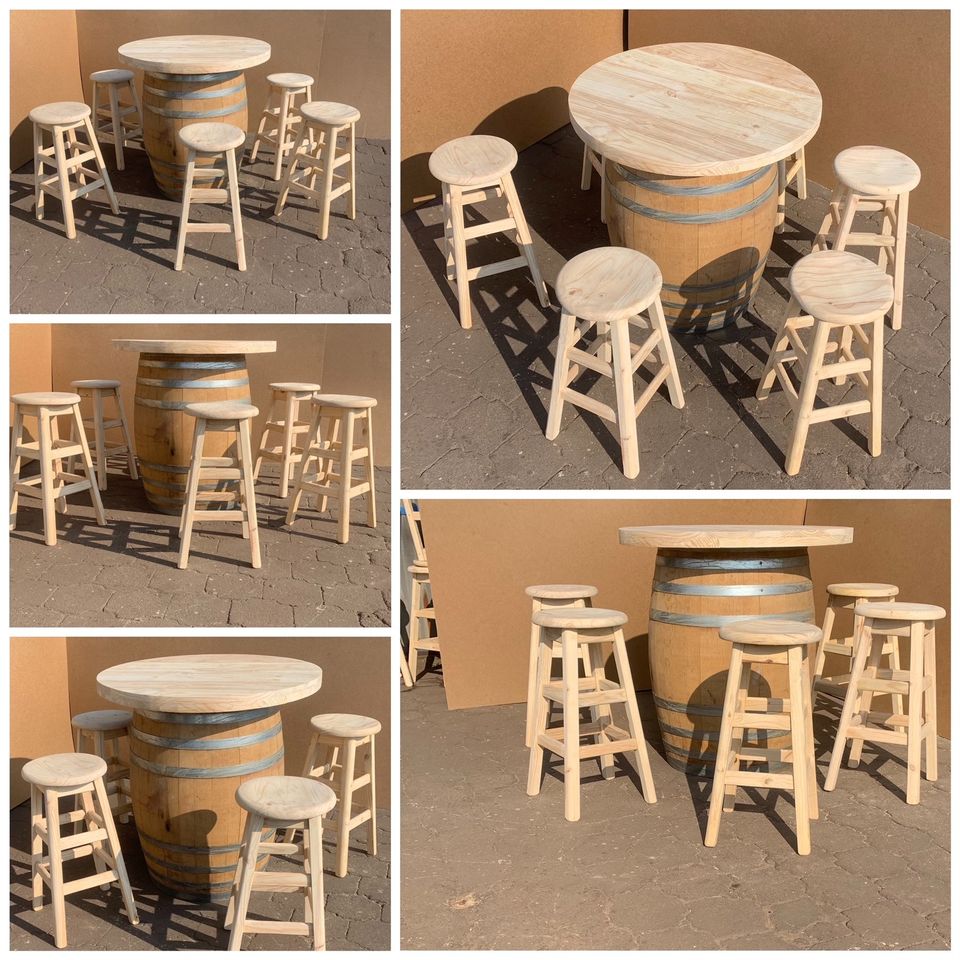 This beautiful unvarnished and untreated wine barrel with table top Combo will be a lovely addition to your Bar room/area. Sure to "enhance" entertainment area and top allows for comfortable work/serving area. Very popular in Pubs and restaurants. Price is for 1 Barrel with top and 6 stools.