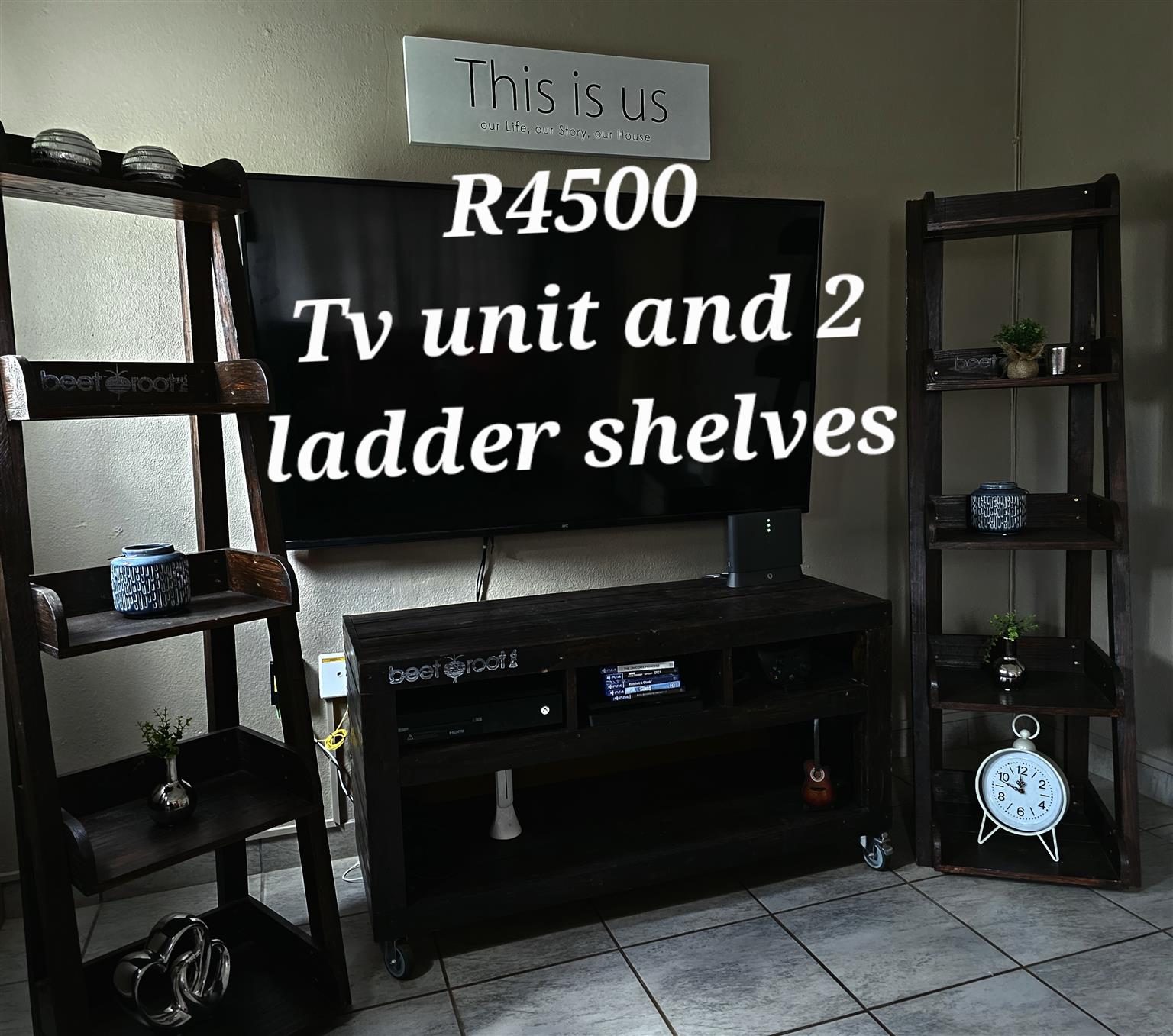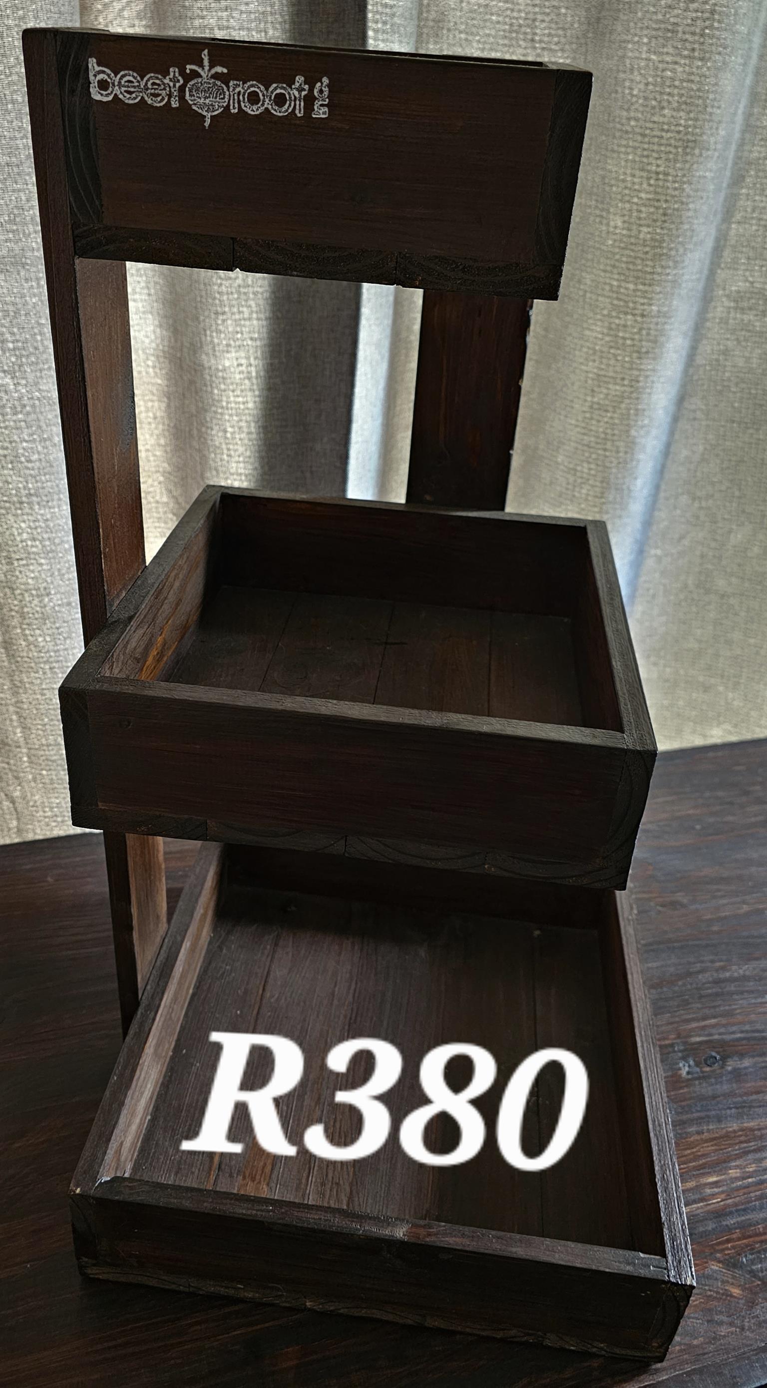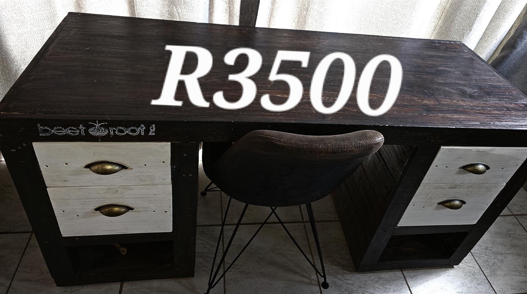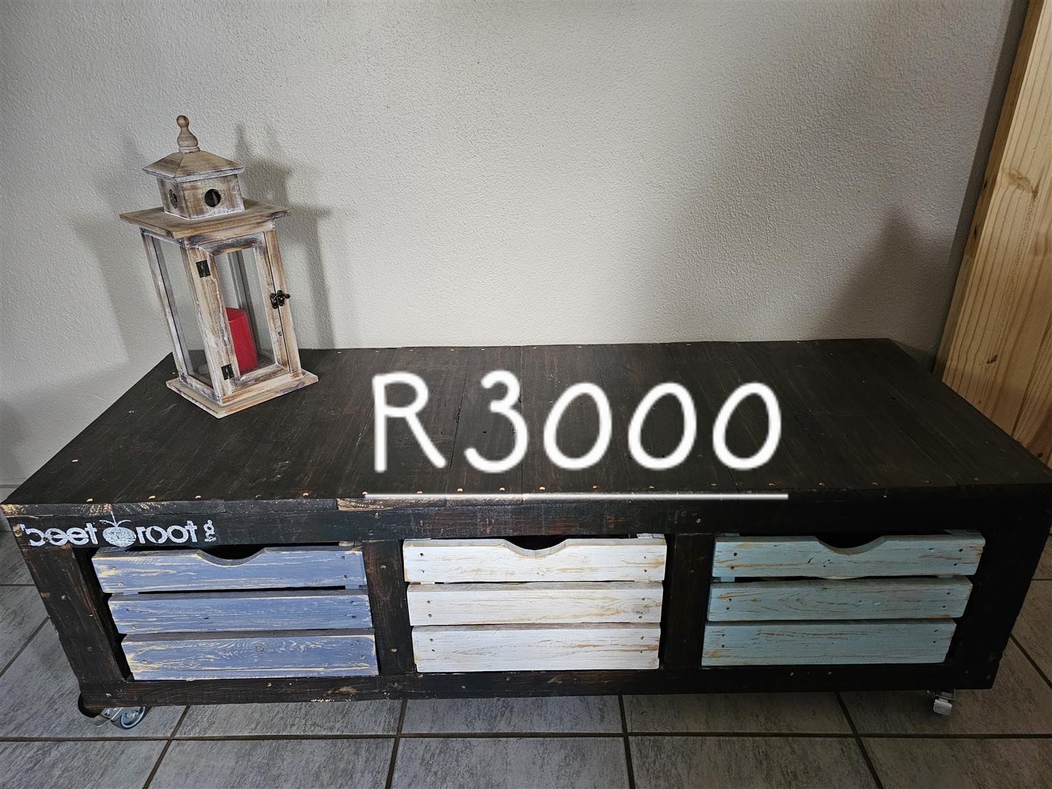 Beetroot furniture made from solid reclaimed wood in a dark stain. Prices marked on each item. Reason for sale - Relocation