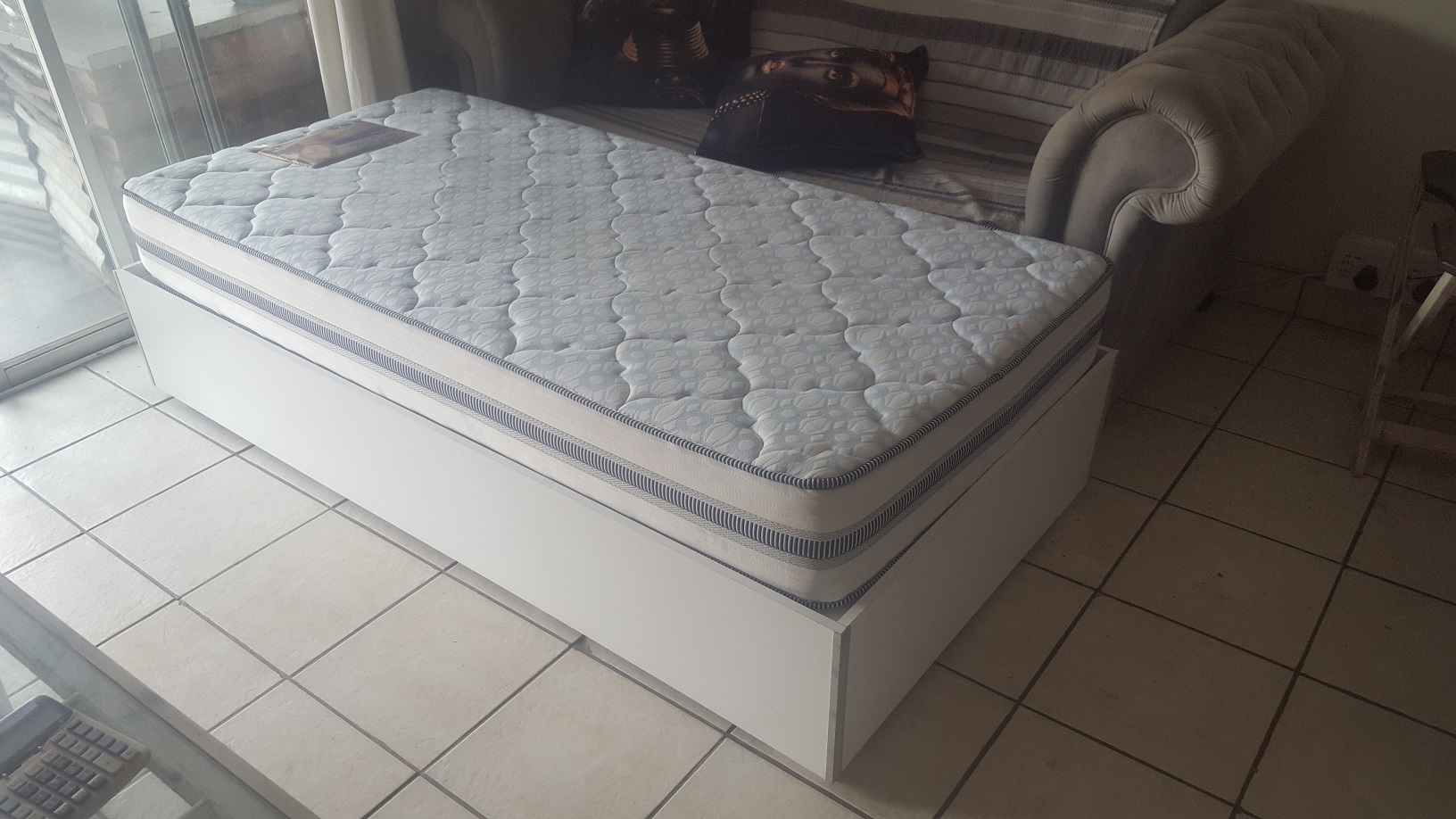 Single bed and mattress. The base has been custom made. Very good condition. Mattress from Cloud Nine. Almost brand new. Downsized apartment. No space for unit anymore. Cash sale only.