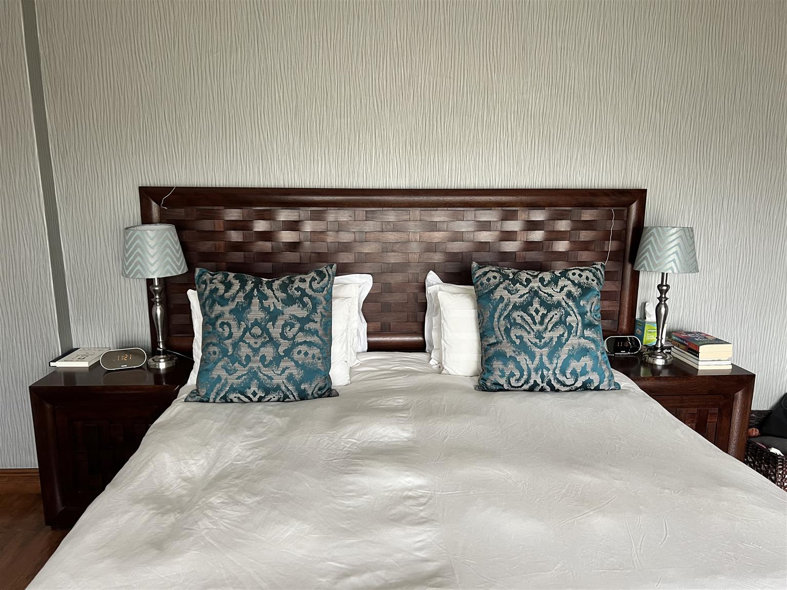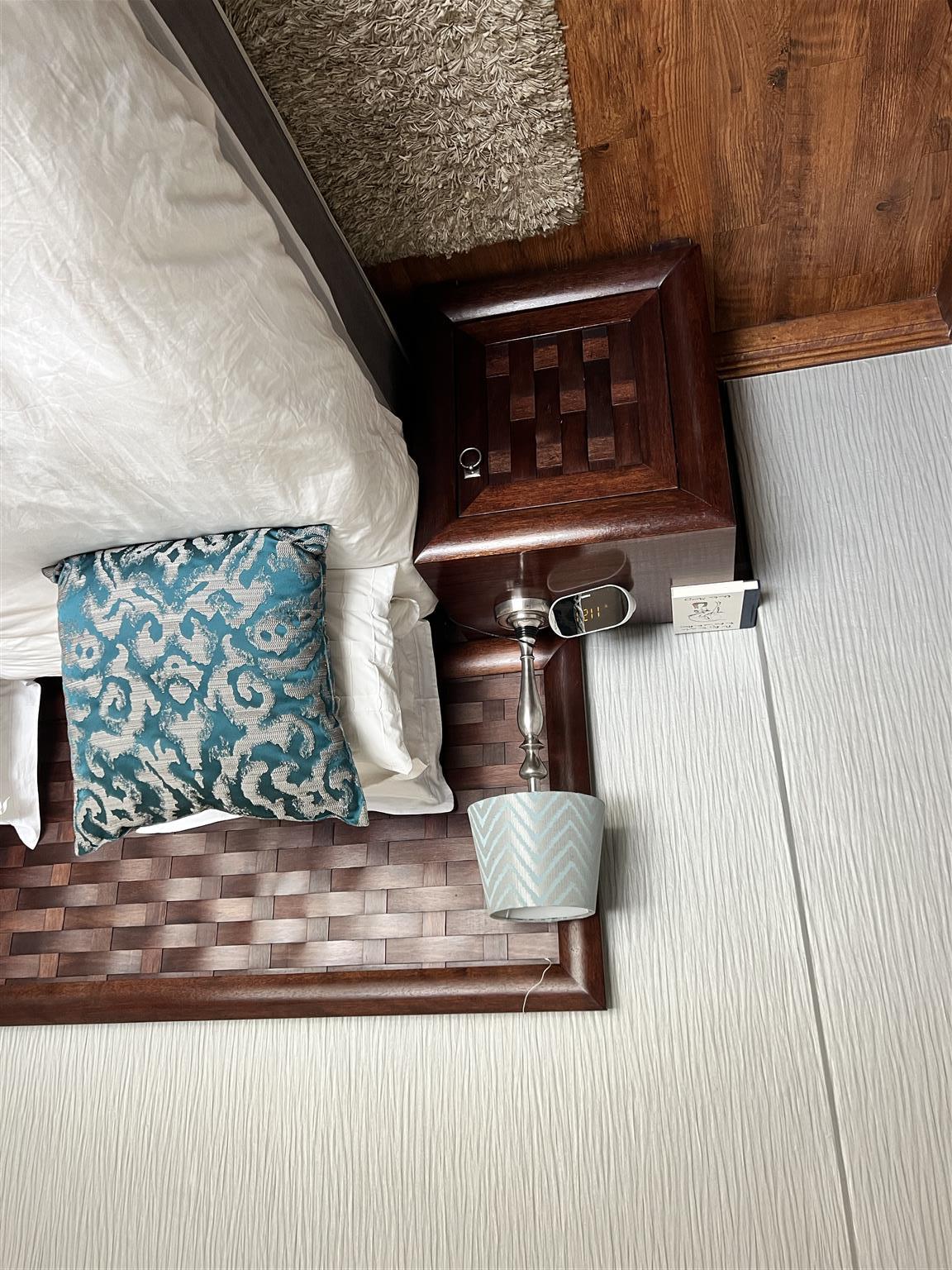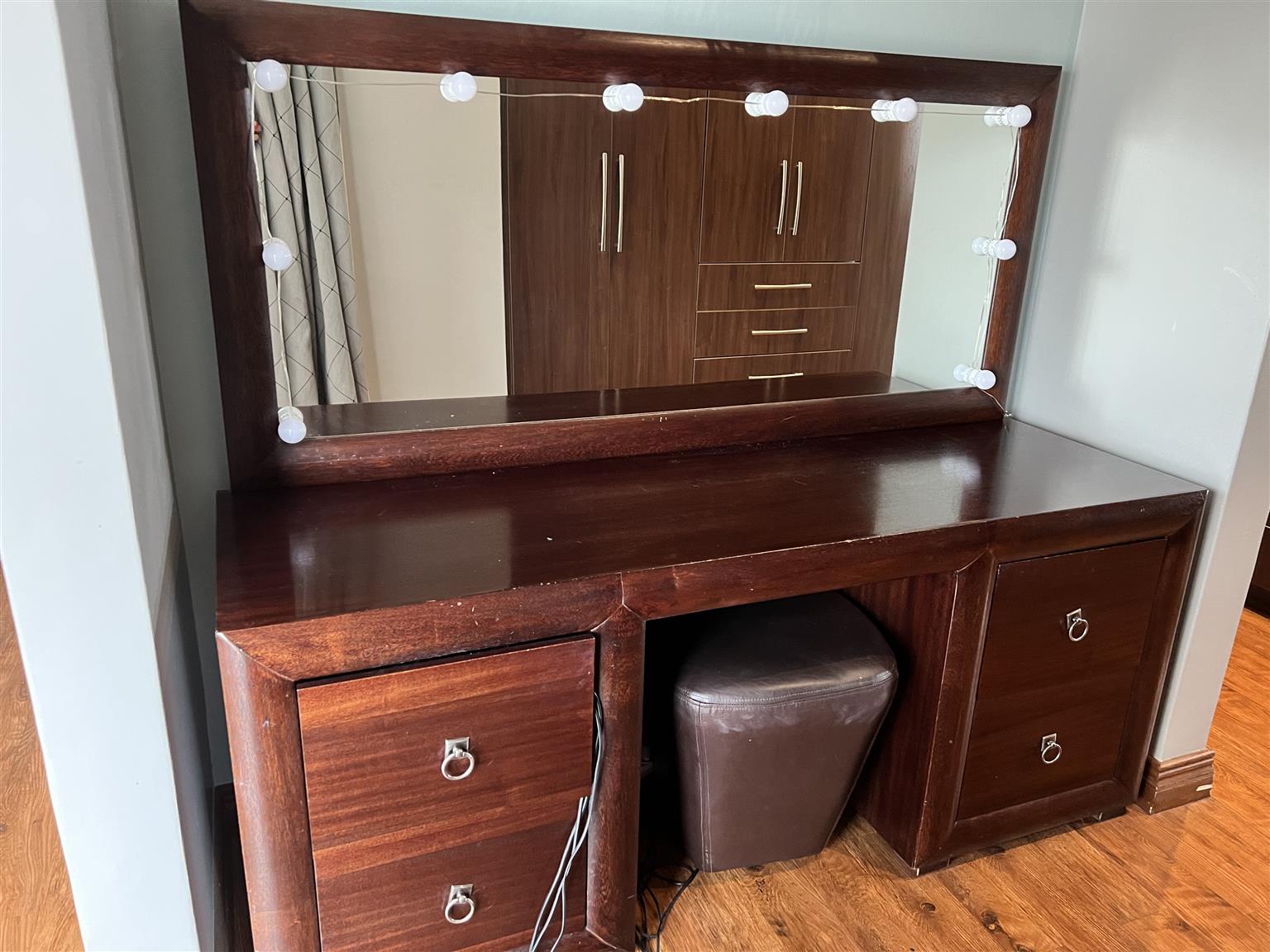 Mahogany queen/king size headboard, with 2 bedside tables, and matching dressing table with stool