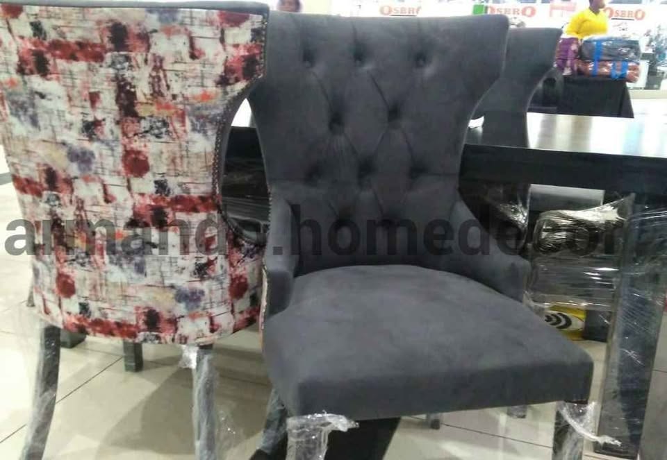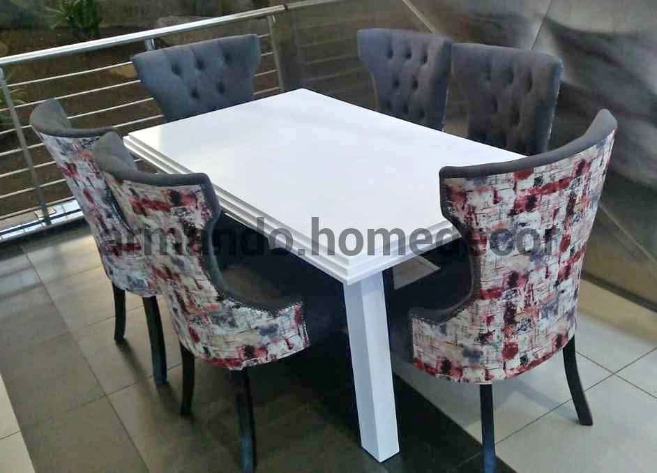 New grey and whitedining set Grey velvet chairs with a pattern fabric on the back and black legs. These beautiful winged chairs have decorative studs on the back and buttons on the front. White painted wooden table. Chairs R1000 each Or 6 chairs and table R7500 *Option to change to plain grey velvet chairs for the same price. * Collection in Midrand Or we can deliver with cash on delivery. WhatsApp for more info Please see my other adverts.