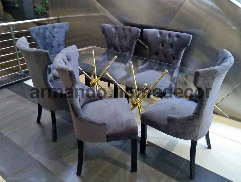 New glass dining table with velvet winged chairs Glass table has option of Gold legs or silver legs Approx 80x160cm Each grey velvet winged chair has buttons on the front and a stud design on the back. The chairs have black legs 4 chairs and table from R5000 6 chairs and table from R7000 Chairs and table also available separately Collection from the store in Midrand Or Delivery available with cash on delivery Please WhatsApp to order.