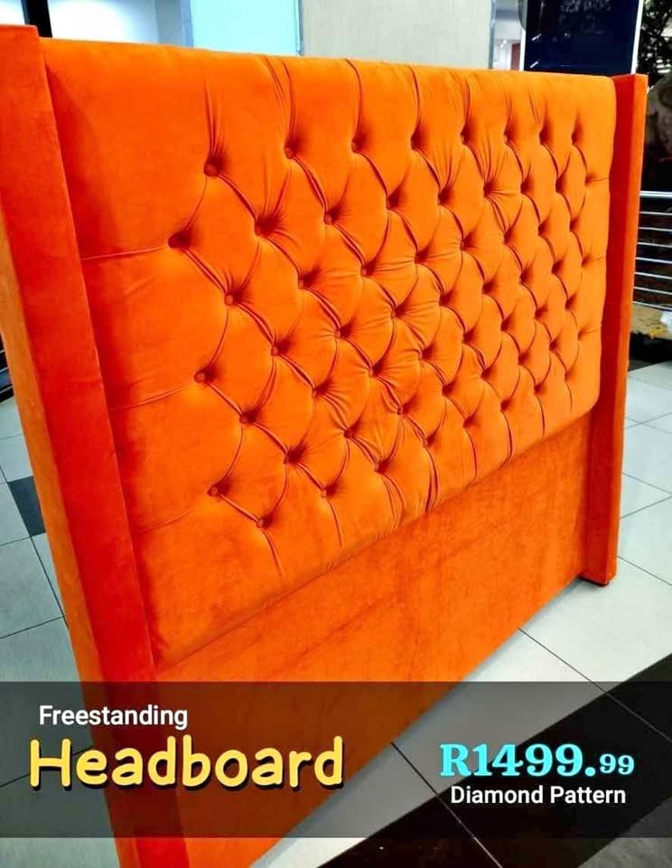New orange velvet headboard Winged design to hug your bed Padded with a button design. This headboard is freestanding. Simply put against the wall and put your bed. No drilling needed. Collection in Midrand or we can deliver with cash on delivery. Please WhatsApp to order. Other colours also available. Please note: Colours may appear a little different on screen.