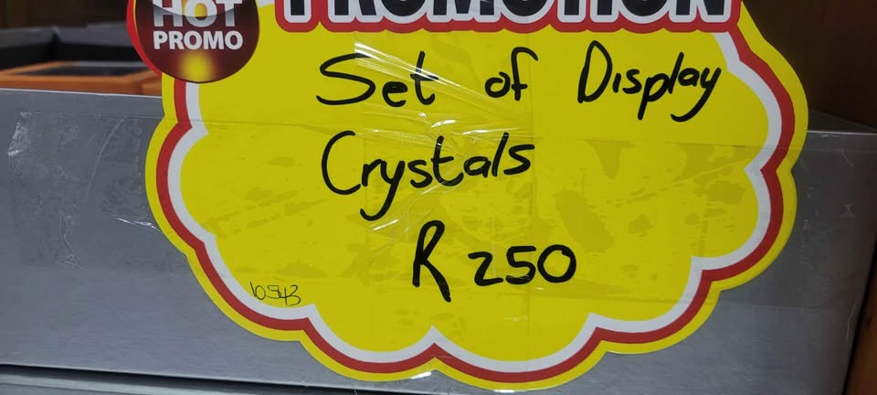 Set of Display Crystal's (10543) @ R 250 Valhalla Bargain Centre, 29 Hekla Rd, Shop No 8, Valhalla Centurion. Cell No: ... WhatsApp : ..... Open from Mondays to Fridays from 08H00 until 17H00 Saturdays open from 08H00 until 11H00. Closed on Sundays & Public Holidays