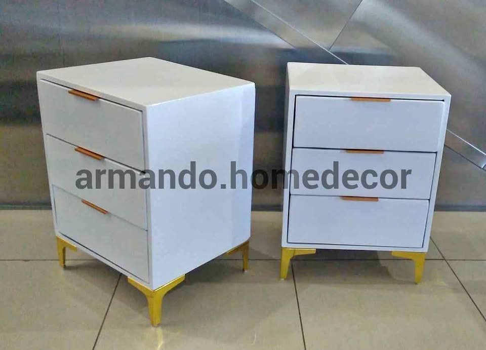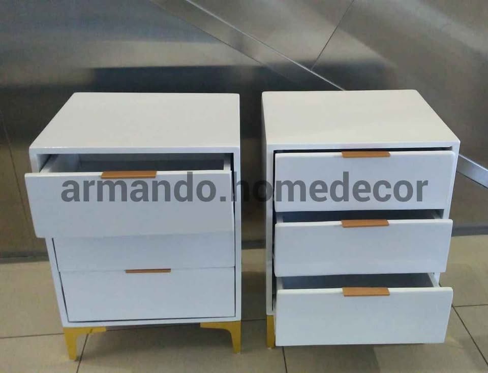 Set of 2 tall bedside tables. Made of white wood with golden handles and legs. These 3 drawer pedestals are already assembled. Online sale R1500 for 2 Or R800 each Collection in Midrand Or delivery available with cash in delivery.