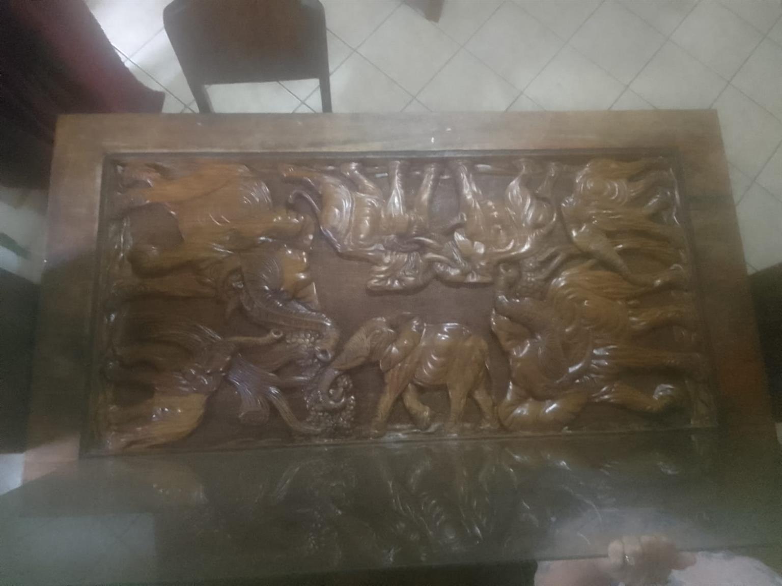 6 seater dining room suite engraved by hand with elephants and Glass top. Plain chairs