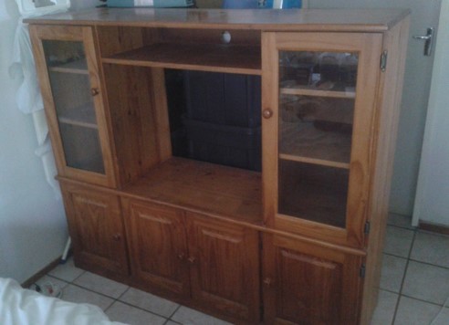 Solid pine, not veneer, in very good condition. Width = 1.68m, height = 1.37m; TV space is 80cm W x 60cm H. Shelf for DStv decoder, DVD Player, etc plus 2 cupboards with shelves & glass doors as well as 3 cupboards with wooden doors. Collect from Hartzenbergfontein, Walkerville (off R82) any time.
