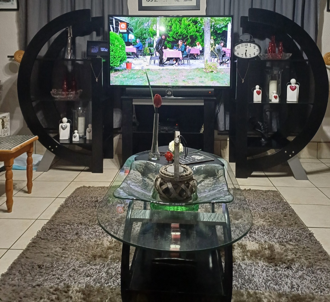 3 piece black tv stand with matching coffee table. Good condition. Selling as new home to small.