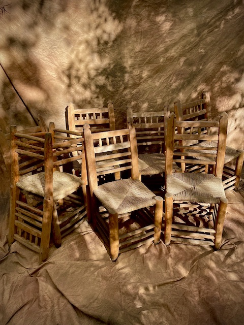 7 Moroccan hand made artisanal wooden chairs with palm plus one more water damaged.