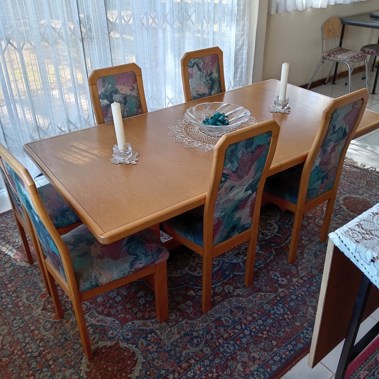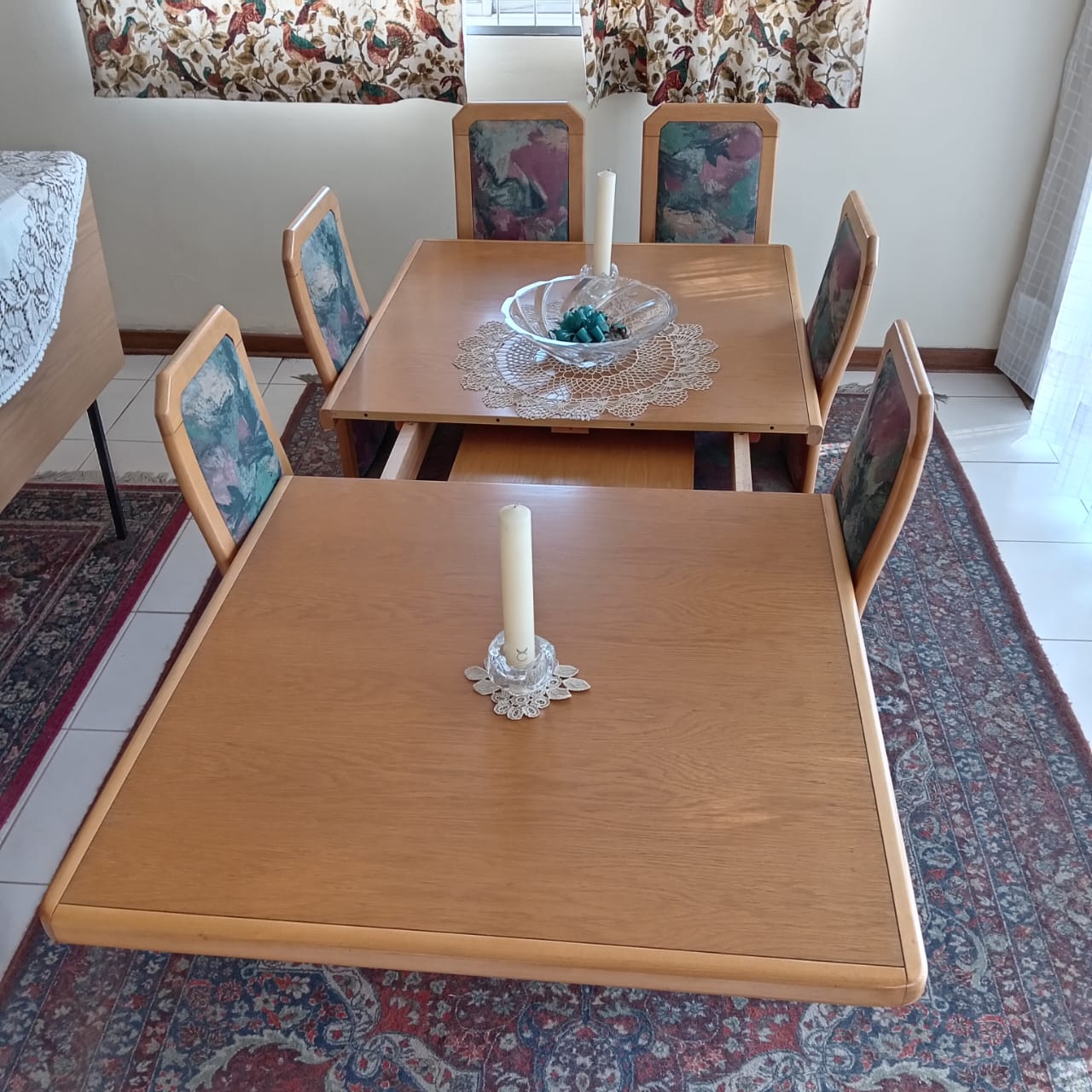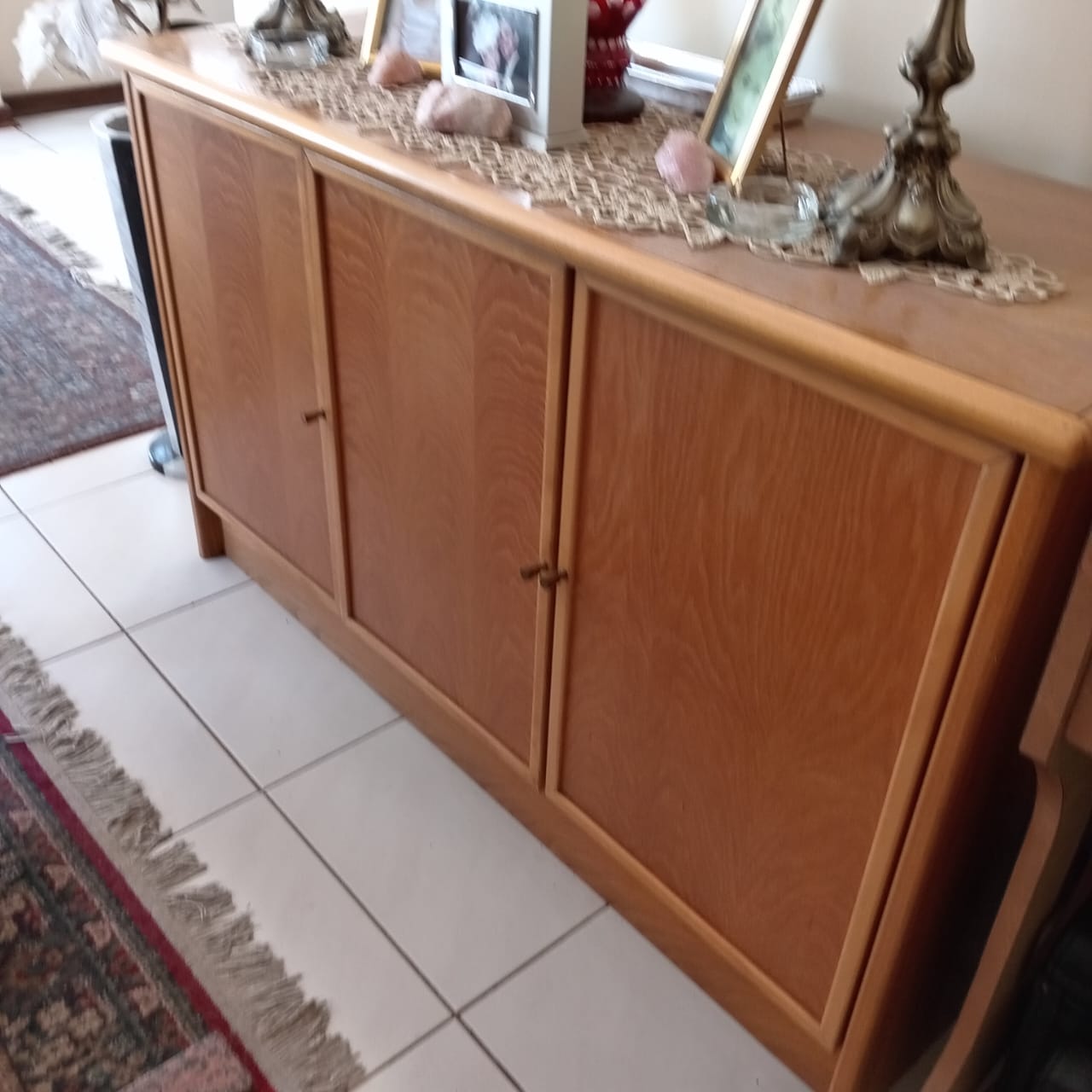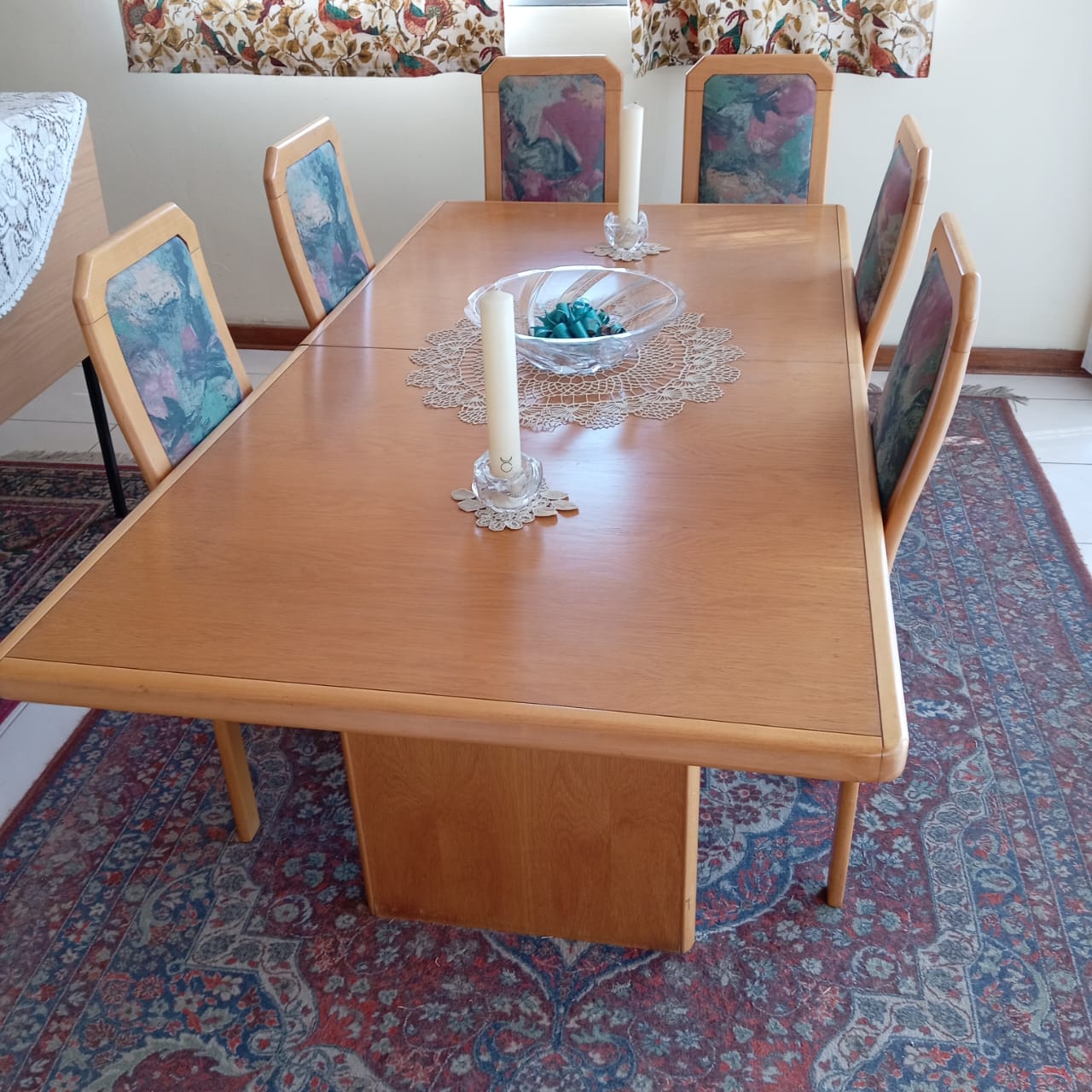 Dining room vintage solid wood table with chairs extends to a 12 seater length, sold with chairs as well as a three doors chest with drawer and shelves.