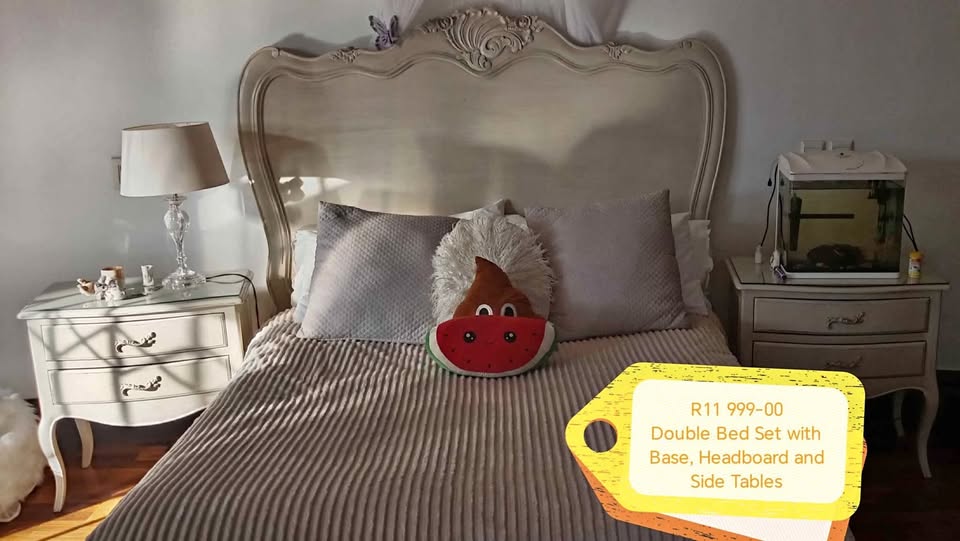 Excellent condition double bed set Price includes the base of the bed, headboard as well as side tables Collection in Bedfordview. Delivery can be arranged at an additional cost. Serious buyers only please. Contact Jackie on if interested