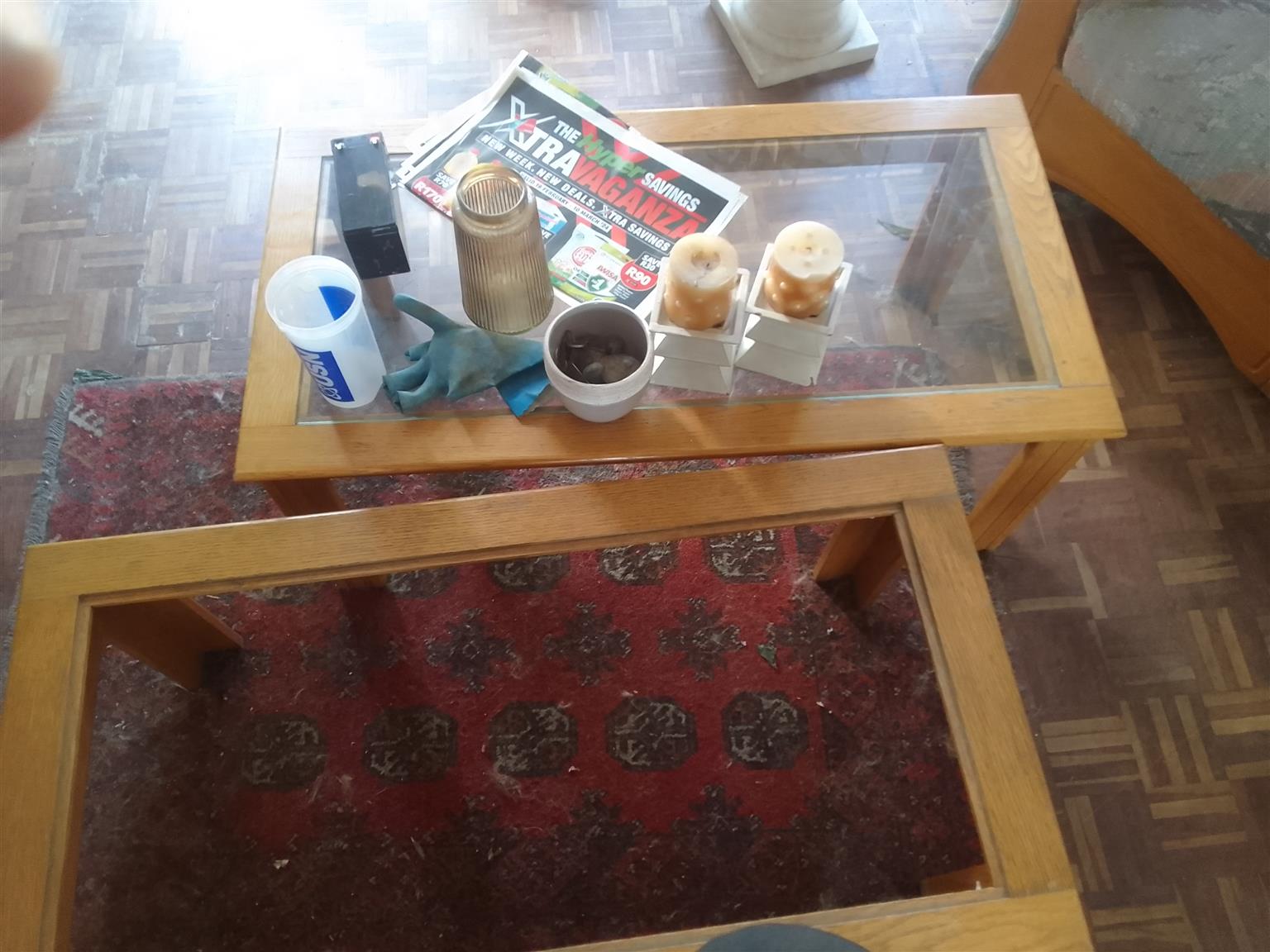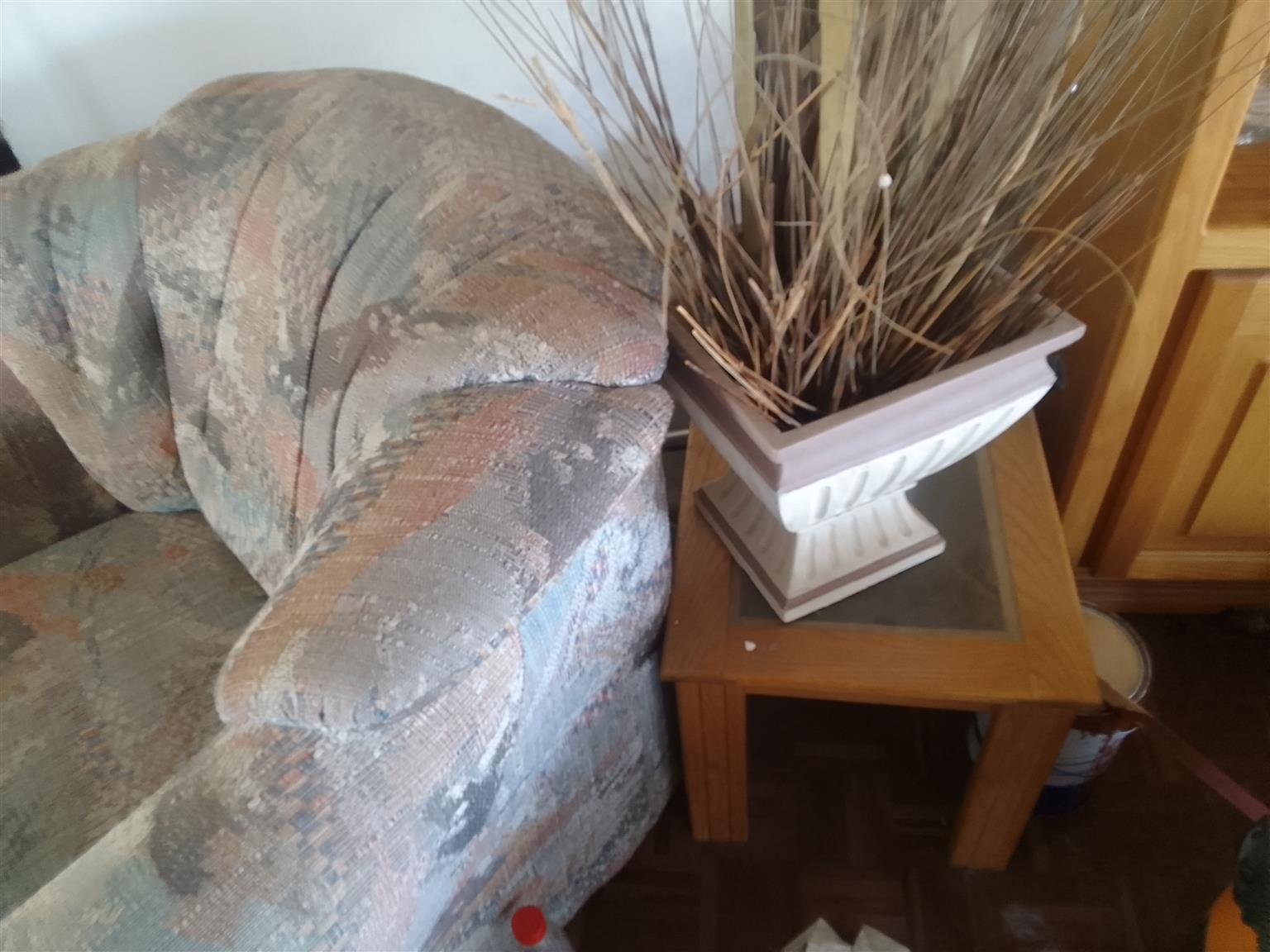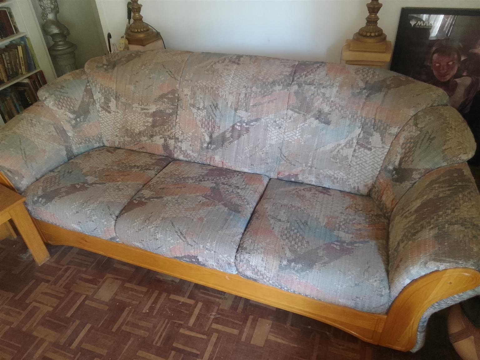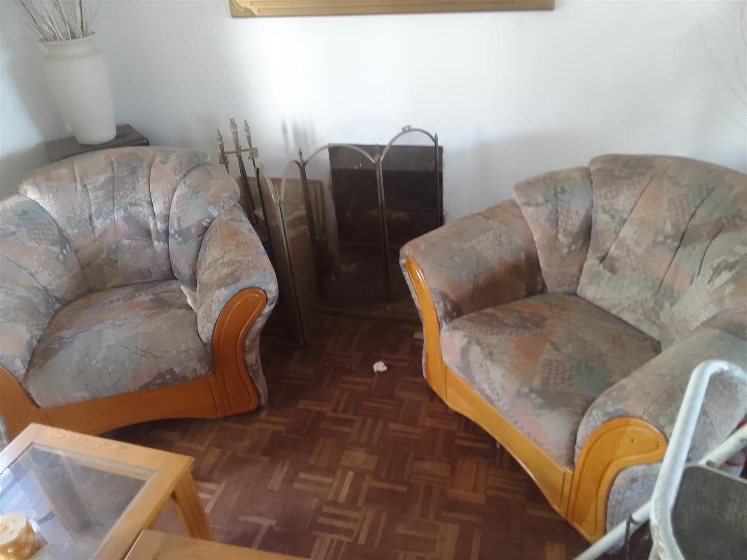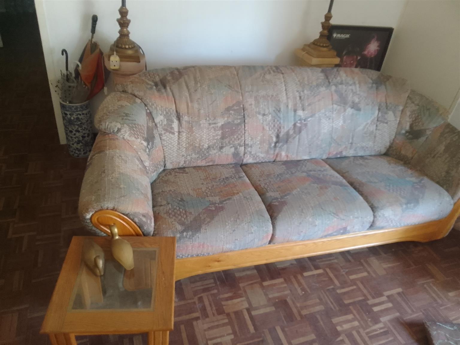 Lounge suite Solid Oak - One 3 seater, Two 1 seaters, Two side tables, Two coffee tables (1 with no glass) - R10,000 ONCO