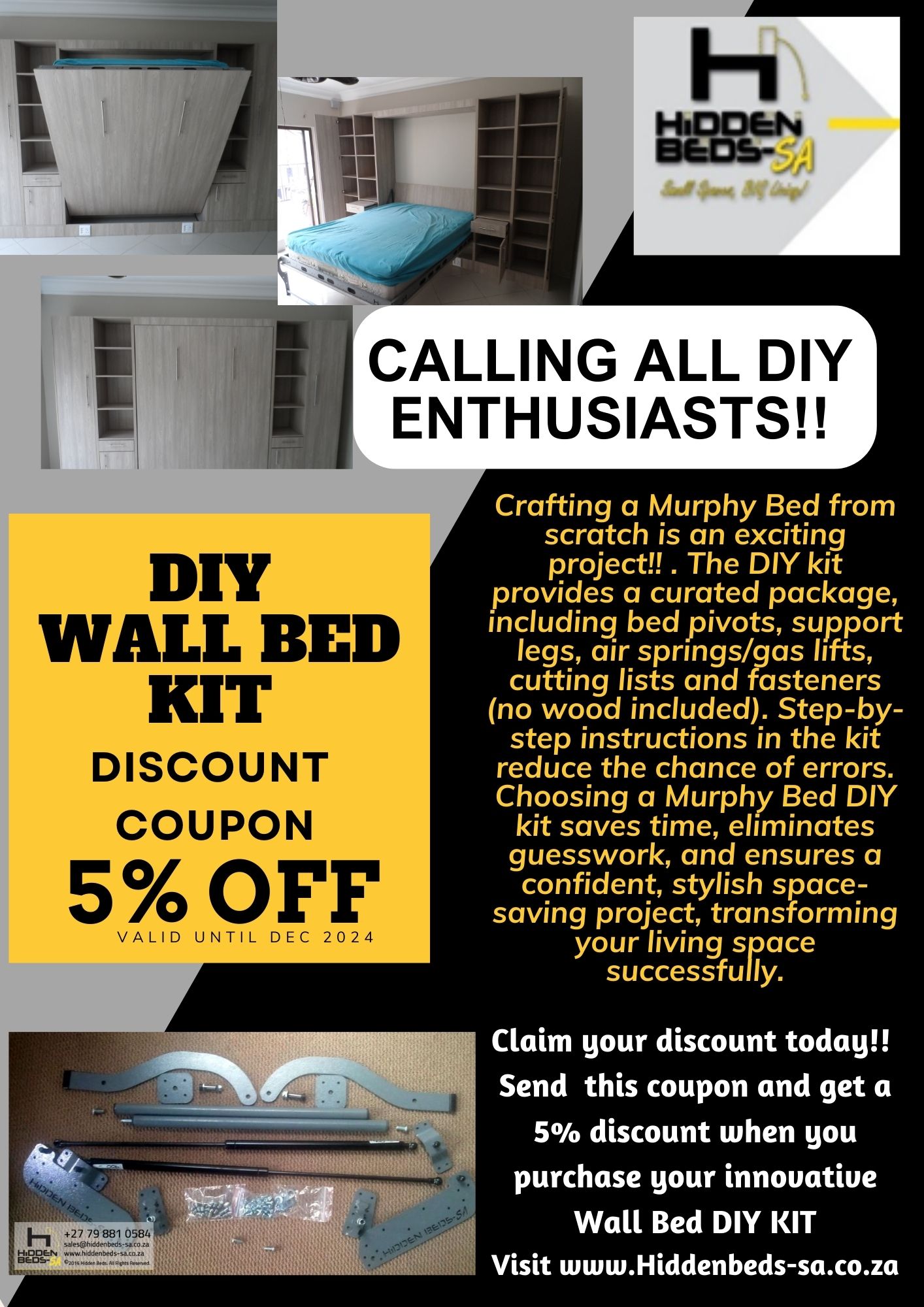 Create your own Wall Bed with our DIY Kit!! The DIY kit provides a curated package, including bed pivots, support legs, air springs/gas lifts, cutting lists and fasteners (no wood included). Step-by-step instructions in the kit reduce the chance of errors. Choosing a Murphy Bed DIY kit saves time, eliminates guesswork, and ensures a confident, stylish space-saving project, transforming your living space successfully.