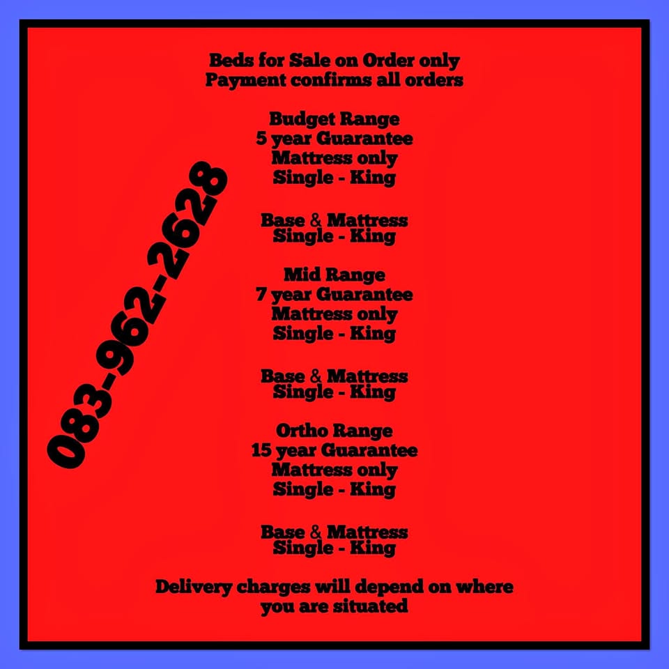 Beds for sale Whatsapp Mattress only or base & Mattress Single - King size available Budget range - 5 yr guarantee Mid range - 7 yr Guarantee Ortho range - 15 yr Guarantee Payment confirms all orders Delivery fee to be quoted Depending on where you are situated