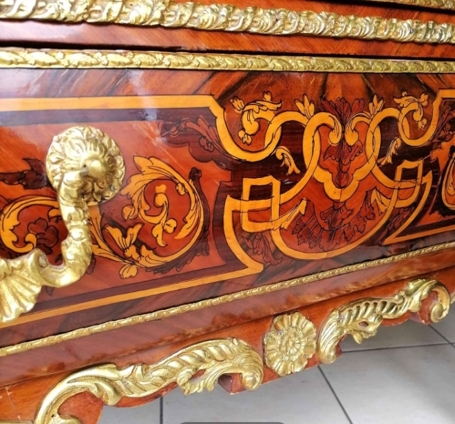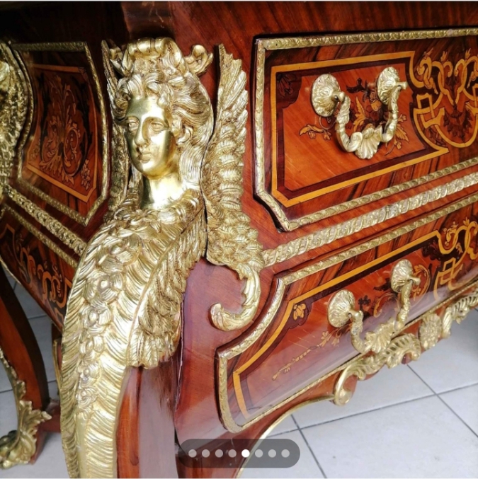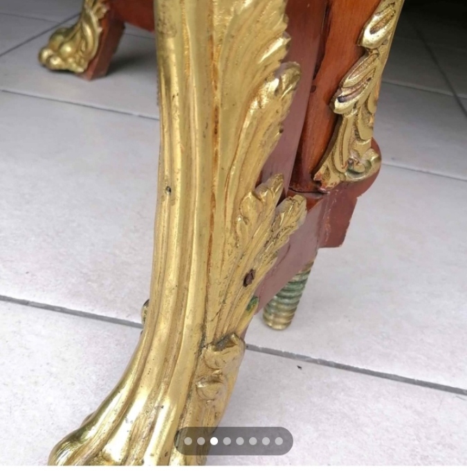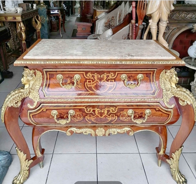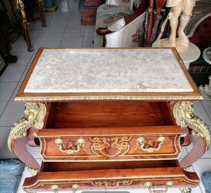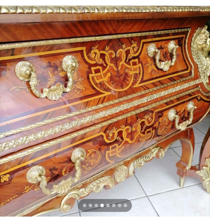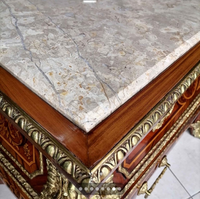 Italian inlay brass carved chest of drawers with marble top. More details:
