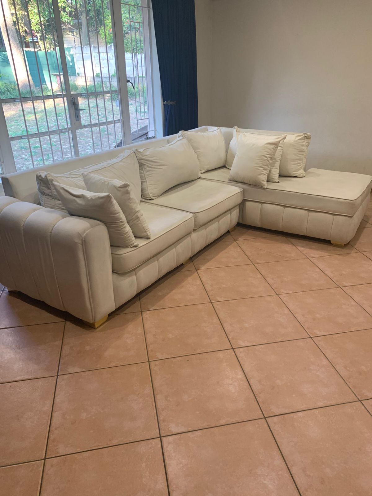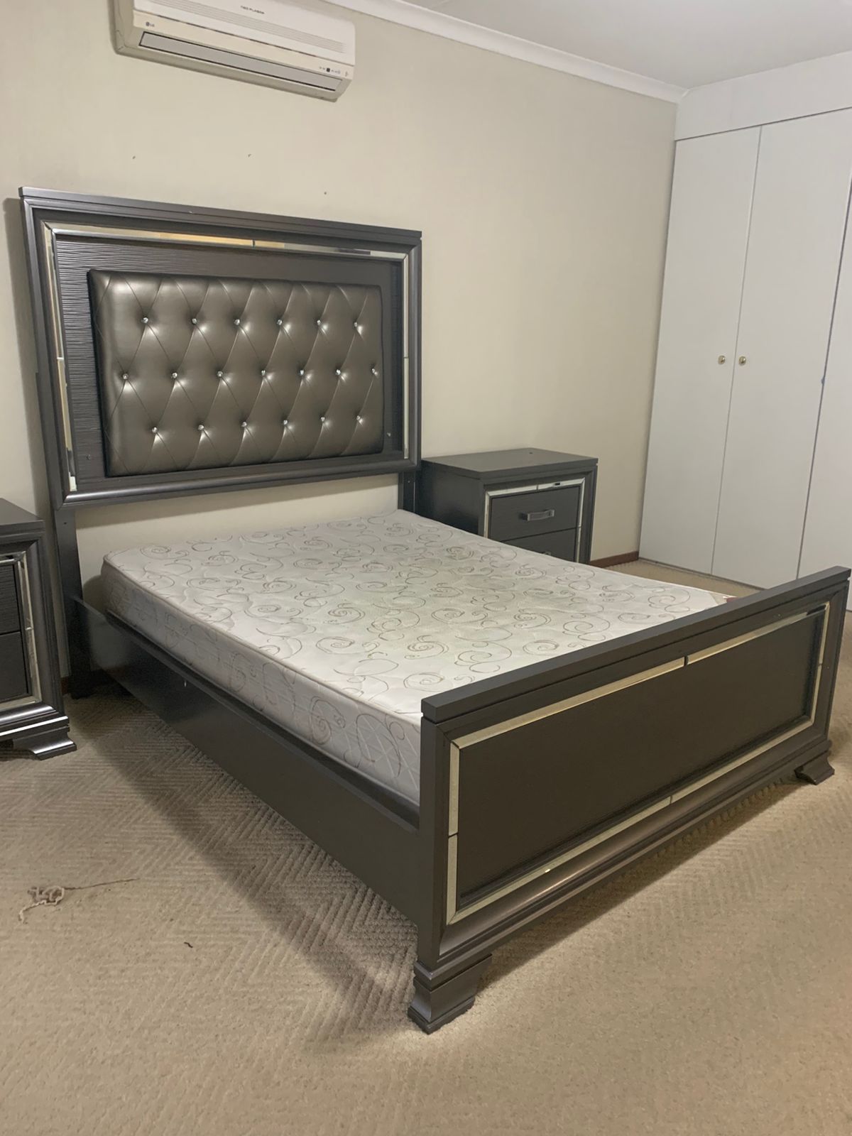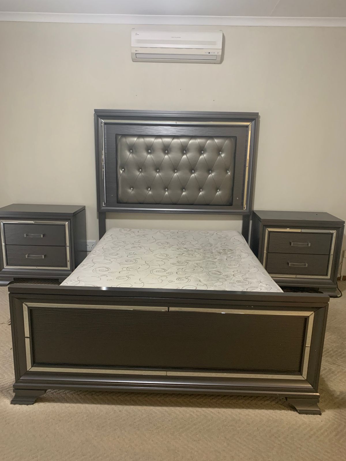 Second hand base, headboard with matching bed pedestals and matching chest of drawers along with a couch for sale.
