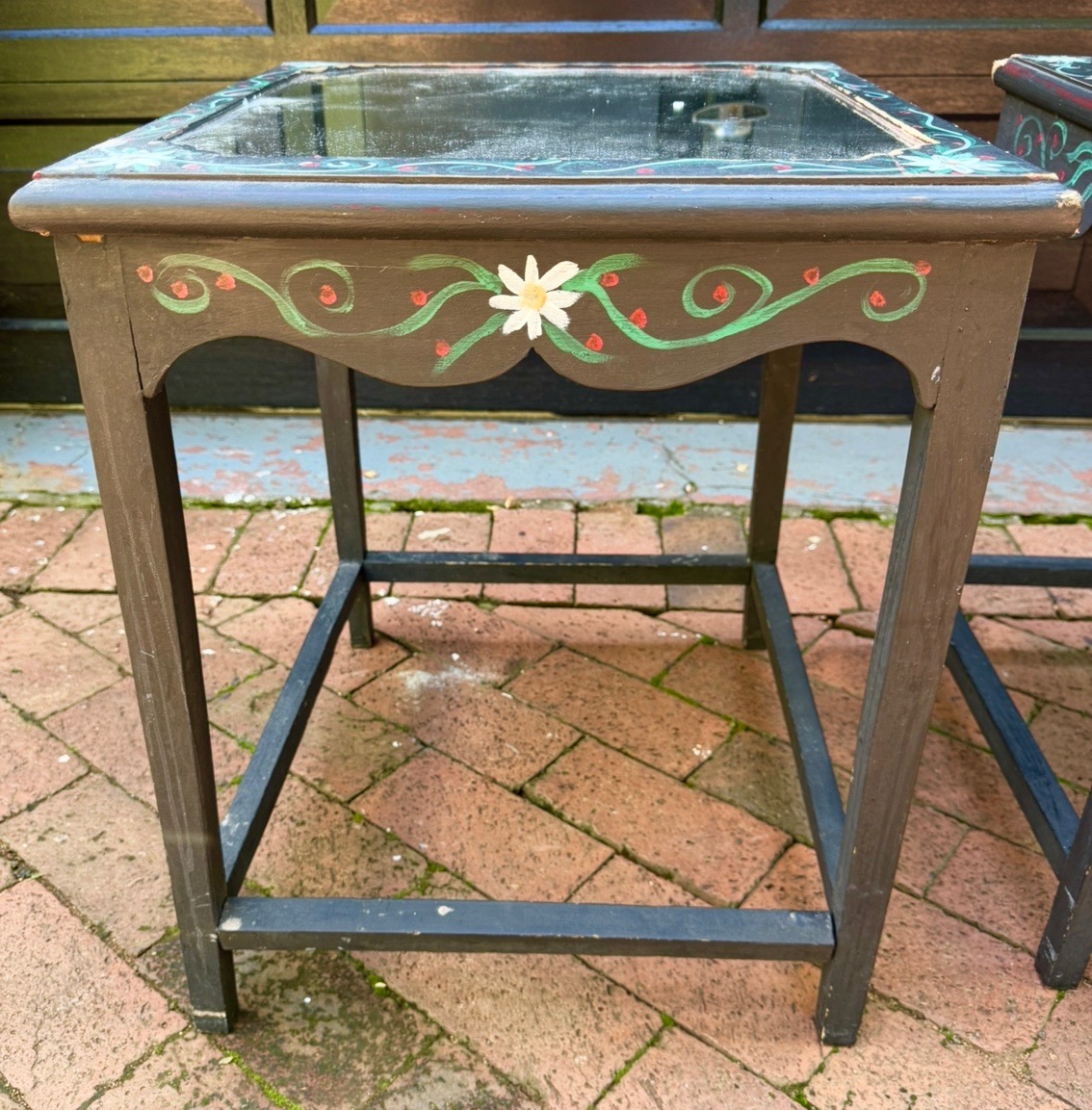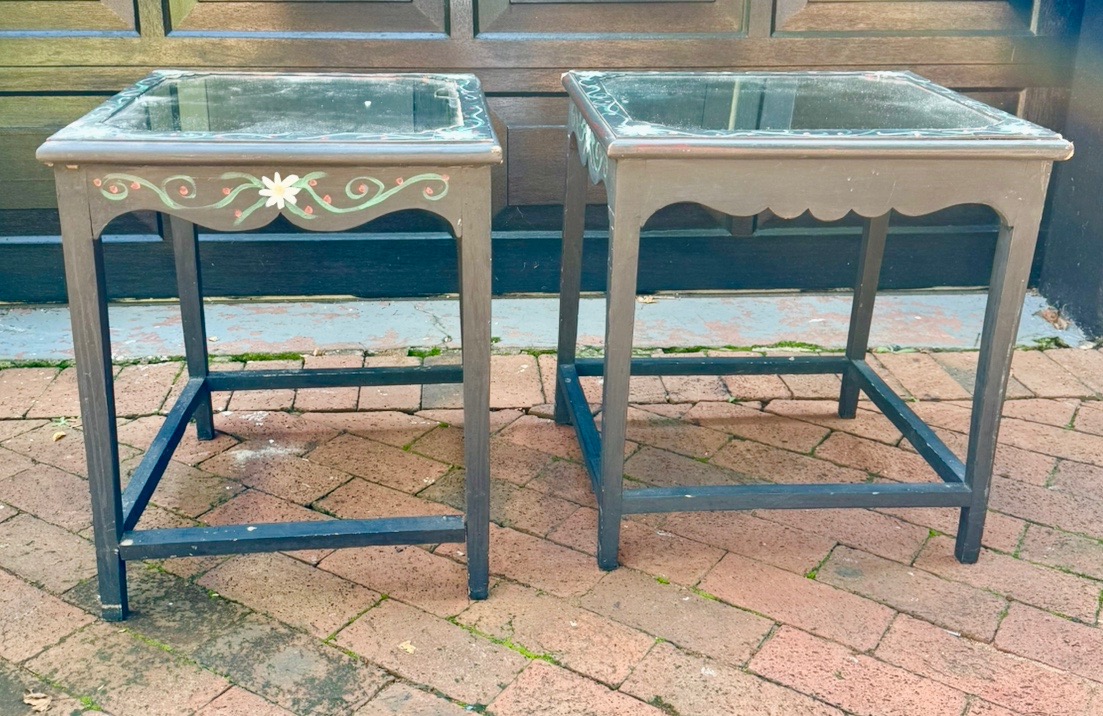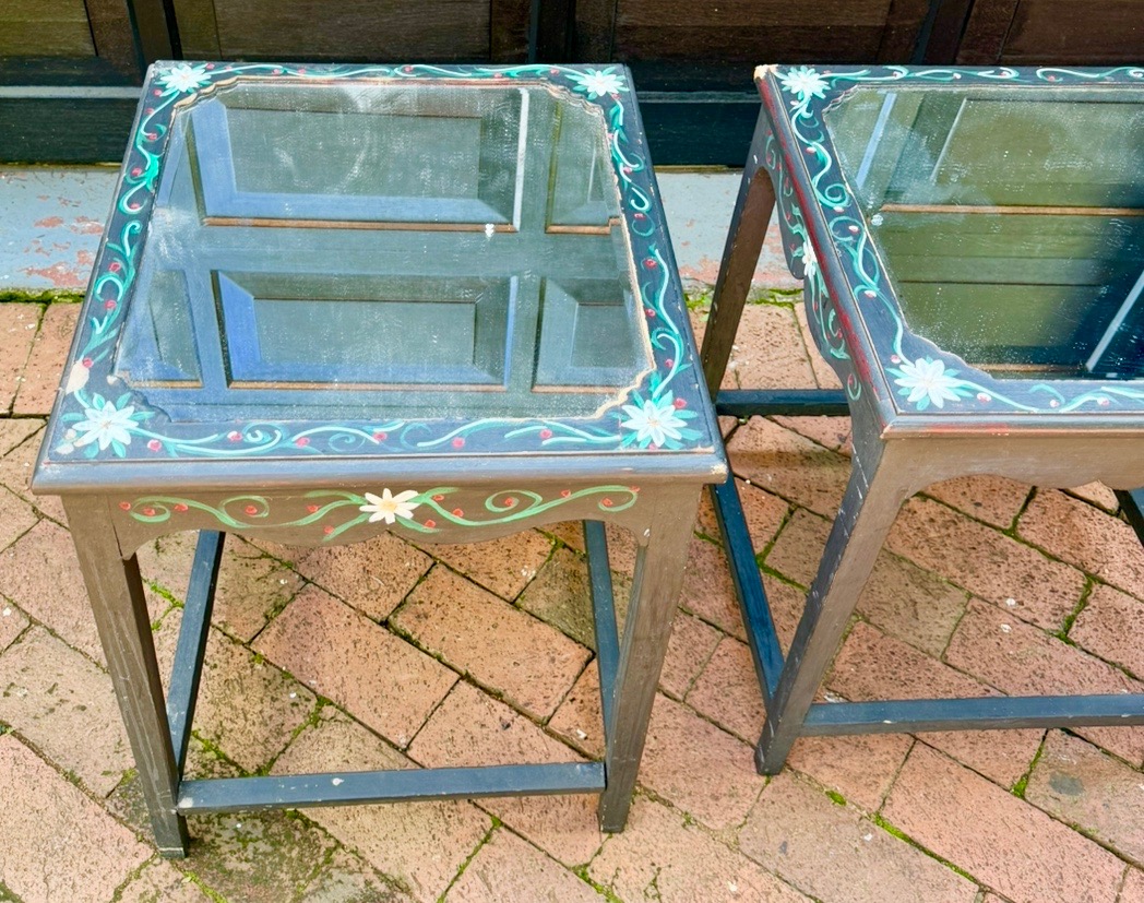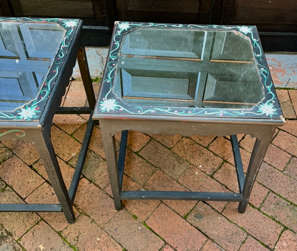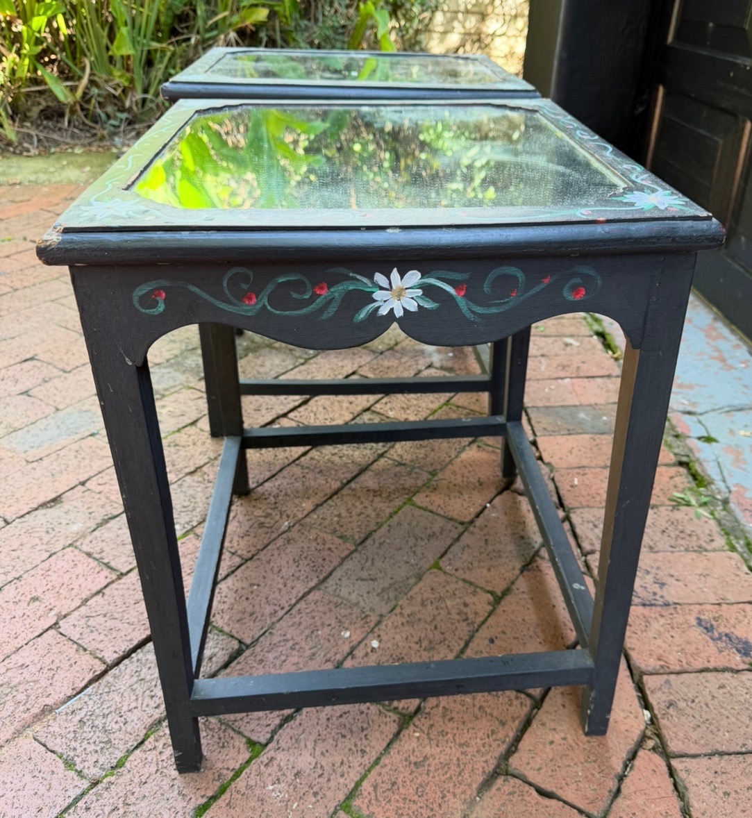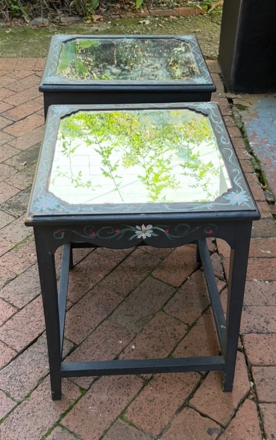 Two wooden, hand painted, bedside tables with mirror tops for sale. Slightly damaged