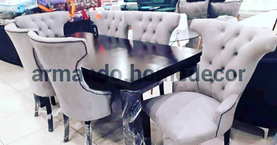 Includes 6 grey velvet winged dining chairs with buttons and studs on the back.