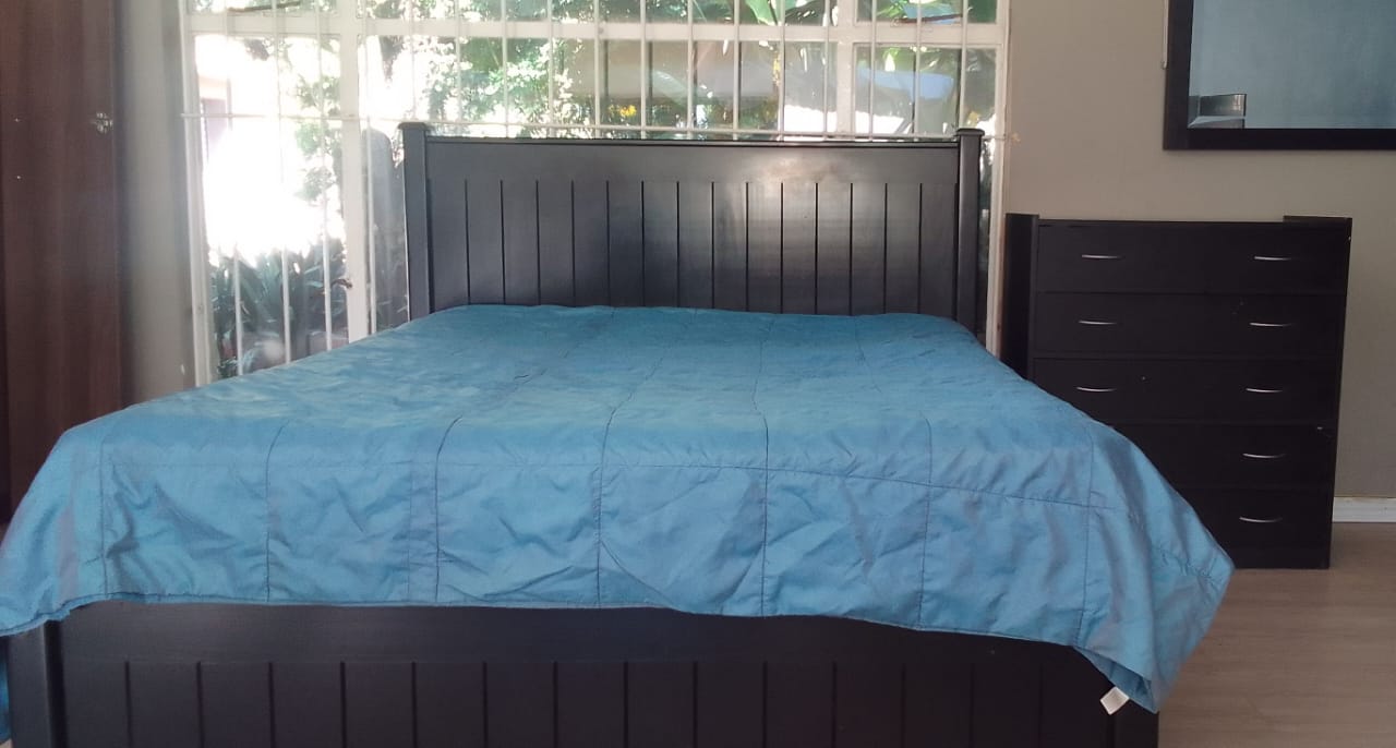 Black queen headboard with mattrass, drawers, ottoman and bookcase