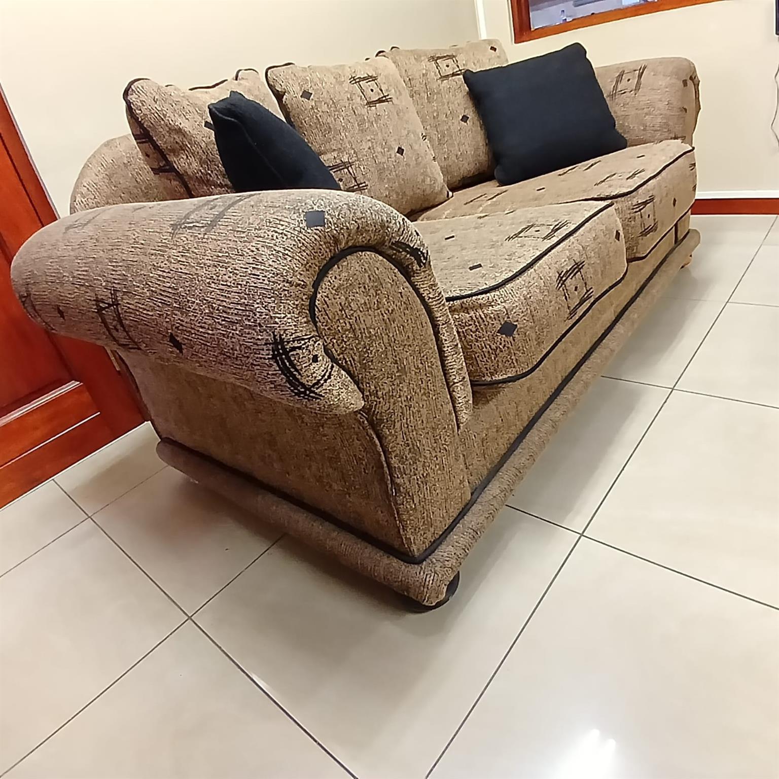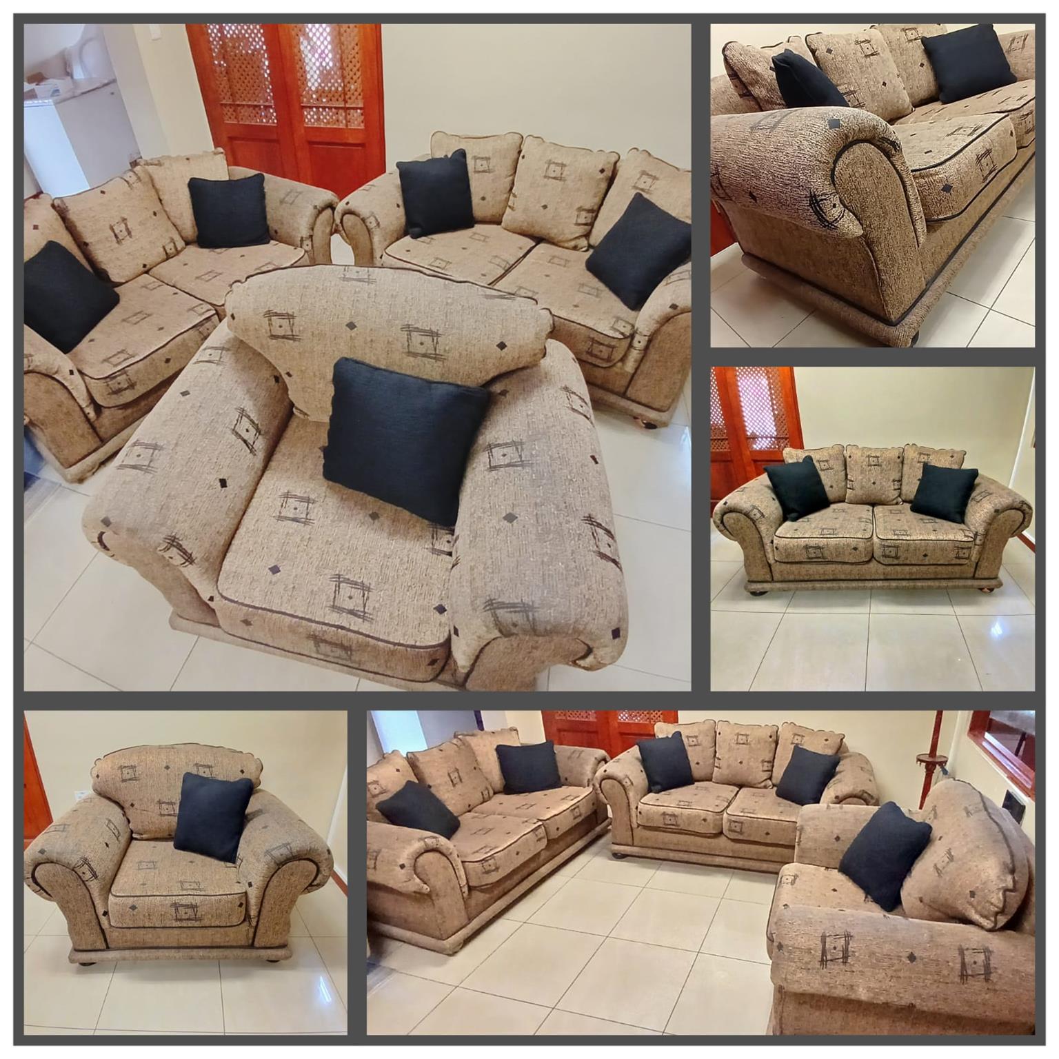 3 piece lounge suite sofa set (2 x 2- seater, 1 x single seater). Excellent condition. Thick upholstery fabric. Includes scatter cushions. Please call or WhatsApp if interested.