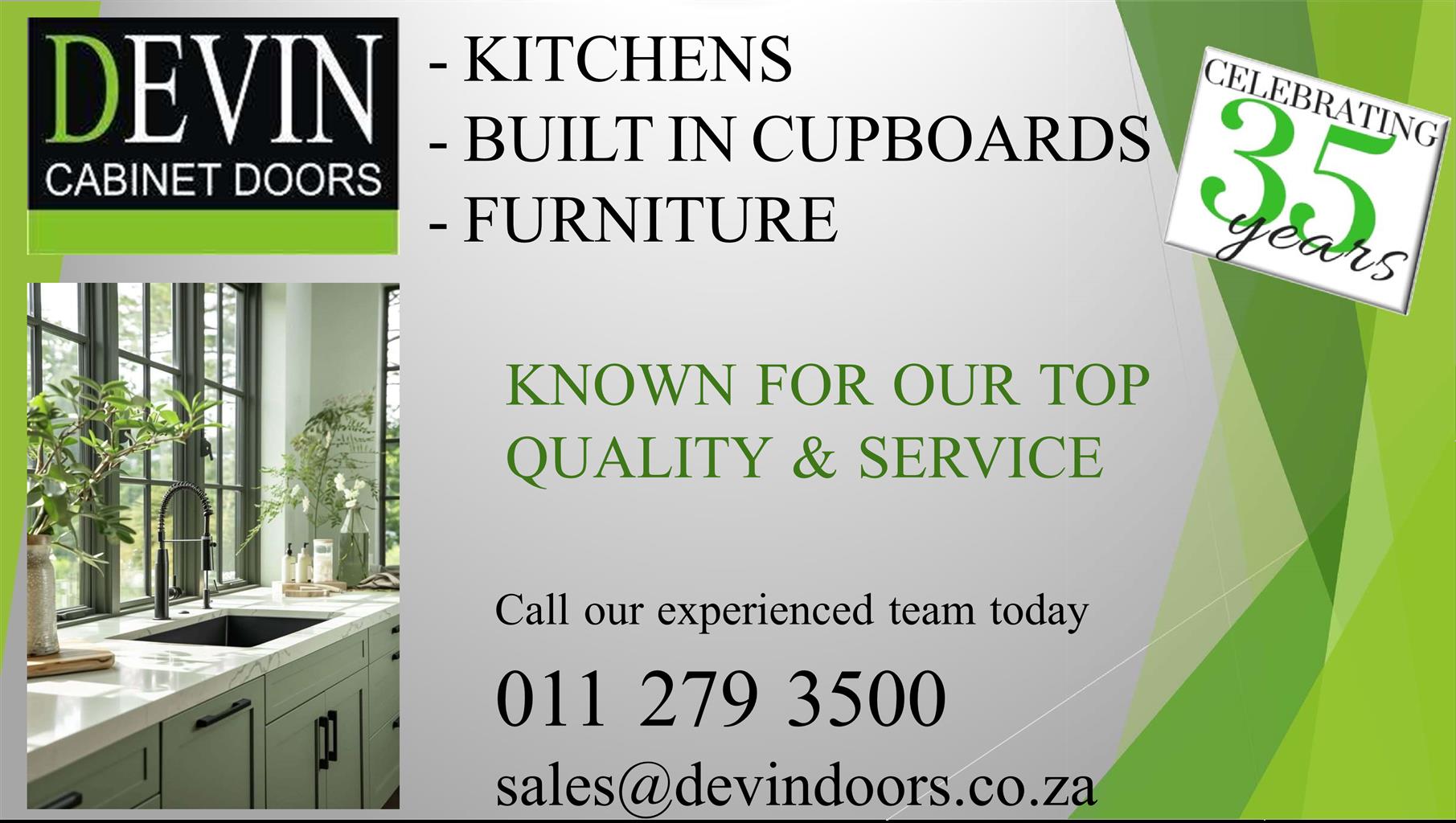 Devin Cabinet Doors was established in 1990 - a specialist in creating quality kitchen and cabinet doors. Our extensive range of products combine functionality with cutting edge designs and state-of-the art finishes. Imported machinery guarantees leading edge technology and quality finishes