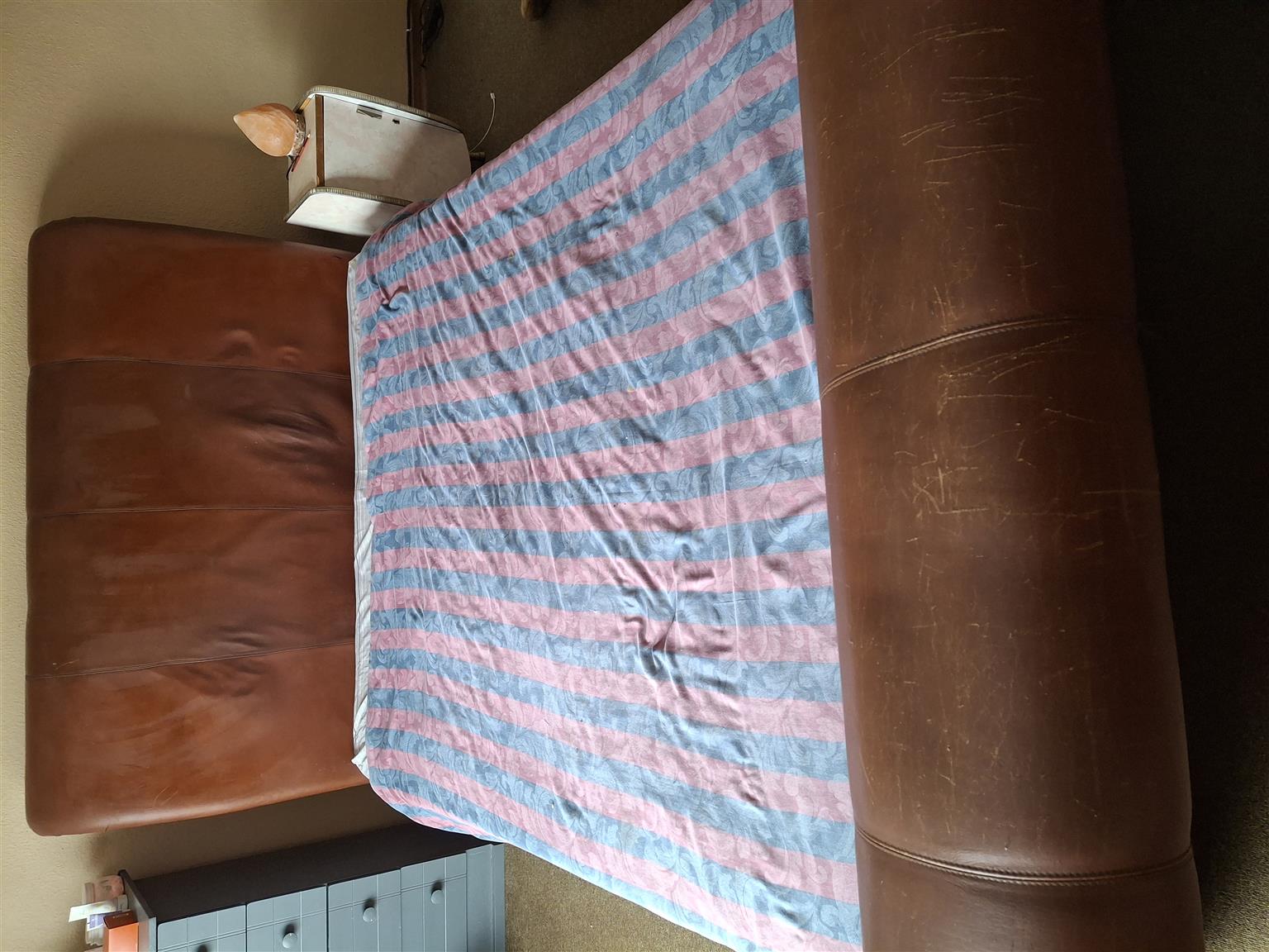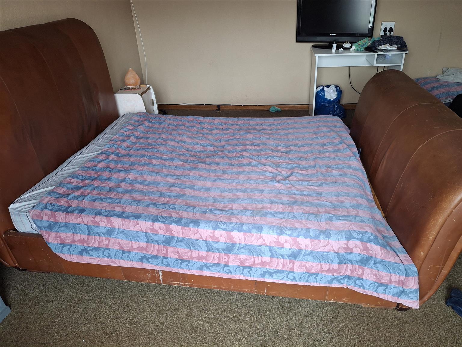 Queen size extra length leather sleigh bed. Leather at base of bed has scratches.