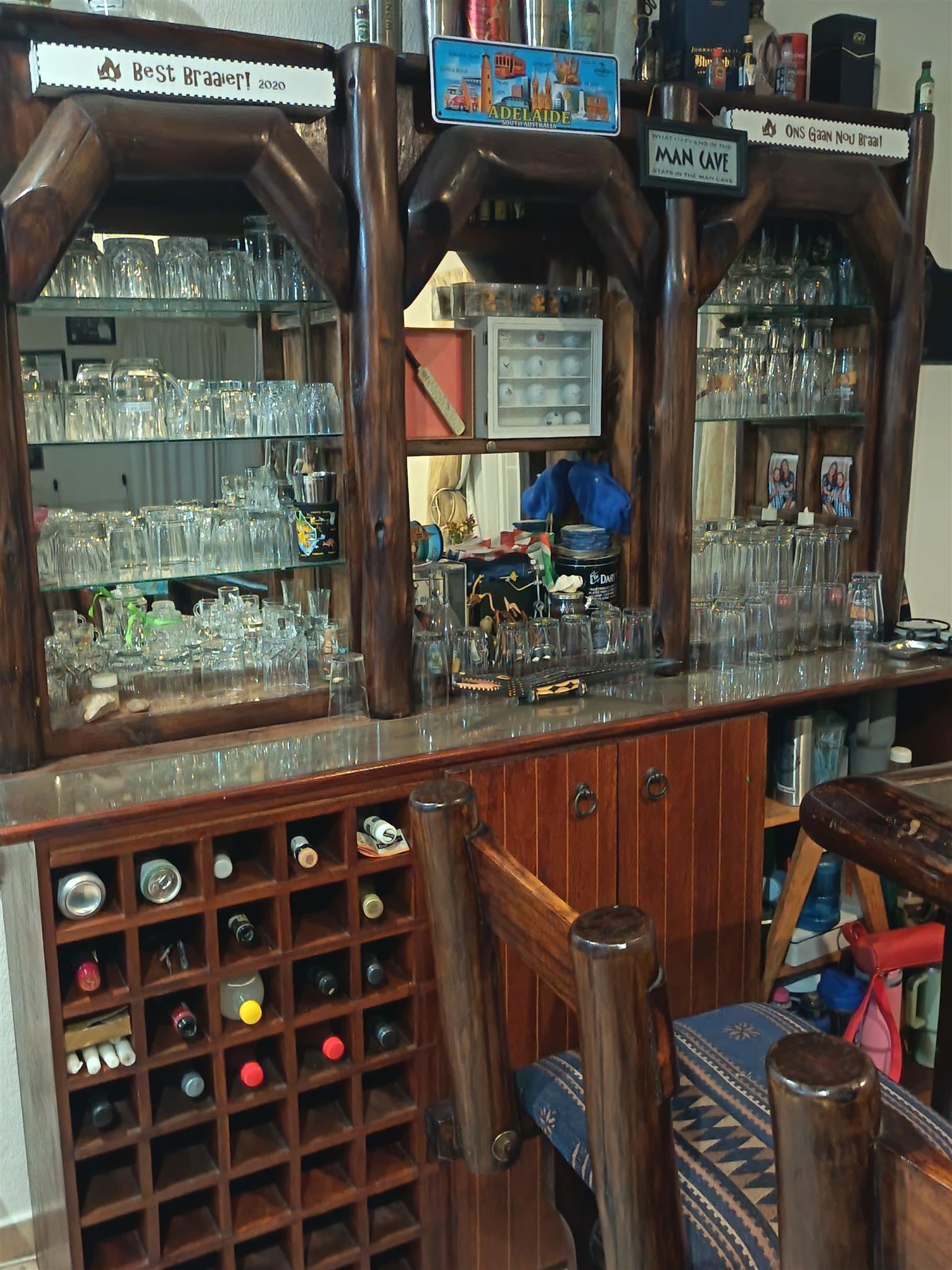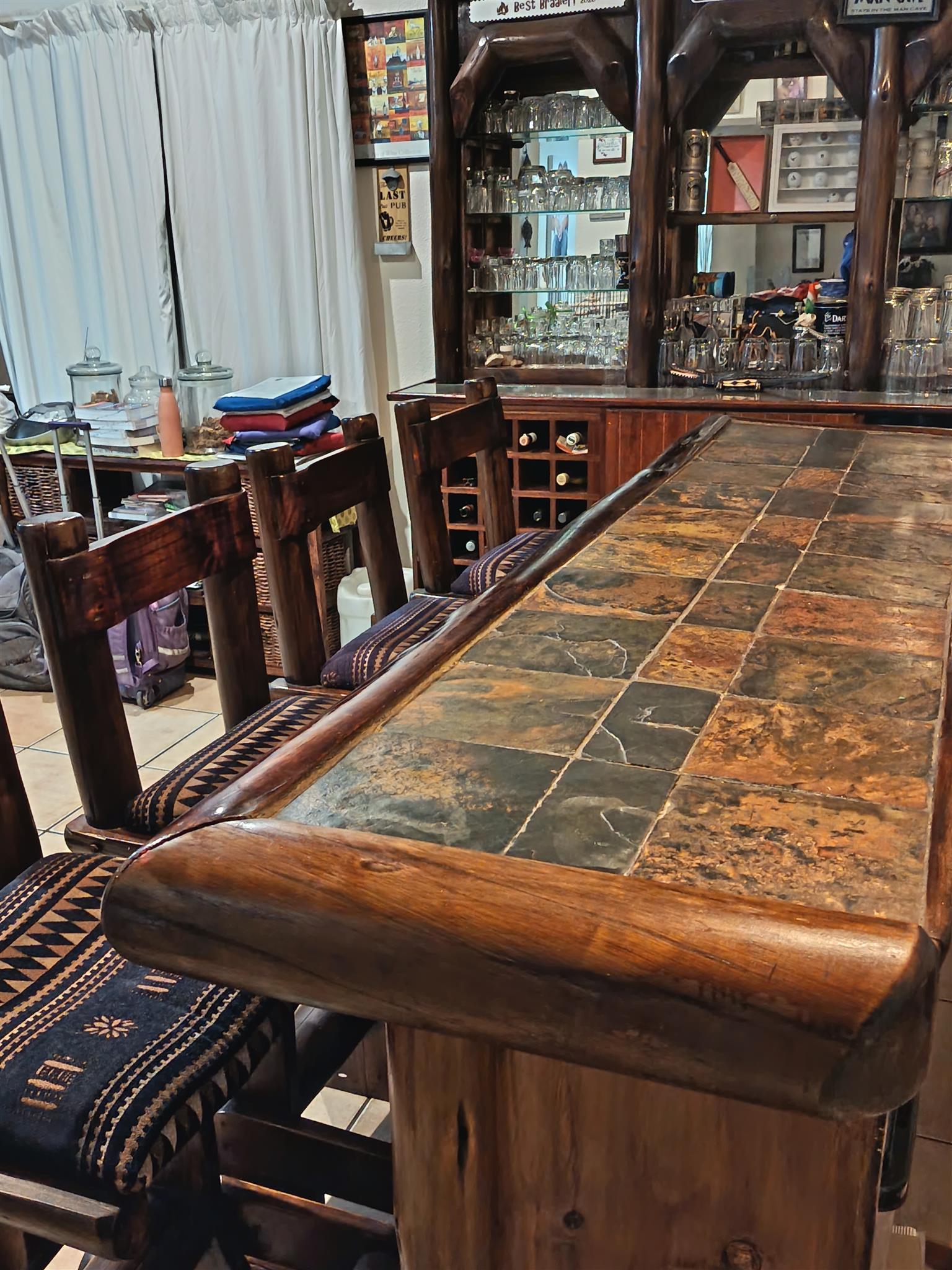 Very neat sleeper wood Bar. 4 chairs and a slate top counter.
