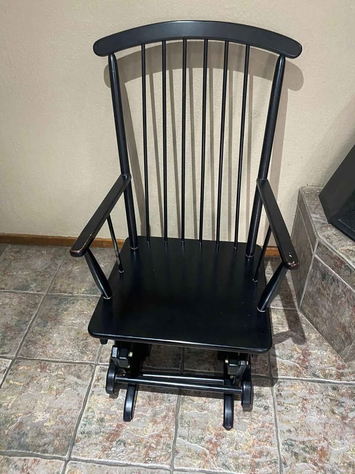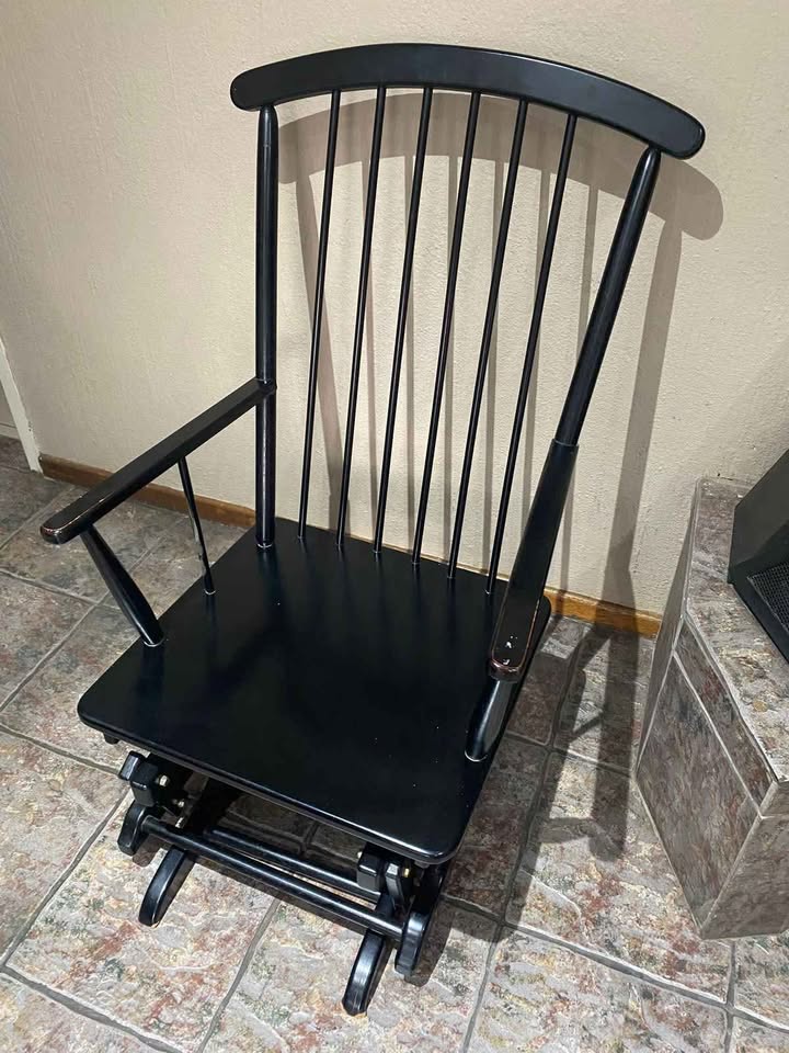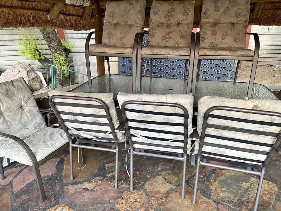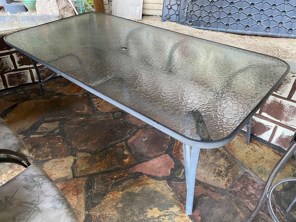 6 seater table and chairs. Glass and aluminum. Also 1 antique rocking chair