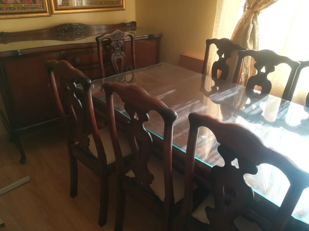 Antique dining room set with side cuboard and glass protection covers. 8 seater in immaculate condition. Bargain buy