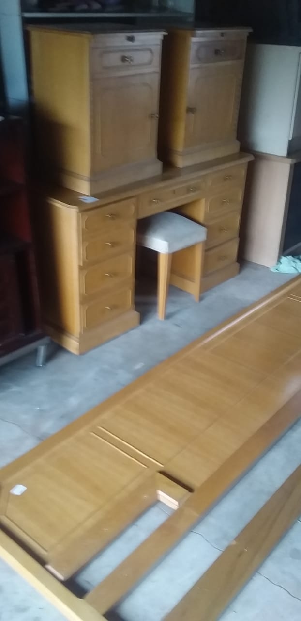 Oak veneer bedroom suite includes dressing table without mirror,upholstered stool 2 pedestals and headboard,call Chris 0798070527view more