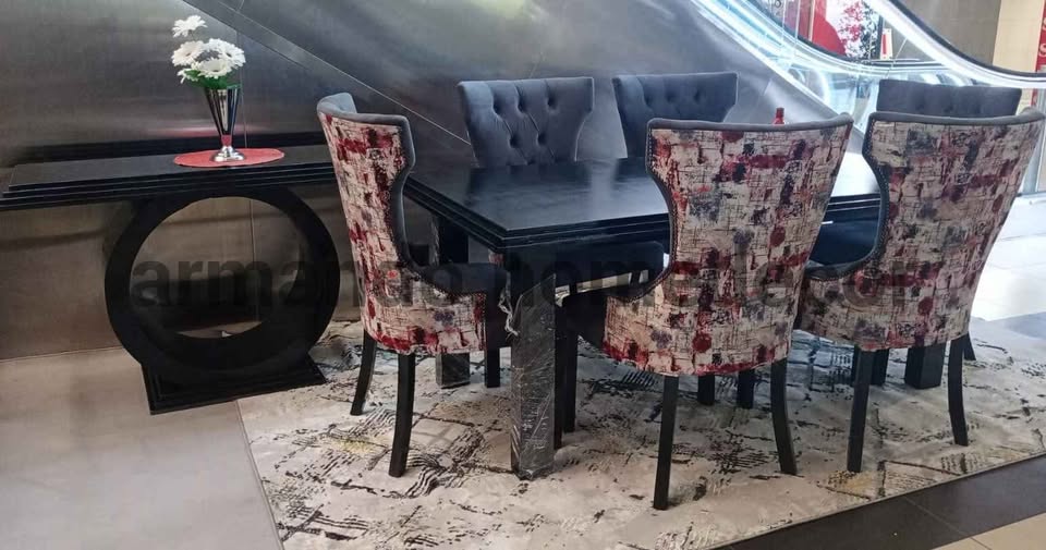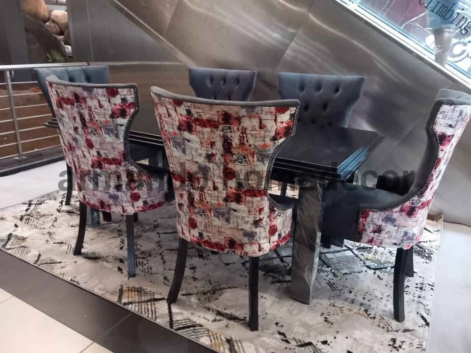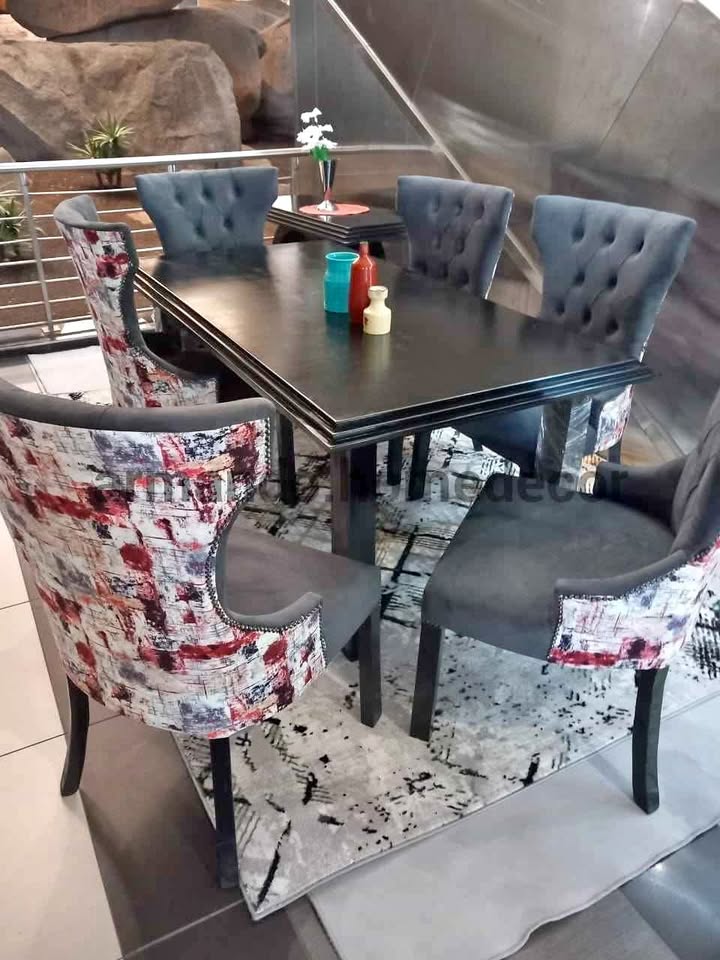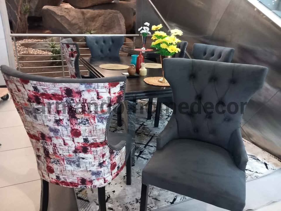 New dining set Grey velvet chairs with a pattern fabric on the back and black legs. These beautiful winged chairs have decorative studs on the back and button on the front. Black painted wooden table. Chairs R1000 each Or 6 chairs and table R7500 Optional server table (last picture) R1800 Accessories / carpet not included. Collection in Midrand Or we can deliver with cash on delivery. WhatsApp for more info Please see my other adverts.