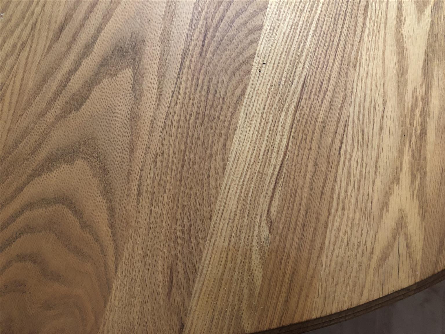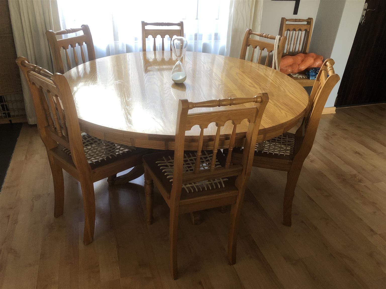 SOLID OAK DINING ROOM TABLE WITH 8 CHAIRS IN VERY GOOD CONDITION SIZE OF TABLE 1.5M. CHAIRS HAS LEATHER STRIPS. RELOCATING.