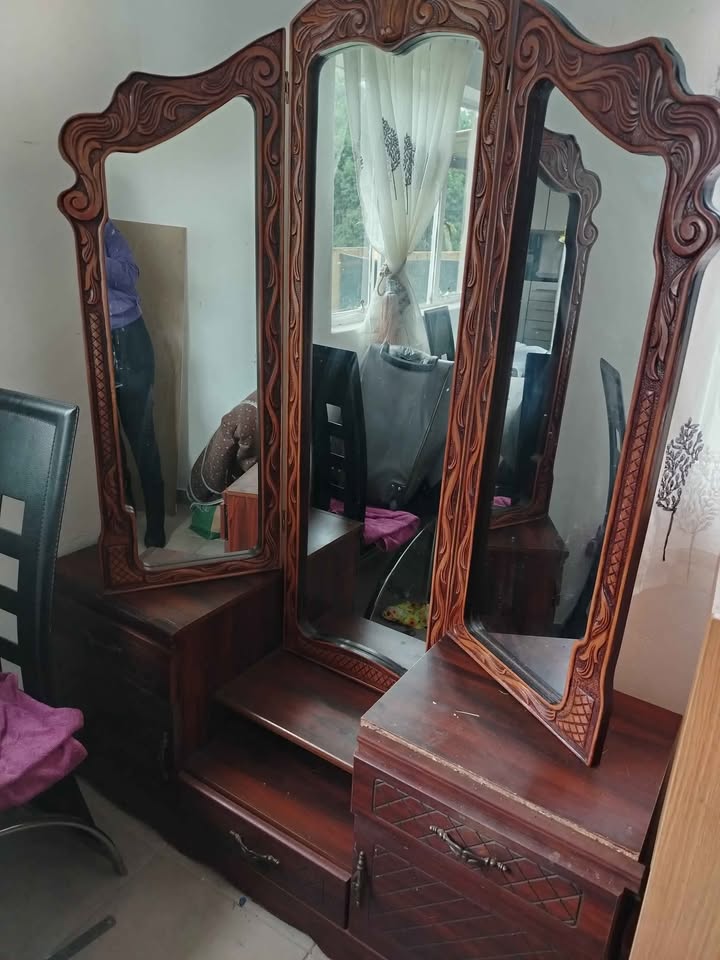 Engraved emboya wood two draws and two cubboard under 3 mirrows