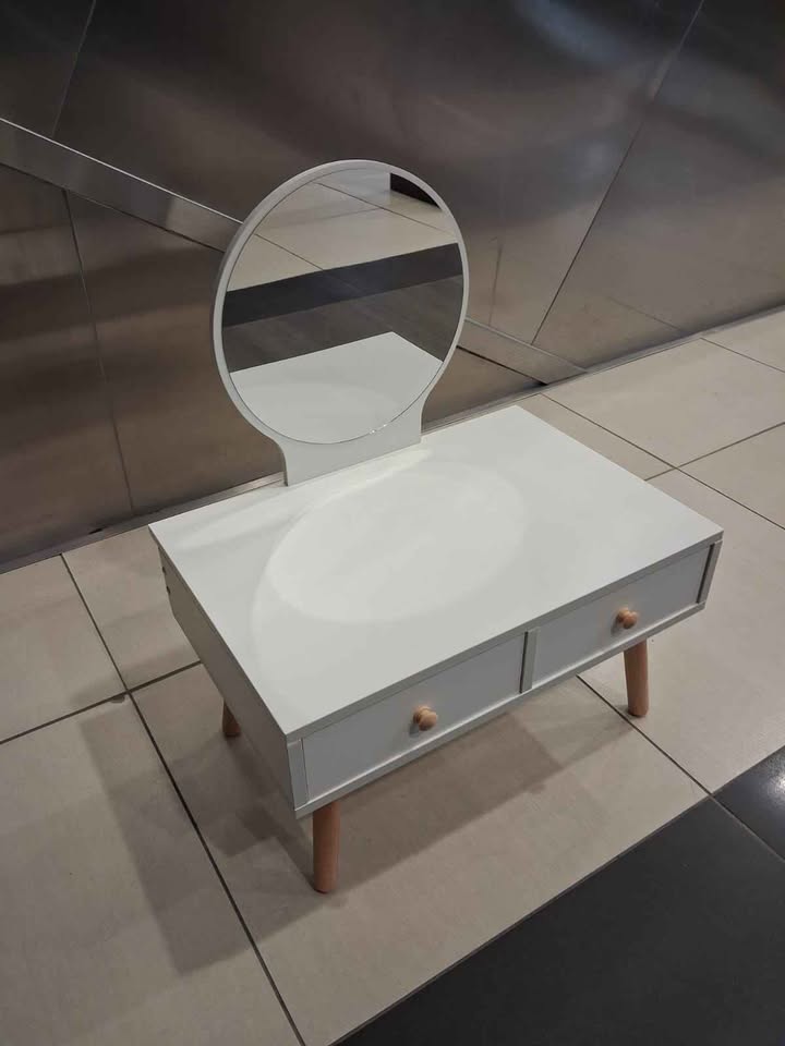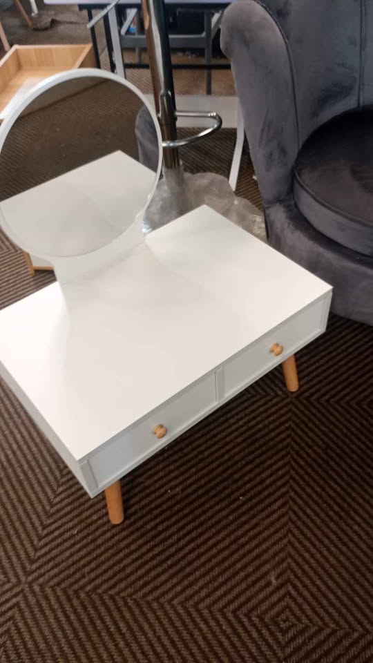 New bedside table with 2 drawers for storage and miror This mini dressee is white with wood colour legs and handles. The drawers are on one side only. Use one on either side of your bed. Or give the kids to use as a small dressing table. *Please note, assembly is needed. It comes flat in the box. You can see the screws on the side when built. Approx 60x40x34cm high (without mirror) R990 Collection is in Midrand Or delivery available.