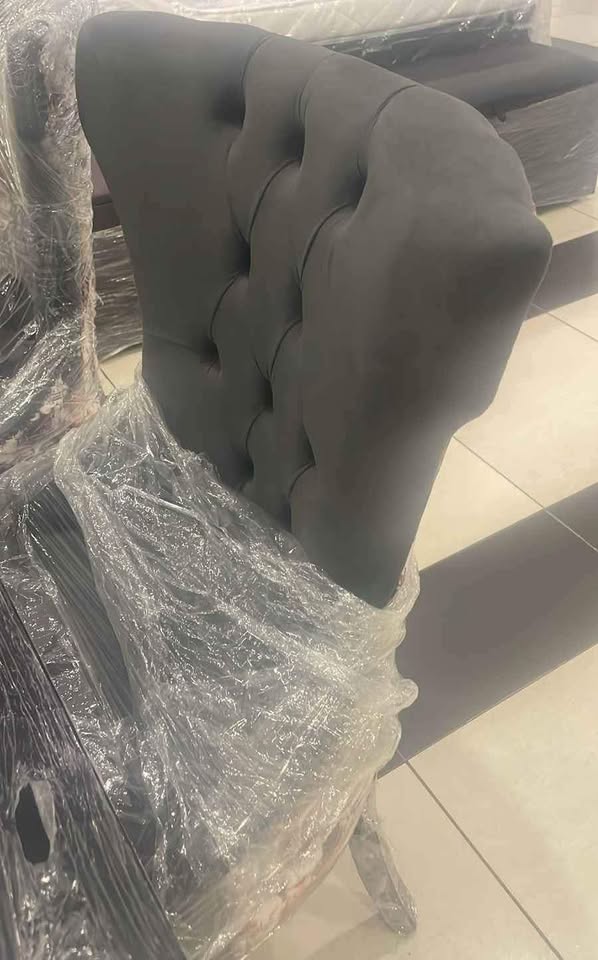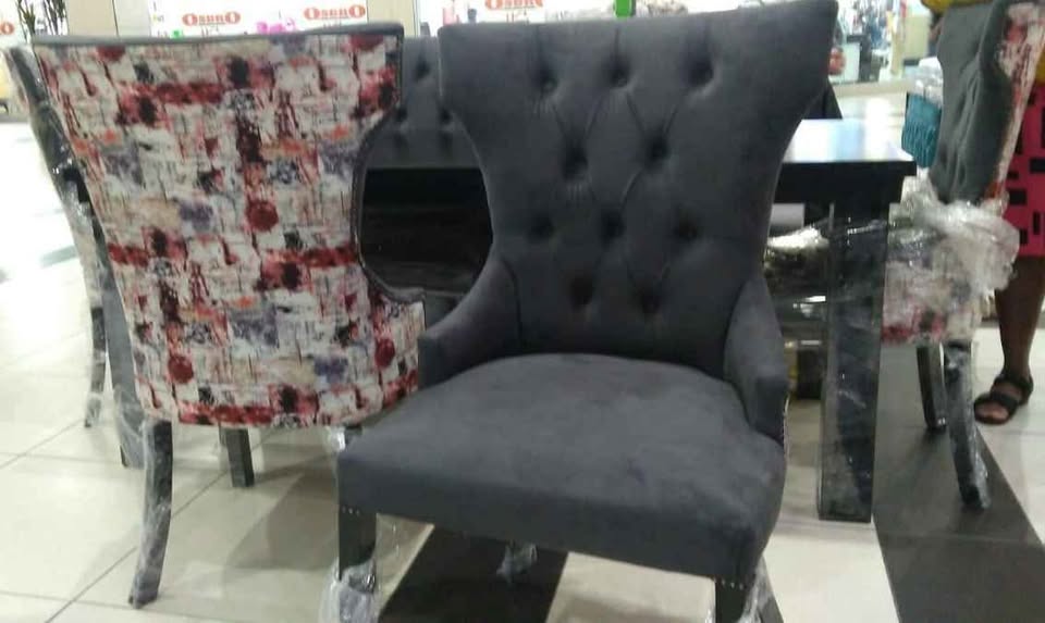 6 winged dining chairs. All have matching buttons and are covered in grey velvet material with a patterned back . There are studs on the back of the chairs.