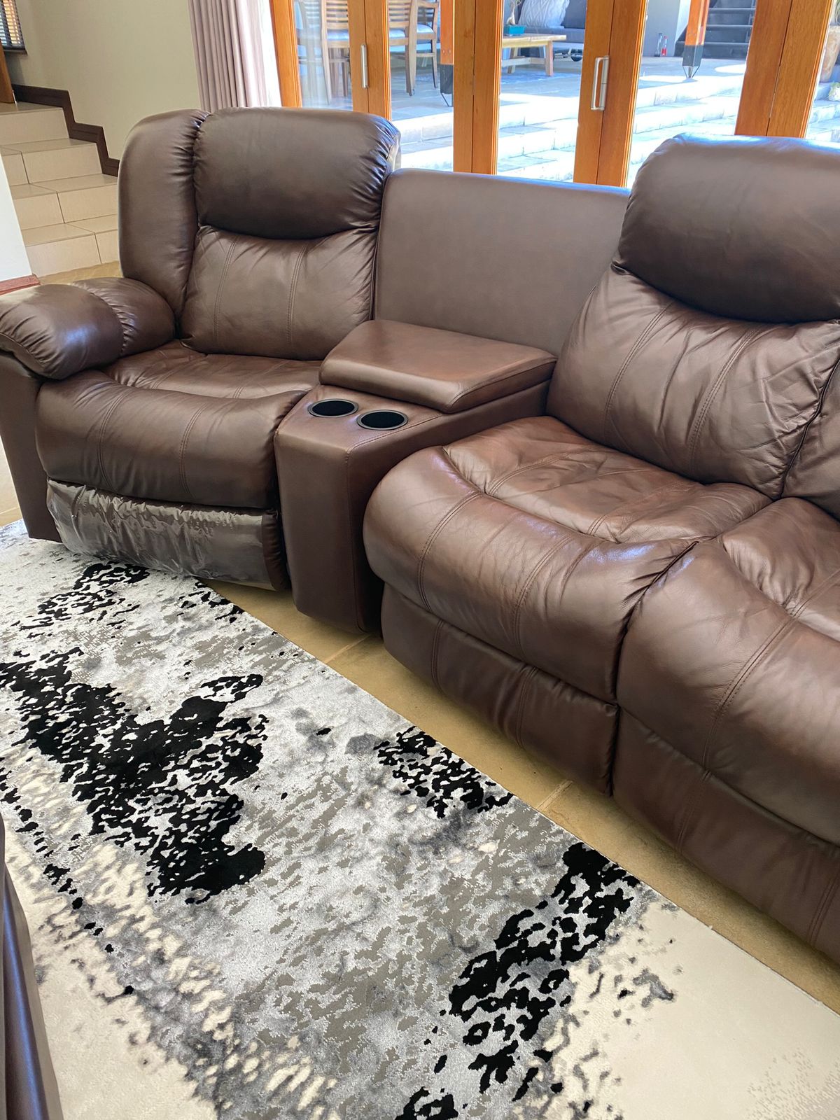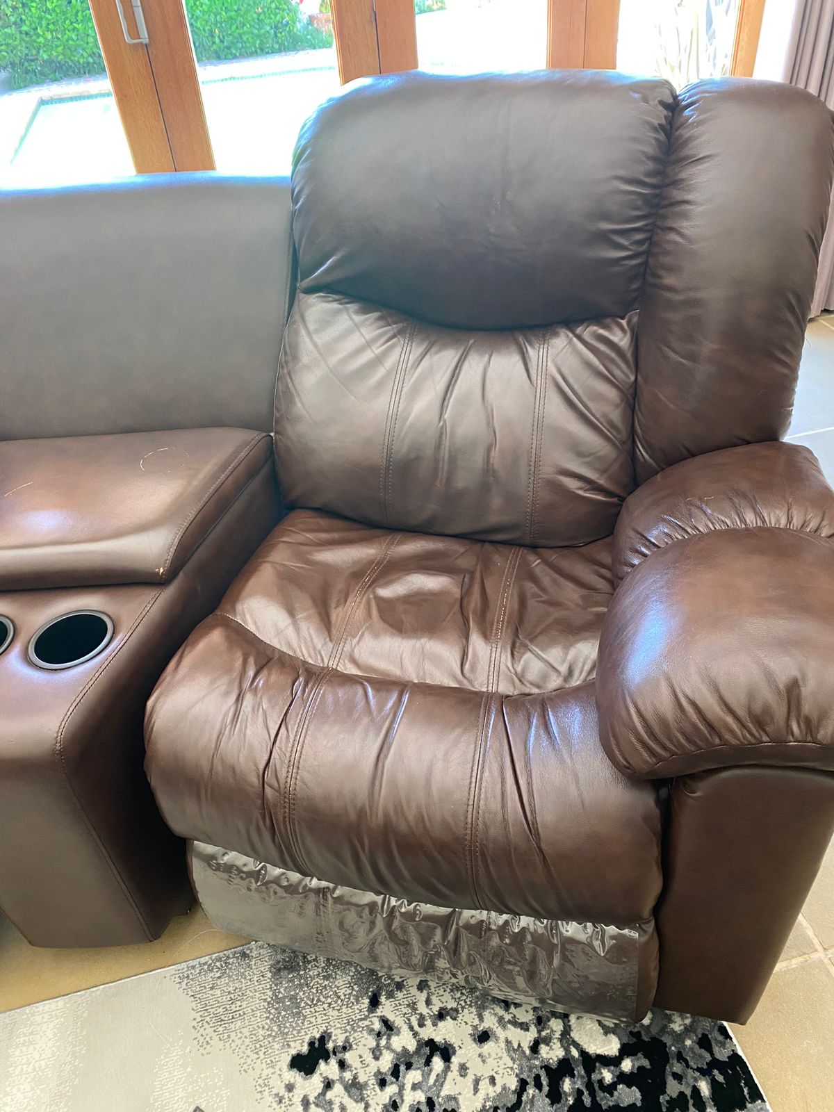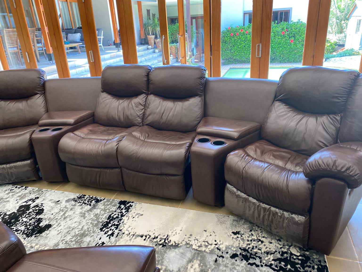 Leather lounge set with recliners. Two Recliners , Two seater with foot rest and storage boxes. The set has cup holers and storage for remote controls etc. A real good set for the TV / lounge area. Full hide genuine leather . All in very good condition. This set cost me R29k and i am selling it for half the retail price. Cash on collection from Midrand. no deliveries