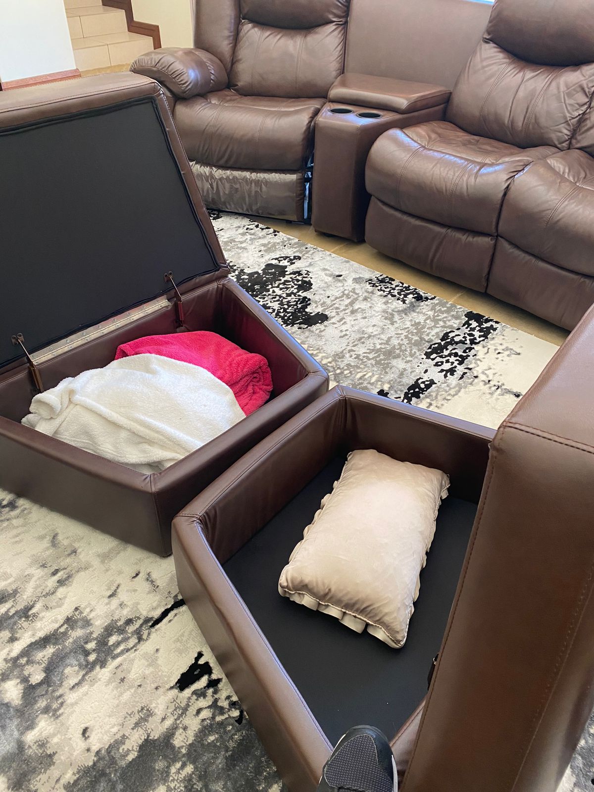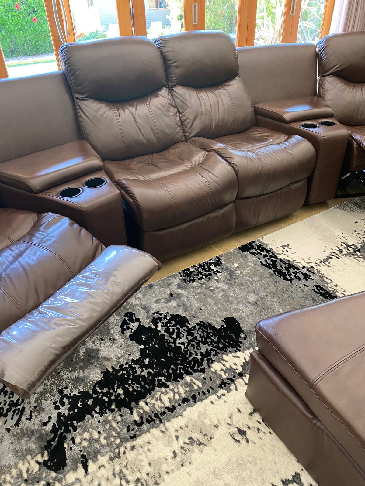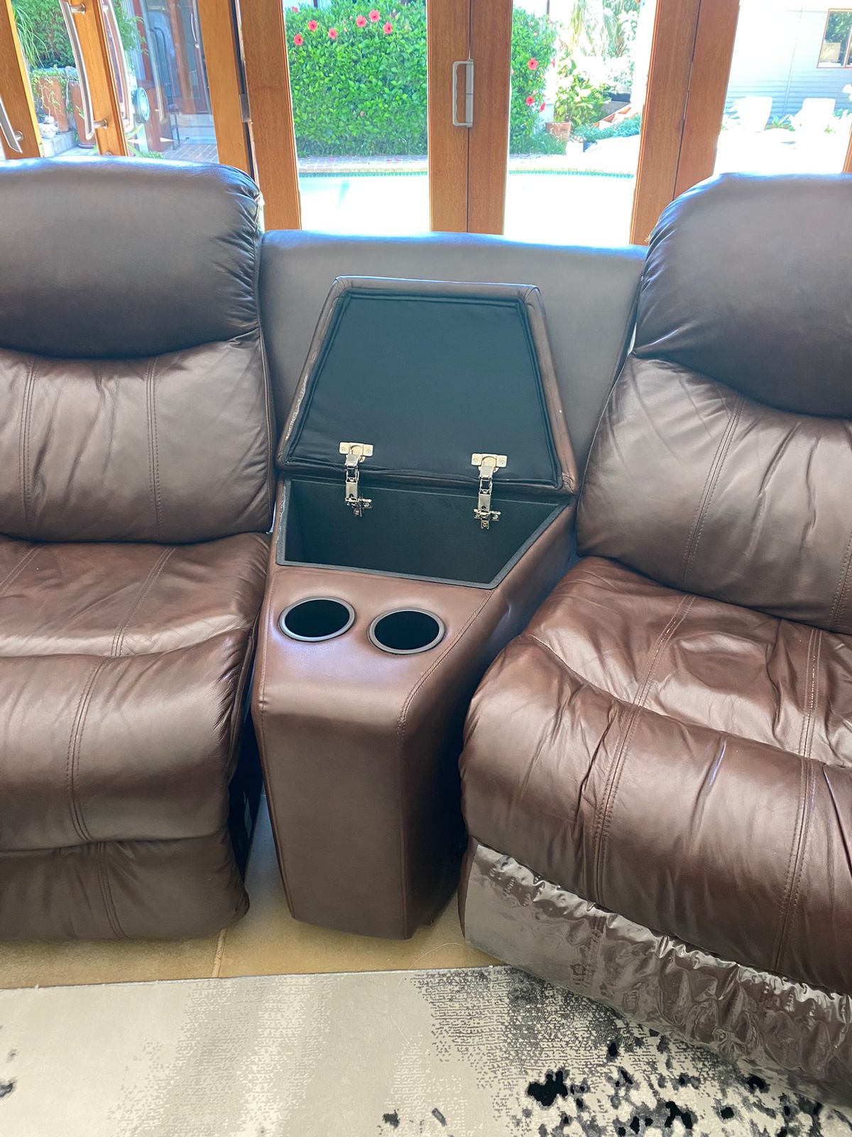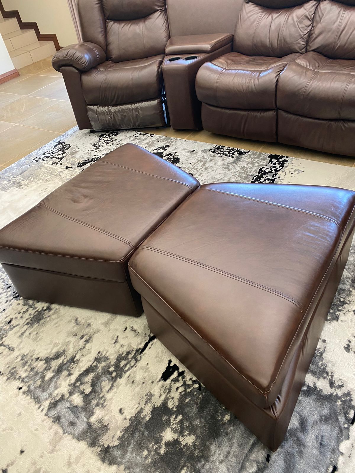 Leather lounge set with recliners. Two Recliners , Two seater with foot rest and storage boxes. The set has cup holers and storage for remote controls etc. A real good set for the TV / lounge area. Full hide genuine leather . All in very good condition. This set cost me R29k and i am selling it for half the retail price. Cash on collection from Midrand. no deliveries